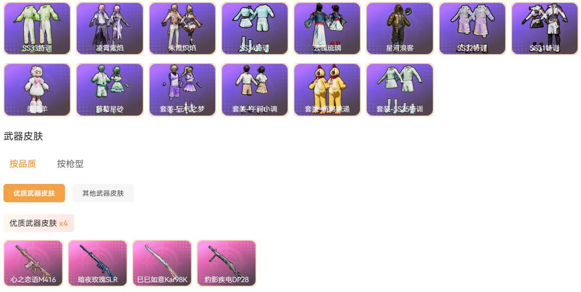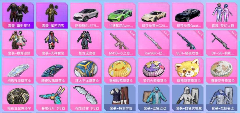007m:m1041 【苹果q、不可二次实名】【无】热力值:34021,4粉装,4粉呛,4载具,10粉色战备,66套装,96呛械,时装249,108装备,2滑翔尾翼,30降落伞;等级:lv.47 历史最高段位:超级王牌2星 当前段位:不朽.星钻ⅰ;王牌印记4次; 【热门套装】:暗影哥特,星河浪客; 【粉色套装】:梦幻火箭,蝶舞迷情,天禅智恒,复仇流浪者; 【粉色呛械】:m416-心之恋语 [6级],kar98k-巳巳如意 [2级],slr-暗夜玫瑰 [5级],dp-28-豹影疾电 [5级]; 【粉色载具】:路特斯eletre(花绽灰),兰博基尼aventadsvj(翡翠绿),玛莎拉蒂mc20(星石白),玛莎拉蒂quattropte(夜幕蓝); 【粉色滑翔尾翼】:春暖花开飞行器,相思残雪飞行器; 【粉色降落伞】:相思残雪降落伞,暗夜玫瑰降落伞,环太平洋降落伞,垂柳戏鸭降落伞,梦幻火箭降落伞,暖熊萌萌降落伞,春暖花开降落伞,暗夜鎏金降落伞; 【其他套装】:特训学院,蓝色运动,白色伏地魔,竞技名士,猛禽,长空猛禽,青羽突袭者,特殊使命,甜蜜告白,魅力单车,狂沙舞者,破晓战魂,幻世战舞者,alanwalker,破蛋小黄鸡,淡雅花蕊,玲珑飞花,鹤鸣,罗小黑,牛气冲天,欧布奥特曼,暖风夏荷,ss16特训,暴风机械师,时空追击者,暗夜魅影,暗夜傀儡,ss17特训,瑞龙福将,团圆交子,福星高照,虎虎生威吉莉,ss20特训,软羊咩咩,猎梦纪元,甜心亚梦,虚音幻奏,圣诞惊喜,ss21特训,萌趣咩咩,夏雨游龙,荷畔雨呱,ss23特训,青玉碎影,云魄琉璃,恋语绒绒,无面战甲,ss31特训,ss33特训,ss32特训,时希公主,玩偶服-美羊羊,元气之梦,ss34特训,朱霞炽焰,凌霄紫焰,薄荷星砂,ss35特训,午间小调,萌鸡速递; 【其他呛械】:g36c-乌木金纹,g36c-时空追击者,g36c-暗夜玫瑰,m416-蓝色火焰,m416-暗夜行者,m416-红色方程式,akm-生命誓言,akm-霓彩脉冲,akm-奇异狩猎者,akm-破晓战魂,akm-虎虎生威,akm-春暖花开,mk47-乌木金纹,arx-凌霄紫焰,groza-春暖花开,groza-无面战甲,famas-霓彩脉冲,famas-乌木金纹,m16a4-幻世战舞者,m16a4-甜心亚梦,scar-l-暗夜玫瑰,scar-l-炫彩节奏,scar-l-玉兔迎春,scar-l-黄金龙骨,m762-瑞龙福将,aug-耀粉歌者,q-相思残雪,蜜獾-垂柳戏鸭,蜜獾-娇憨猪猪,ac-val-天降萌叽,ac-val-甜心亚梦,莫辛纳甘-风迹短诗,莫辛纳甘-乌木金纹,m200-乌木金纹,kar98k-乌木金纹,kar98k-梦幻火箭,win94-瑞龙福将,win94-乌木金纹,awm-垂柳戏鸭,slr-娇憨猪猪,slr-霓彩脉冲,slr-彩虹符号,slr-葫芦兄弟,vss-粉色回忆,sks-心之恋语,sks-时空追击者,mk14-乌木金纹,mk14-薄荷星砂,mini14-梦幻火箭,mk12-风迹短诗,汤姆逊-环太平洋,vect-生命誓言,vect-暗夜玫瑰,ump45-春暖花开,ump45-时空追击者,aks-74u-乌木金纹,uzi-娇憨猪猪,uzi-炫彩节奏,js9-凌霄紫焰,s12k-娇憨猪猪,s12k-垂柳戏鸭,s12k-龙虾霸霸,s12k-瑞龙福将,s12k-幻世战舞者,s12k-暖熊萌萌,s1897-春暖花开,s1897-炫彩节奏,s1897-暗夜鎏金,dbs-时空追击者,dbs-风迹短诗,dbs-甜心亚梦,m249-无面战甲,mg3-瑞龙福将,mg3-幻世战舞者,pkm-啾咪啾咪,dp-28-甜心亚梦,dp-28-相思残雪,dp-28-彩虹符号,mg-36-凌霄紫焰,p92-凌霄紫焰,p1911-无面战甲,平底锅-瑞龙福将,平底锅-娇憨猪猪,平底锅-凌霄紫焰,平底锅-甜心亚梦,平底锅-黄金龙骨,平底锅-相思残雪,平底锅-时空追击者,撬棍-幻世战舞者,撬棍-环太平洋,爆炸猎弓-喜羊羊与灰太狼,破片手留单-拽到爆炸; 【其他降落伞】:无面战甲降落伞,ss20王牌降落伞,幻世战舞者降落伞,娇憨猪猪降落伞,紫菱降落伞,蛇蝎美人降落伞,ss31王牌降落伞,瑞龙福将降落伞,ss34王牌降落伞,闪电飞鸟降落伞,绚烂橙彩降落伞,普通降落伞,时空追击者降落伞,虎虎生威降落伞,甜心亚梦降落伞,凌霄紫焰降落伞,青羽降落伞,勇者同行降落伞,2023祥云降落伞,钢铁雄心降落伞,醒狮欢腾降落伞,ss17王牌降落伞; 【伙伴】:伙伴-四级包-嘟嘟,伙伴-盔仔,伙伴-呆呆,伙伴-啾啾,详情看图【实际信息请以最终验号结果为准】