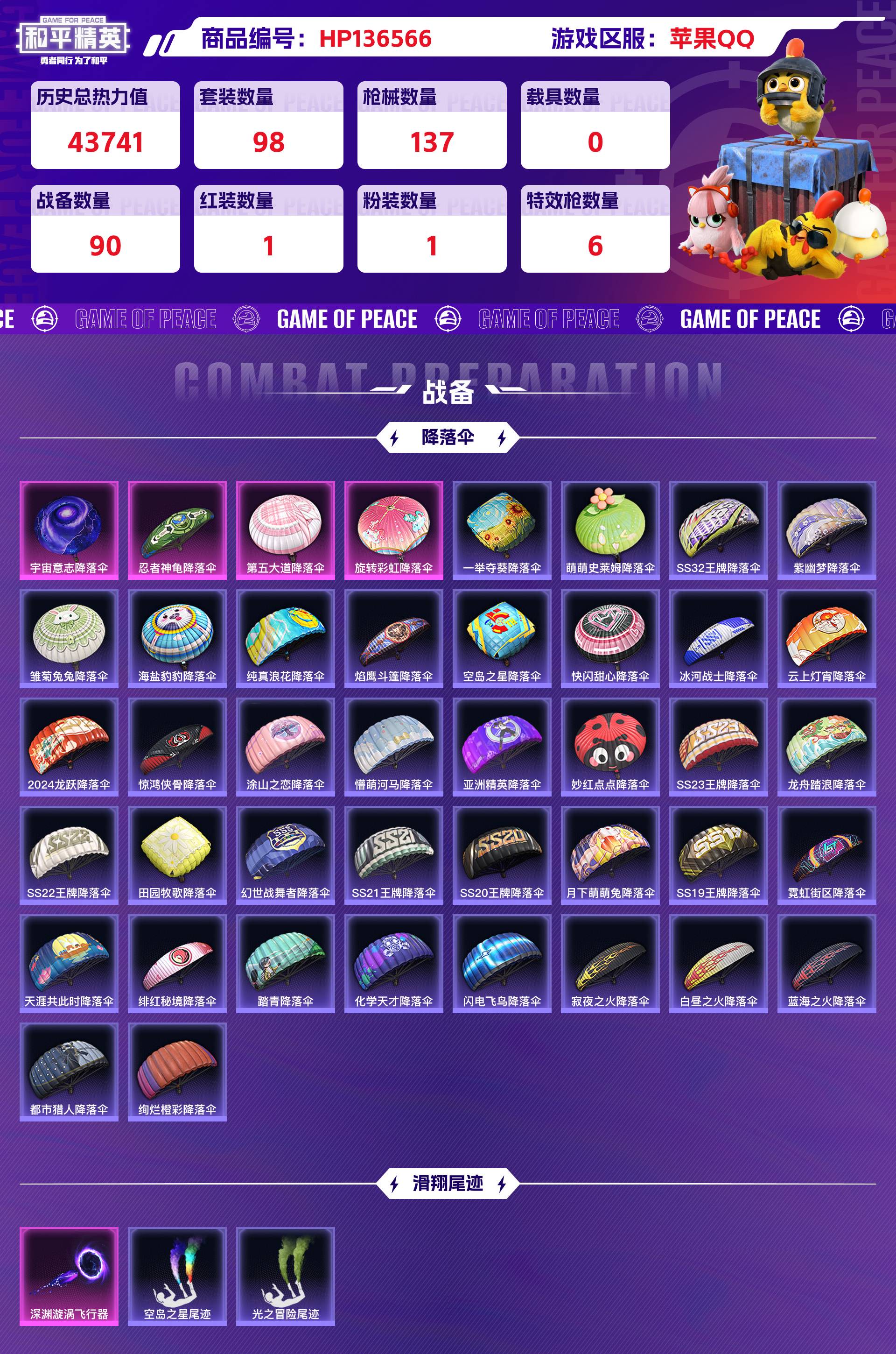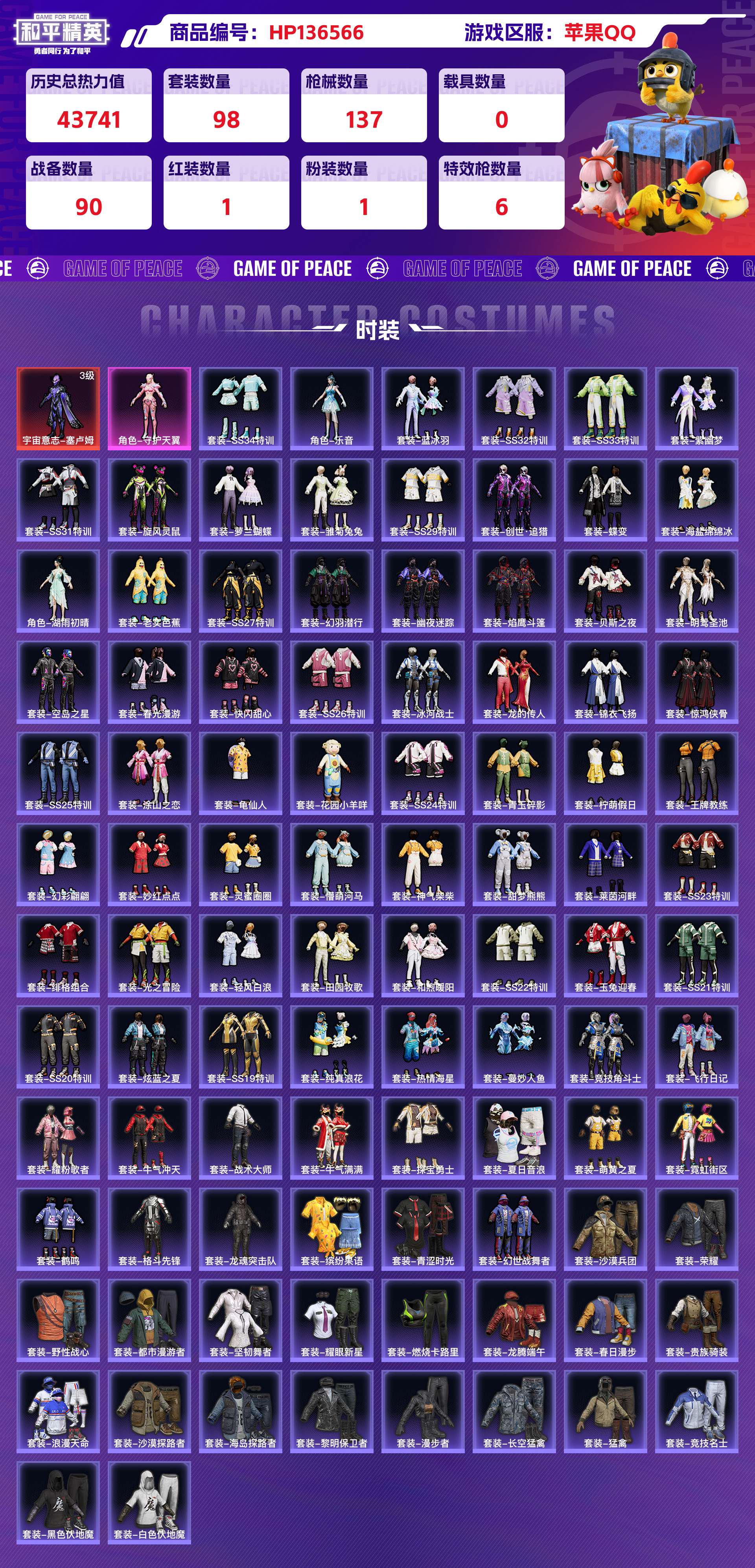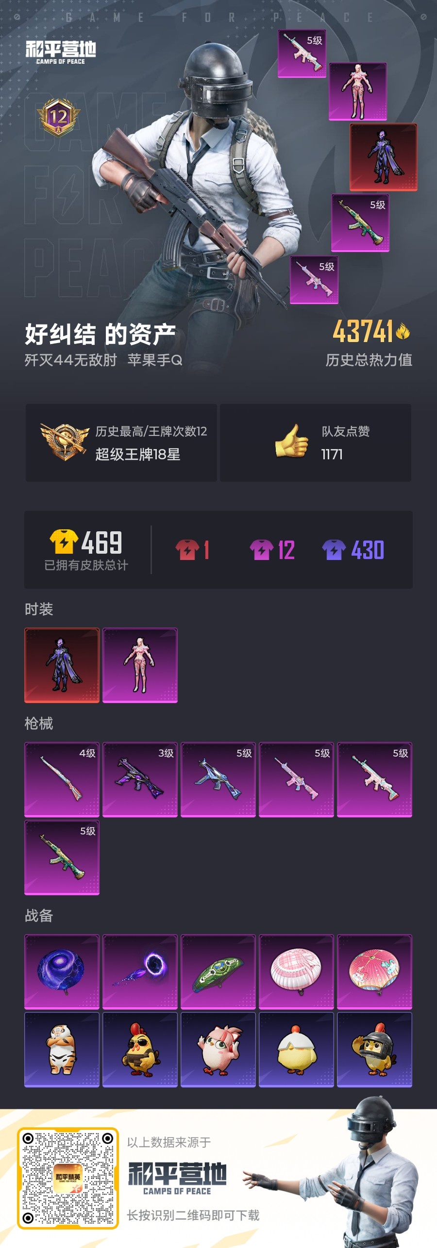 2247851-苹果qq 历史总热力值:43741 红装数量:1 粉装数量:1 特效呛数量:6 王牌印记:12 历史最高段位:超级王牌18星 套装数量:98 时装数量:365 呛械数量:137 战备数量:90 装备数量:144 时装:宇宙意志-塞卢姆3级角色-守护天翼套装-ss19特训套装-ss20特训套装-ss21特训套装-ss22特训套装-ss23特训套装-ss24特训