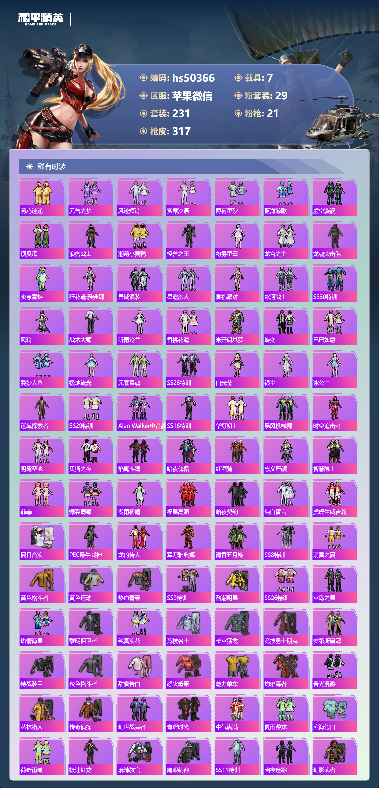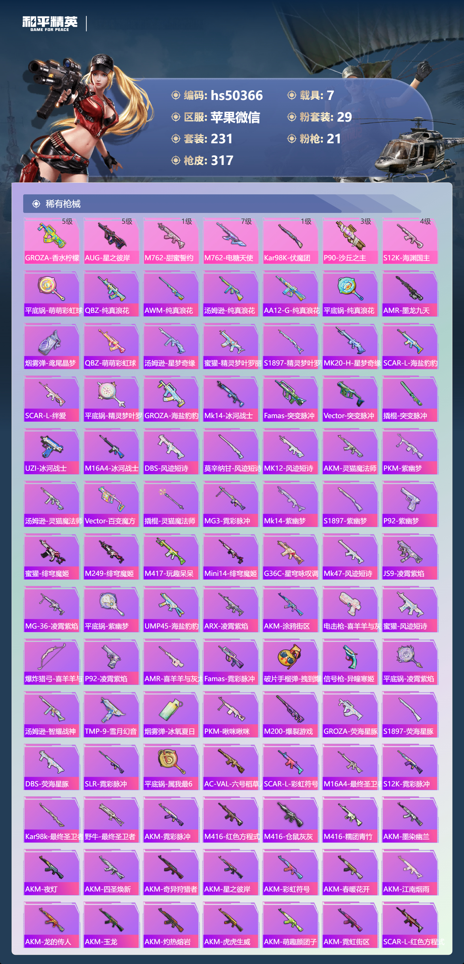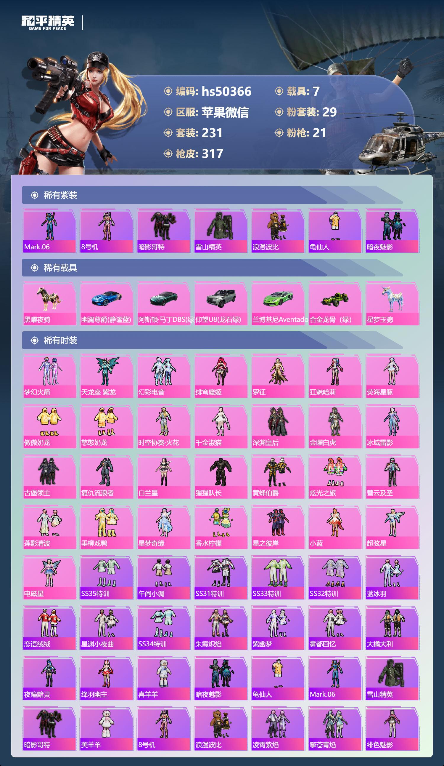 hs50366 苹果微信-18王牌印记-29粉装-21特效呛-7载具-热力值-231套装-317呛皮-3卓越印记-1传奇印记【29粉装】角色-荧海星豚角色-狂魅哈莉套装-炫光之旅套装-憨憨奶龙套装-黄蜂伯爵角色-冰域雷影套装-傲傲奶龙套装-香水柠檬角色-猩猩队长角色-复仇流浪者角色-超弦星套装-深渊皇后套装-古堡领主套装-垂柳戏鸭套装-莲影清波时空协奏·