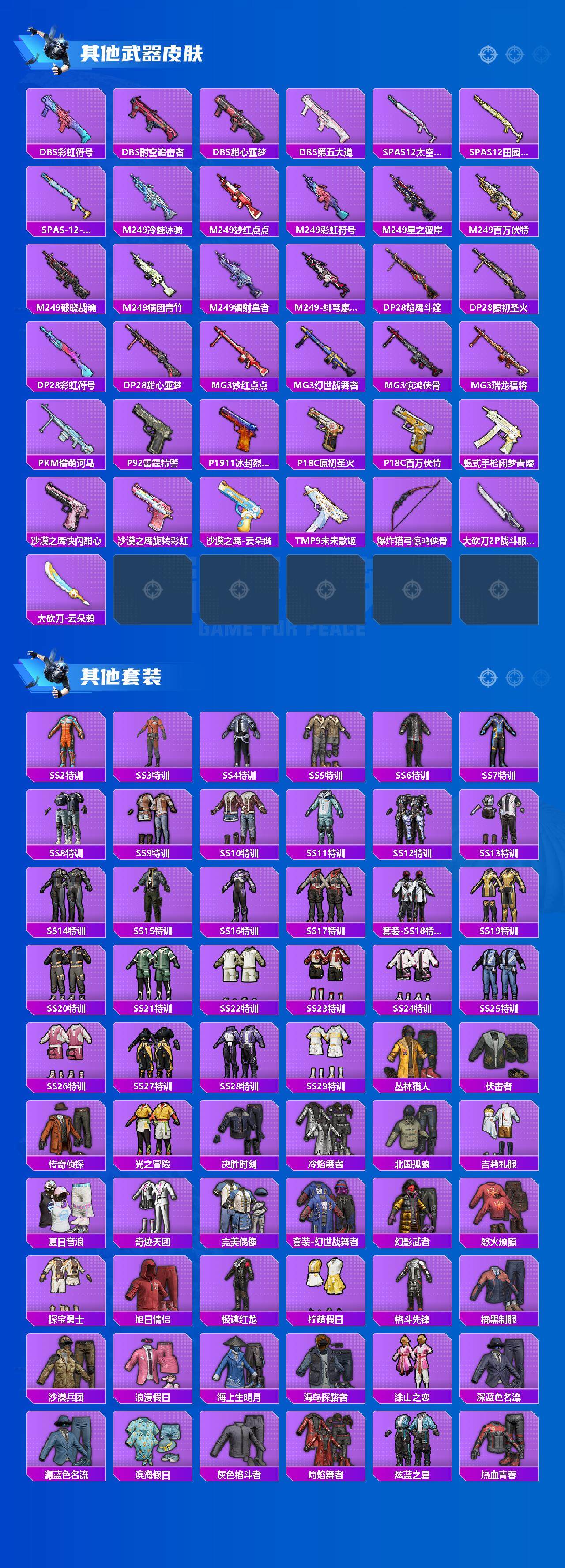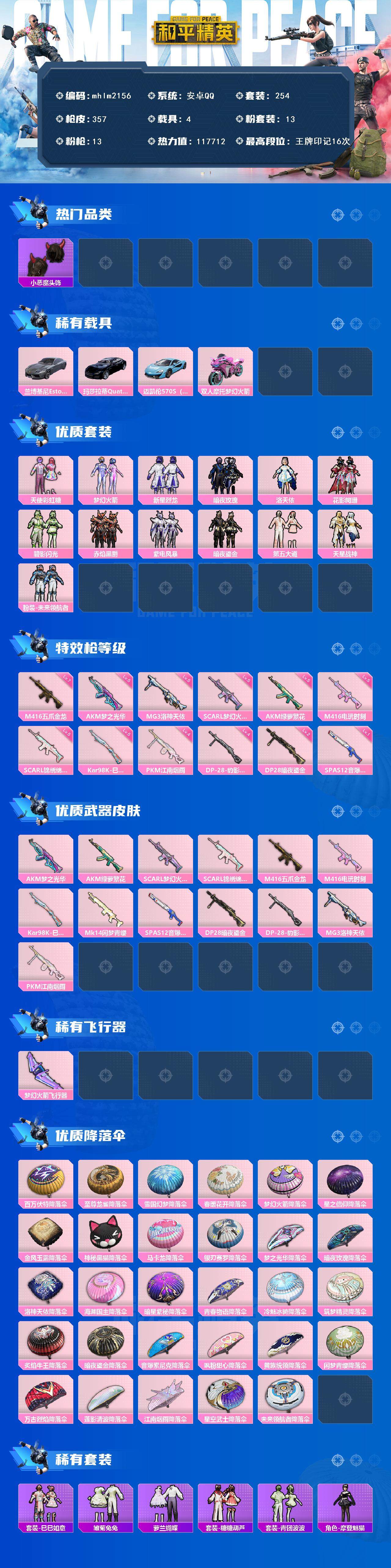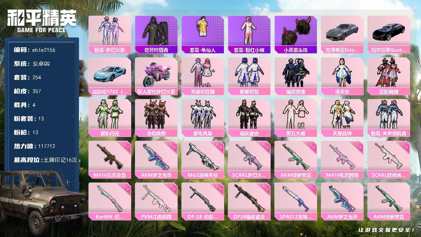 [13774105]【mhlm2156】安卓 手q-13粉装-13特效呛-4载具-1粉色飞行器-117712热力值-16王牌印记-254套装-357呛皮 【热门品类】:粉装-梦幻火箭,套装-奇异狩猎者,套装-龟仙人,套装-粉红小猪,小恶魔头饰 【粉色载具】:兰博基尼estoque(银翼灰),玛莎拉蒂quattropte(夜幕蓝),迈凯伦570s(天际蓝),双人摩托-梦幻火箭 【粉色套装】:粉装-天使彩虹糖,粉装-梦幻火箭,粉装-新星烈龙,粉装-暗夜玫瑰,角色-洛天依,粉装-花影阑珊,粉装-碧影闪光,粉装-赤焰黑爵,粉装-紫电风暴,粉装-暗夜鎏金,粉装-第五大道,粉装-天星战神,粉装-未来领航者 【粉色呛皮等级】:akm-梦之光华五级,akm-绿萝繁花五级,scar-l-梦幻火箭五级,scar-l-锦绣绵绵五级,m416-五爪金龙七级,m416-电玩时刻五级,kar98k-巳巳如意五级,spas-12-音爆索尼克一级,dp-28-暗夜鎏金二级,dp-28-豹影疾电四级,mg3-洛神天依五级,pkm-江南烟雨四级 【粉色呛皮】:akm-梦之光华,akm-绿萝繁花,scar-l-梦幻火箭,scar-l-锦绣绵绵,m416-五爪金龙,m416-电玩时刻,kar98k-巳巳如意,mk14-闲梦青缨,spas-12-音爆索尼克,dp-28-暗夜鎏金,dp-28-豹影疾电,mg3-洛神天依,pkm-江南烟雨 【粉色飞行器】:梦幻火箭飞行器 【粉色降落伞】:百万伏特降落伞,至尊龙雀降落伞,雪国幻梦降落伞,春暖花开降落伞,梦幻火箭降落伞,星之信仰降落伞,金风玉露降落伞,神秘黑猫降落伞,马卡龙降落伞,银刃赛罗降落伞,梦之光华降落伞,暗夜玫瑰降落伞,洛神天依降落伞,海渊国主降落伞,暗星紫秘降落伞,青春物语降落伞,冷魅冰骑降落伞,筑梦精灵降落伞,炙焰牛王降落伞,暗夜鎏金降落伞,音爆索尼克降落伞,飒粉甜心降落伞,黄族统领降落伞,闲梦青缨降落伞,万古烈焰降落伞,莲影清波降落伞,江南烟雨降落伞,星空武士降落伞,未来领航者降落伞 【稀有套装】:套装-龟仙人,套装-巳巳如意,套装-雏菊兔兔,套装-萝兰蝴蝶,套装-糖糖葫芦,套装-青团波波,角色-摩登魅猫,套装-燕燕于飞,套装-鱼渊荷华,套装-紫幽梦,套装-蓝冰羽,套装-云朵鹅,套装-雪绒豹,角色-绛羽幽主,角色-绯色