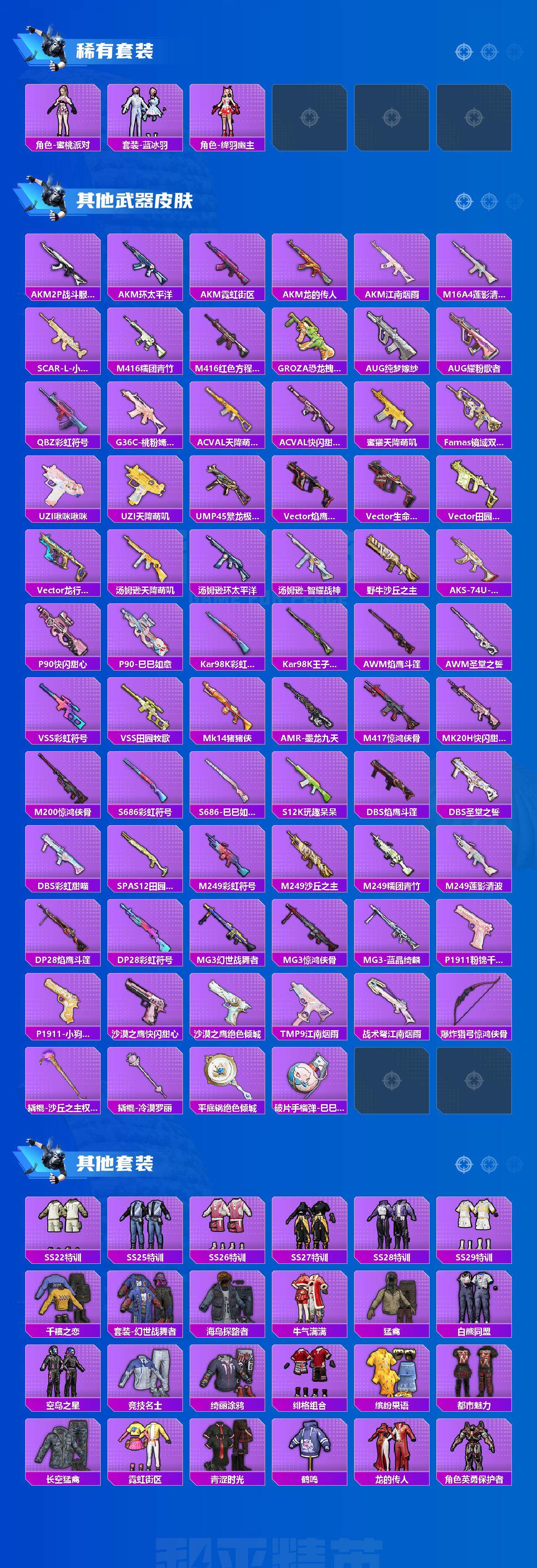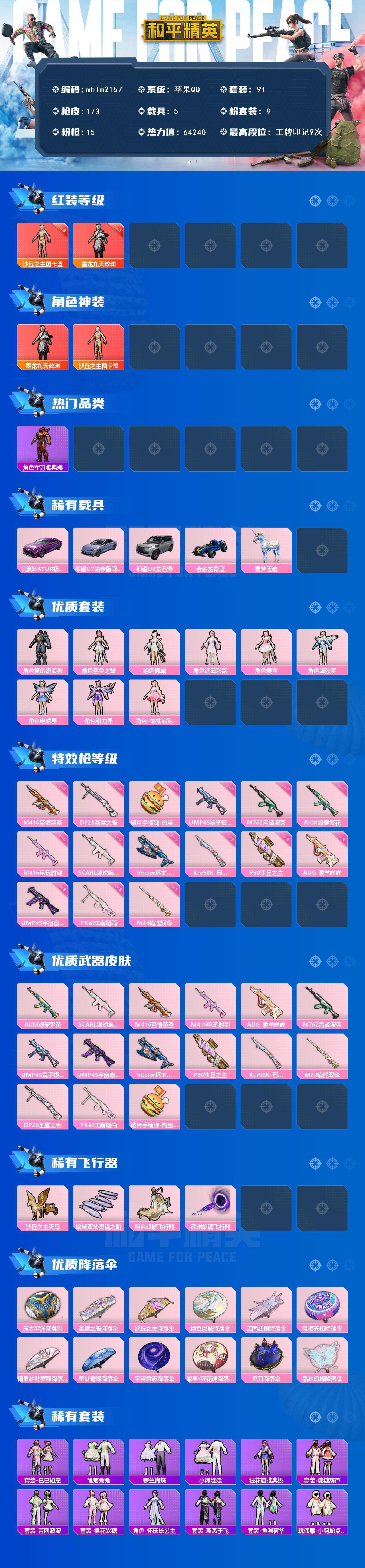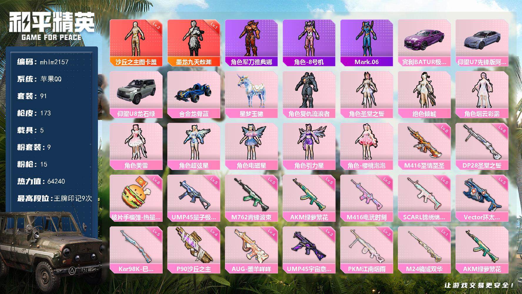 [13774195]【mhlm2157】苹果 手q-2神装-9粉装-15特效呛-5载具-5粉色飞行器-64240热力值-9王牌印记-91套装-173呛皮 【红色神装等级】:墨龙九天-敖渊一级,沙丘之主-图卡盟三级 【红色角色神装】:墨龙九天-敖渊,沙丘之主-图卡盟 【热门品类】:角色-军刀雅典娜,角色-8号机,角色-mark.06 【粉色载具】:宾利batur(极速紫),仰望u7(阿盖尔紫),仰望u8(龙石绿),合金龙骨(蓝),星梦玉骢 【粉色套装】:角色-复仇流浪者,角色-圣堂之誓,角色-绝色倾城,角色-烟云彩露,角色-美雪,角色-超弦星,角色-电磁星,角色-引力星,角色-樱桃泡泡 【粉色呛皮等级】:akm-绿萝繁花五级,scar-l-锦绣绵绵五级,m416-至情至圣八级,m416-电玩时刻五级,aug-暖羊咩咩四级,m762-青锋波束五级,ump45-量子极限五级,ump45-宇宙意志三级,vect-环太平洋五级,p90-沙丘之主四级,kar98k-巳巳如意五级,m24-镜域双华一级,dp-28-圣堂之誓六级,pkm-江南烟雨三级,破片手留单-热量炸弹六级 【粉色呛皮】:akm-绿萝繁花,scar-l-锦绣绵绵,m416-至情至圣,m416-电玩时刻,aug-暖羊咩咩,m762-青锋波束,ump45-量子极限,ump45-宇宙意志,vect-环太平洋,p90-沙丘之主,kar98k-巳巳如意,m24-镜域双华,dp-28-圣堂之誓,pkm-江南烟雨,破片手留单-热量炸弹 【粉色飞行器】:沙丘之主天马,镜域双华-灵镜之阶,绝色倾城飞行器,深渊漩涡飞行器 【粉色降落伞】:环太平洋降落伞,圣堂之誓降落伞,沙丘之主降落伞,绝色倾城降落伞,江南烟雨降落伞,电糖天使降落伞,精灵梦叶罗丽降落伞,星梦奇缘降落伞,宇宙意志降落伞,拳皇·狂花道降落伞,鬼刀降落伞,晶梦幻蝶降落伞 【稀有套装】:套装-巳巳如意,套装-雏菊兔兔,套装-萝兰蝴蝶,套装-小熊娃娃,角色-狂花道·雅典娜,套装-糖糖葫芦,套装-青团波波,套装-棉花软糖,角色-怀庆长公主,套装-燕燕于飞,套装-鱼渊荷华,玩偶服-小狗蛇点点,角色-蜜桃派对,套装-蓝冰羽,角色-绛羽幽主 【稀有呛皮】:akm-2p战斗服款,akm-江南烟雨,akm-环太平洋,akm-霓虹街区