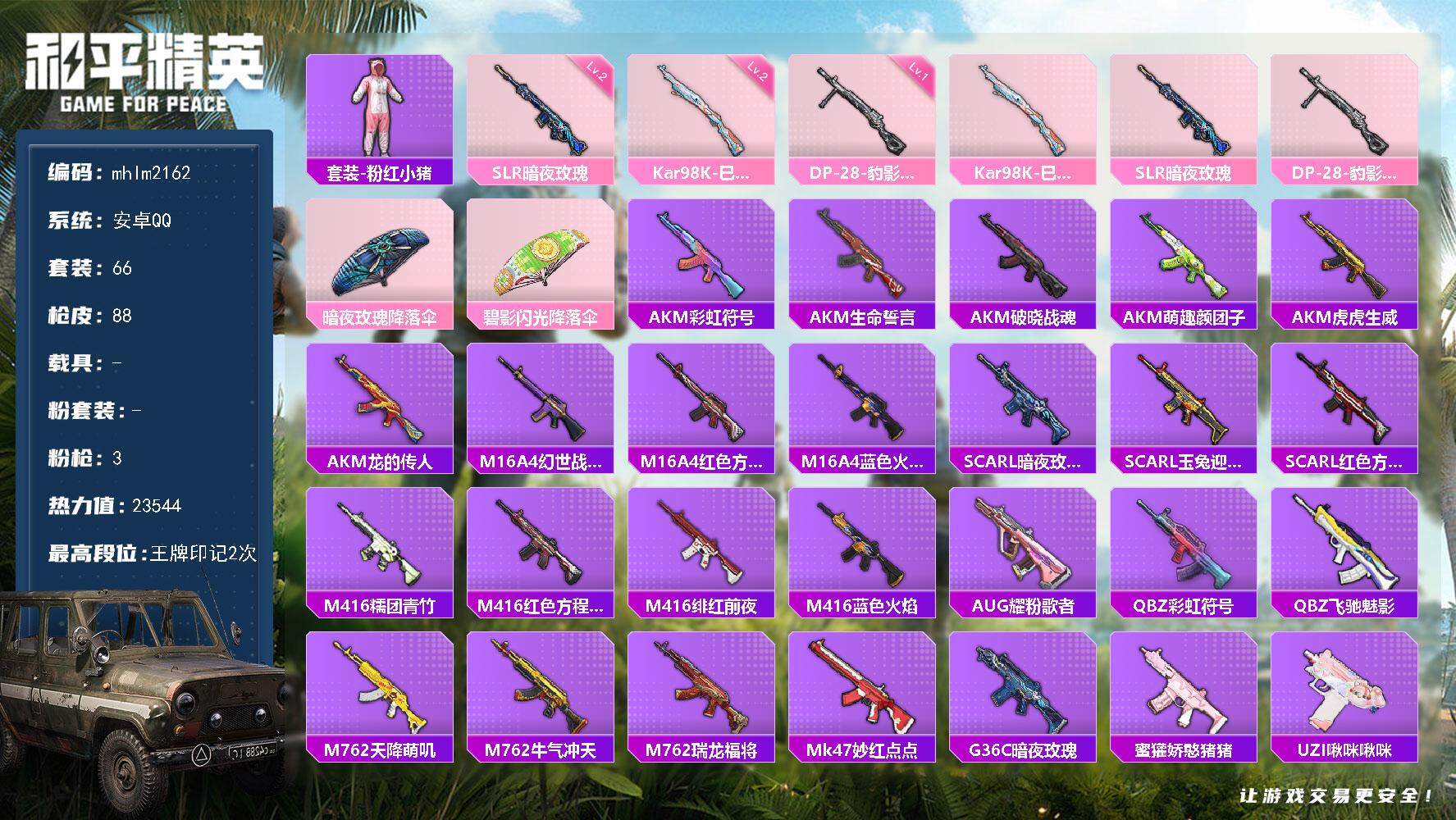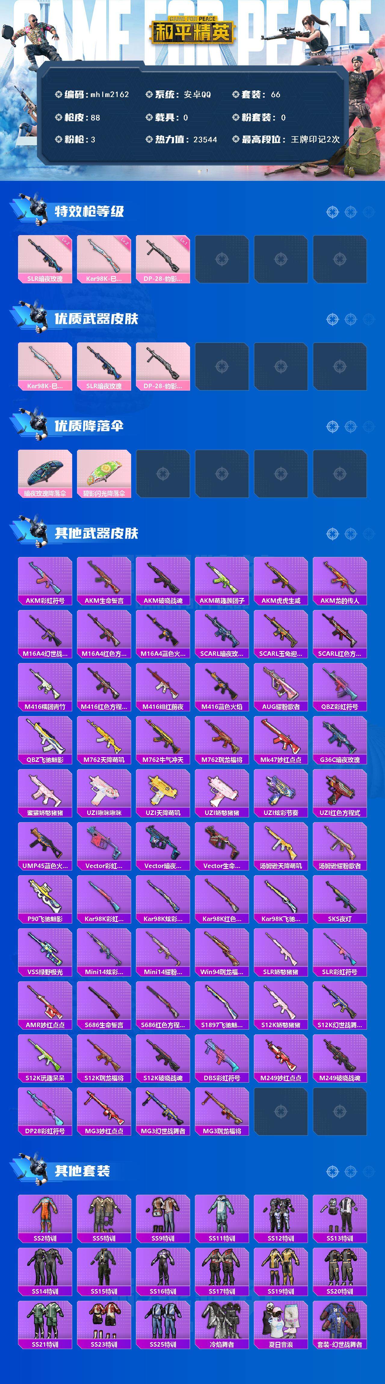 [13774780]【mhlm2162】安卓 手q-0粉装-3特效呛-0载具-0粉色飞行器-23544热力值-2王牌印记-66套装-88呛皮 【热门品类】:套装-粉红小猪 【粉色呛皮等级】:kar98k-巳巳如意二级,slr-暗夜玫瑰二级,dp-28-豹影疾电一级 【粉色呛皮】:kar98k-巳巳如意,slr-暗夜玫瑰,dp-28-豹影疾电 【粉色降落伞】:暗夜玫瑰降落伞,碧影闪光降落伞 【稀有呛皮】:akm-彩虹符号,akm-生命誓言,akm-破晓战魂,akm-萌趣颜团子,akm-虎虎生威,akm-龙的传人,m16a4-幻世战舞者,m16a4-红色方程式,m16a4-蓝色火焰,scar-l-暗夜玫瑰,scar-l-玉兔迎春,scar-l-红色方程式,m416-糯团青竹,m416-红色方程式,m416-绯红前夜,m416-蓝色火焰,aug-耀粉歌者,q-彩虹符号,q-飞驰魅影,m762-天降萌叽,m762-牛气冲天,m762-瑞龙福将,mk47-妙红点点,g36c-暗夜玫瑰,蜜獾-娇憨猪猪,uzi-啾咪啾咪,uzi-天降萌叽,uzi-娇憨猪猪,uzi-炫彩节奏,uzi-红色方程式,ump45-蓝色火焰,vect-彩虹符号,vect-暗夜玫瑰,vect-生命誓言,汤姆逊-天降萌叽,汤姆逊-耀粉歌者,p90-飞驰魅影,kar98k-彩虹符号,kar98k-炫彩节奏,kar98k-红色方程式,kar98k-飞驰魅影,sks-夜灯,vss-绿野极光,mini14-炫彩节奏,mini14-耀粉歌者,win94-瑞龙福将,slr-娇憨猪猪,slr-彩虹符号,amr-妙红点点,s686-生命誓言,s686-红色方程式,s1897-飞驰魅影,s12k-玩趣呆呆,s12k-瑞龙福将,s12k-破晓战魂,s12k-娇憨猪猪,s12k-幻世战舞者,dbs-彩虹符号,m249-妙红点点,m249-破晓战魂,dp-28-彩虹符号,mg3-妙红点点,mg3-幻世战舞者,mg3-瑞龙福将 【其他套装】:套装-ss2特训,套装-ss5特训,套装-ss9特训,套装-ss11特训,套装-ss12特训,套装-ss13特训,套装-ss14特训,套装-ss15特训,套装-ss16特训,套装-ss17特训,套装-ss19特训,套装-ss20特训,套装-ss21特训,套装-ss23特训,套装-ss