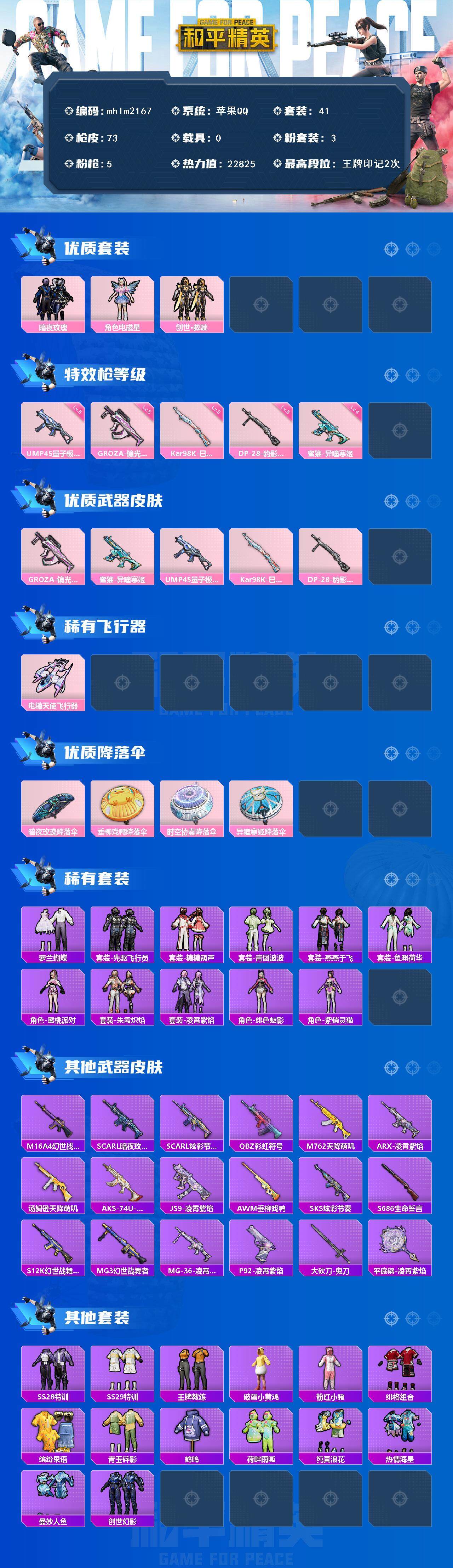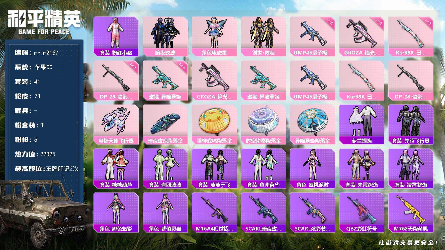 [13775310]【mhlm2167】苹果 手q-3粉装-5特效呛-0载具-2粉色飞行器-22825热力值-2王牌印记-41套装-73呛皮 【热门品类】:套装-粉红小猪 【粉色套装】:粉装-暗夜玫瑰,角色-电磁星,套装-创世·救赎 【粉色呛皮等级】:groza-镜光银凌五级,蜜獾-异瞳寒姬四级,ump45-量子极限五级,kar98k-巳巳如意五级,dp-28-豹影疾电五级 【粉色呛皮】:groza-镜光银凌,蜜獾-异瞳寒姬,ump45-量子极限,kar98k-巳巳如意,dp-28-豹影疾电 【粉色飞行器】:电糖天使飞行器 【粉色降落伞】:暗夜玫瑰降落伞,垂柳戏鸭降落伞,时空协奏降落伞,异瞳寒姬降落伞 【稀有套装】:套装-萝兰蝴蝶,套装-先驱飞行员,套装-糖糖葫芦,套装-青团波波,套装-燕燕于飞,套装-鱼渊荷华,角色-蜜桃派对,套装-朱霞炽焰,套装-凌霄紫焰,角色-绯色魅影,角色-紫俏灵猫 【稀有呛皮】:m16a4-幻世战舞者,scar-l-暗夜玫瑰,scar-l-炫彩节奏,q-彩虹符号,m762-天降萌叽,arx-凌霄紫焰,汤姆逊-天降萌叽,aks-74u-鬼刀,js9-凌霄紫焰,awm-垂柳戏鸭,sks-炫彩节奏,s686-生命誓言,s12k-幻世战舞者,mg3-幻世战舞者,mg-36-凌霄紫焰,p92-凌霄紫焰,大砍刀-鬼刀,平底锅-凌霄紫焰 【其他套装】:套装-ss28特训,套装-ss29特训,套装-王牌教练,套装-破蛋小黄鸡,套装-粉红小猪,套装-绯格组合,套装-缤纷果语,套装-青玉碎影,套装-鹤鸣,套装-荷畔雨呱,套装-纯真浪花,套装-热情海星,套装-曼妙人鱼,套装-创世·幻影 【营地id】:724216647