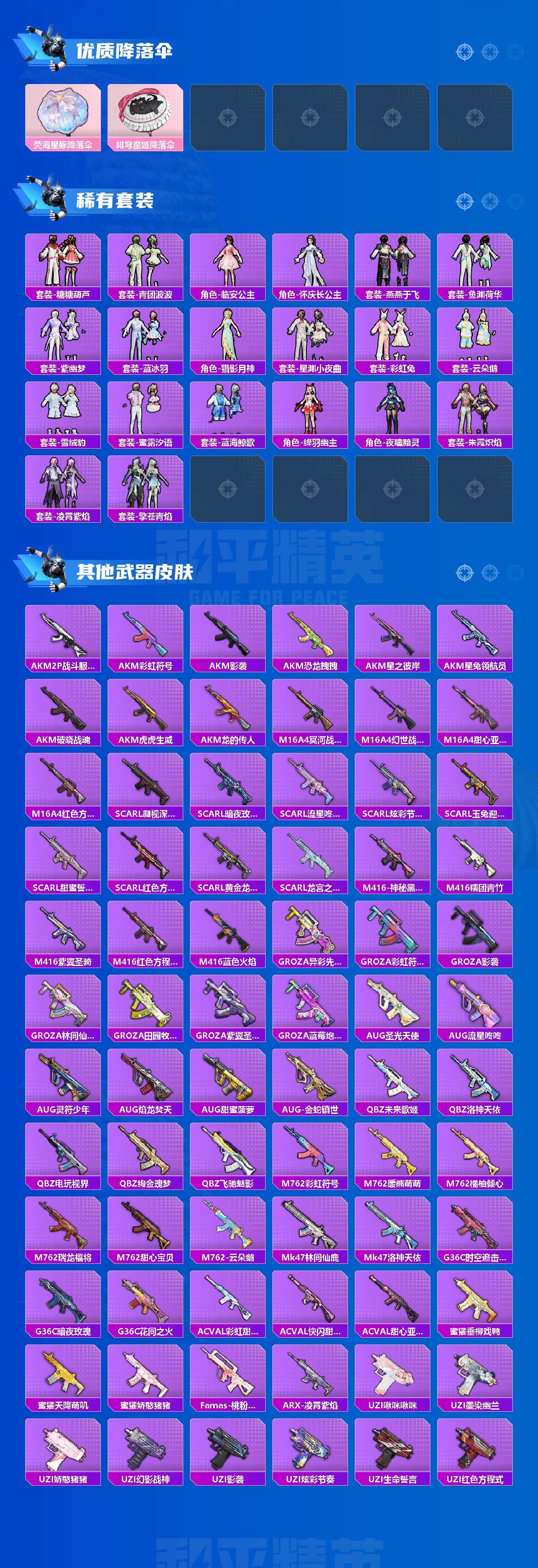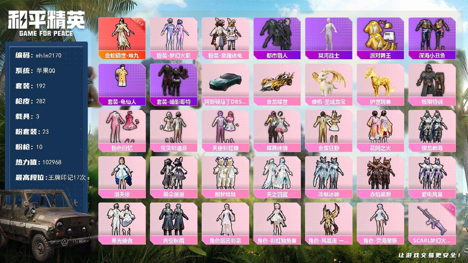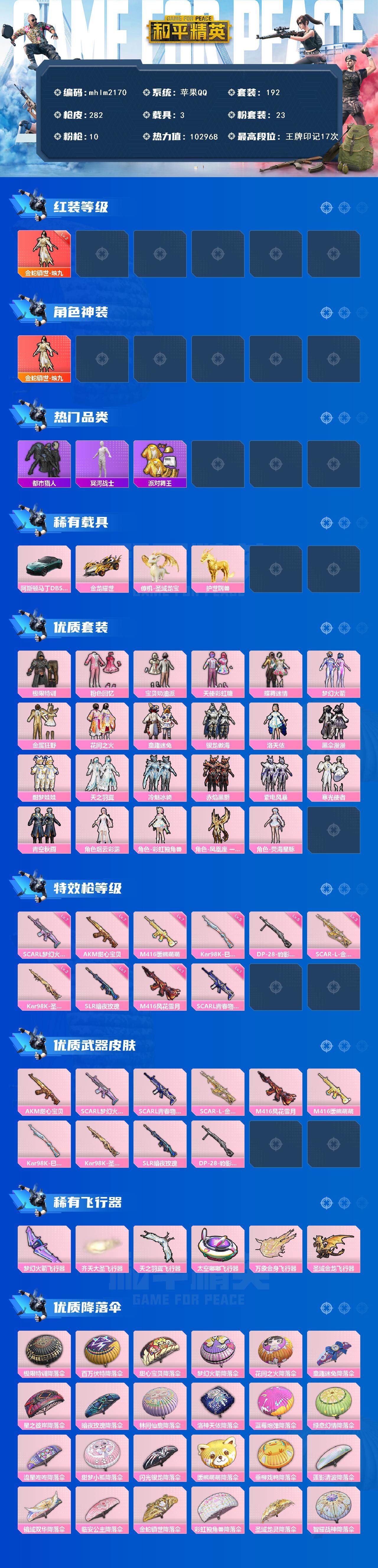 [13775778]【mhlm2170】苹果 手q-1神装-23粉装-10特效呛-3载具-6粉色飞行器-102968热力值-17王牌印记-192套装-282呛皮 【红色神装等级】:金蛇镇世-烛九二级 【红色角色神装】:金蛇镇世-烛九 【热门品类】:粉装-梦幻火箭,粉装-童趣迷兔,套装-都市猎人,套装-冥河战士,套装-派对舞王,套装-深海小丑鱼,套装-龟仙人,套装-暗影哥特 【粉色载具】:阿斯顿马丁dbs(绿),金龙耀世,僚机-圣域龙宝,护世瑞兽 【粉色套装】:粉装-极限特训,粉装-粉色回忆,粉装-宝贝奶油派,粉装-天使彩虹糖,粉装-蝶舞迷情,粉装-梦幻火箭,粉装-金属狂野,粉装-花间之火,粉装-童趣迷兔,粉装-银龙傲海,角色-洛天依,粉装-黑伞漫漫,粉装-酣梦娃娃,粉装-天之羽翼,粉装-冷魅冰骑,粉装-赤焰黑爵,粉装-紫电风暴,粉装-寒光使者,粉装-青空秋雨,角色-烟云彩露,角色-彩虹独角兽,角色-凤凰座 一辉,角色-荧海星豚 【粉色呛皮等级】:akm-甜心宝贝七级,scar-l-梦幻火箭七级,scar-l-青春物语一级,scar-l-金蛇镇世三级,m416-风花雪月一级,m416-暖熊萌萌七级,kar98k-巳巳如意五级,kar98k-圣域龙灵三级,slr-暗夜玫瑰一级,dp-28-豹影疾电五级 【粉色呛皮】:akm-甜心宝贝,scar-l-梦幻火箭,scar-l-青春物语,scar-l-金蛇镇世,m416-风花雪月,m416-暖熊萌萌,kar98k-巳巳如意,kar98k-圣域龙灵,slr-暗夜玫瑰,dp-28-豹影疾电 【粉色飞行器】:梦幻火箭飞行器,齐天大圣飞行器,天之羽翼飞行器,太空嘟嘟飞行器,万象金身飞行器,圣域金龙飞行器 【粉色降落伞】:极限特训降落伞,百万伏特降落伞,甜心宝贝降落伞,梦幻火箭降落伞,花间之火降落伞,童趣迷兔降落伞,星之彼岸降落伞,暗夜玫瑰降落伞,林间仙鹿降落伞,洛神天依降落伞,蓝莓炮弹降落伞,绿意幻情降落伞,流星咚咚降落伞,甜梦小狐降落伞,闪光银龙降落伞,暖熊萌萌降落伞,垂柳戏鸭降落伞,莲影清波降落伞,镜域双华降落伞,临安公主降落伞,金蛇镇世降落伞,彩虹独角兽降落伞,圣域龙灵降落伞,智耀战神降落伞,荧海星豚降落伞,绯穹魔姬降落伞 【稀有套装】:套装-龟仙人,套装-糖糖葫芦,套装-青团波波,角色-临安公主,角色