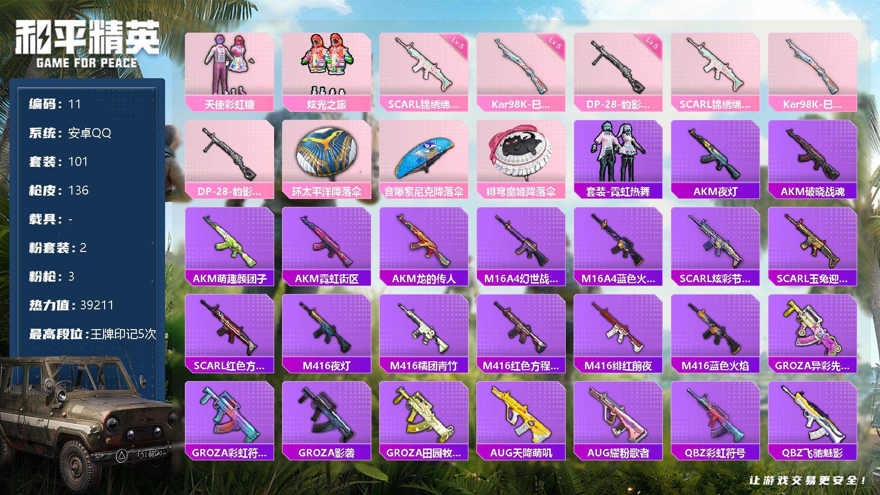 [13783850]【编号83769 可秒换绑】【店长推荐精品号!】【商品标题:安卓 手q-2粉装-3特效呛-0载具-39211热力值-5印记-101套装-136呛皮 超值小号入手打素材练呛超值】 【特效呛等级】:scar-l-锦绣绵绵五级,kar98k-巳巳如意五级,dp-28-豹影疾电五级 【优质套装】:粉装-天使彩虹糖,粉装-炫光之旅 【稀有套装】:套装-龟仙人,套装-霓虹热舞 【优质武器皮肤】:scar-l-锦绣绵绵,kar98k-巳巳如意,dp-28-豹影疾电 【稀有武器皮肤】:akm-夜灯,akm-破晓战魂,akm-萌趣颜团子,akm-霓虹街区,akm-龙的传人,m16a4-幻世战舞者,m16a4-蓝色火焰,scar-l-炫彩节奏,scar-l-玉兔迎春,scar-l-红色方程式,m416-夜灯,m416-糯团青竹,m416-红色方程式,m416-绯红前夜,m416-蓝色火焰,groza-异彩先驱,groza-彩虹符号,groza-影袭,groza-田园牧歌,aug-天降萌叽,aug-耀粉歌者,q-彩虹符号,q-飞驰魅影,m762-天降萌叽,m762-奇异狩猎者,m762-牛气冲天,mk47-妙红点点,mk47-炫光之旅,ac-val-天降萌叽,蜜獾-垂柳戏鸭,蜜獾-娇憨猪猪,uzi-啾咪啾咪,uzi-天降萌叽,uzi-娇憨猪猪,uzi-红色方程式,ump45-涂山之恋,ump45-生命誓言,ump45-蓝色火焰,vect-彩虹符号,vect-生命誓言,vect-田园牧歌,汤姆逊-天降萌叽,汤姆逊-异彩先驱,汤姆逊-环太平洋,汤姆逊-樱桃泡泡,mp5k-异彩先驱,p90-飞驰魅影,p90-巳巳如意,kar98k-彩虹符号,kar98k-炫彩节奏,kar98k-飞驰魅影,m24-影袭,m24-奇异狩猎者,sks-炫彩节奏,vss-彩虹符号,vss-田园牧歌,mini14-异彩先驱,mini14-涂山之恋,mini14-炫彩节奏,mini14-耀粉歌者,slr-娇憨猪猪,slr-彩虹符号,amr-妙红点点,m417-惊鸿侠骨,m200-惊鸿侠骨,s686-彩虹符号,s686-生命誓言,s686-红色方程式,s1897-炫彩节奏,s1897-碧影闪光,s1897-飞驰魅影,s12k-玩趣呆呆,s12k-破晓战魂,s12k-垂柳戏鸭,s12k-娇