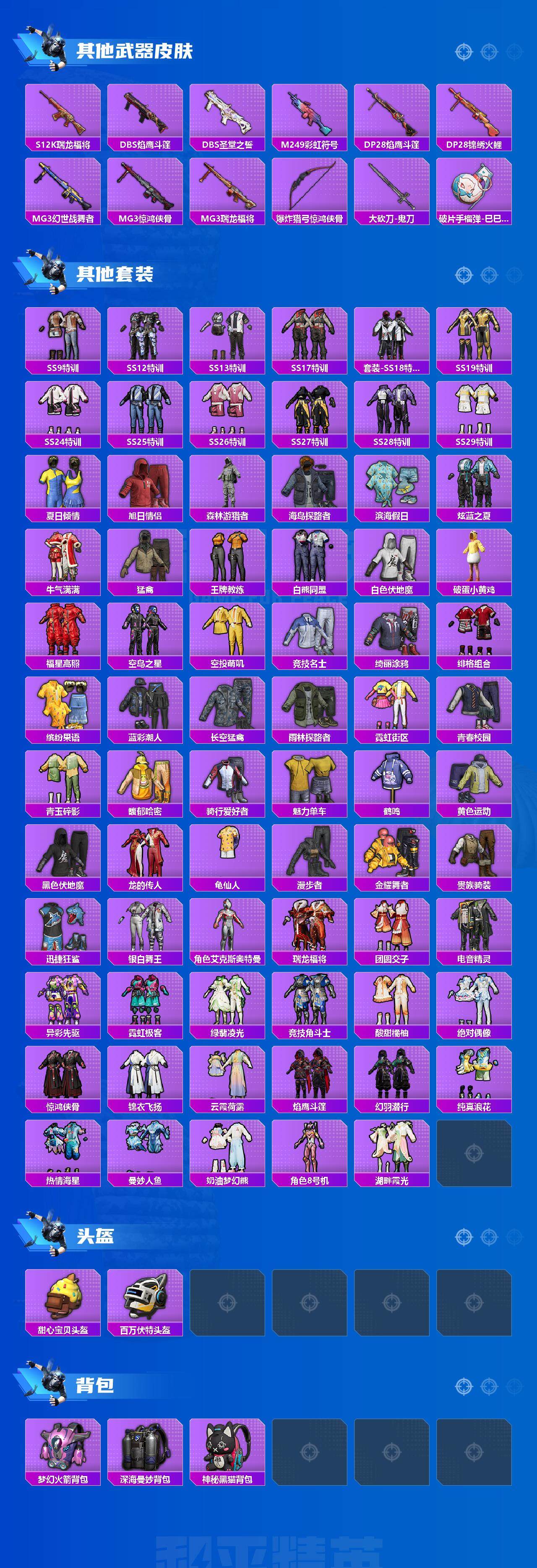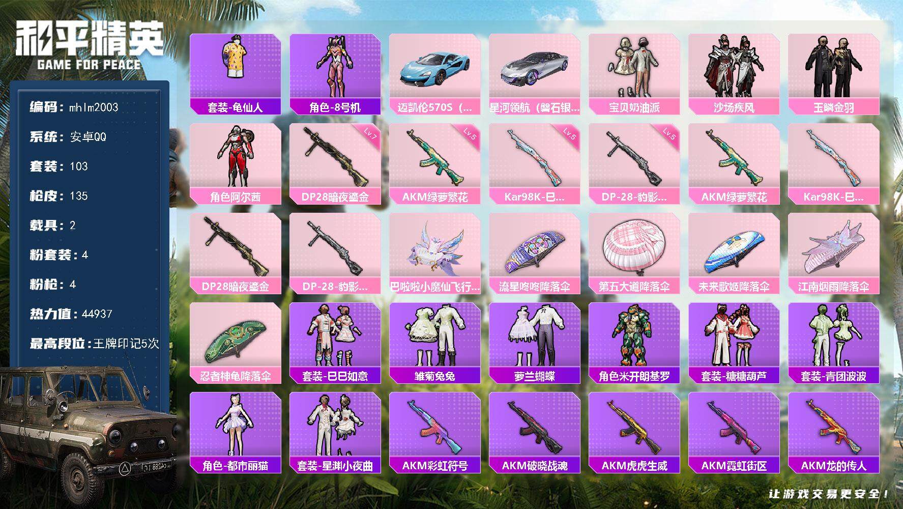 [13786854]【mhlm2003】安卓 手q-4粉装-4特效呛-2载具-1粉色飞行器-44937热力值-5王牌印记-103套装-135呛皮 【热门品类】:套装-龟仙人,角色-8号机 【粉色载具】:迈凯伦570s(天际蓝),星河领航(磐石银) 【粉色套装】:粉装-宝贝奶油派,粉装-沙场疾风,粉装-玉鳞金羽,角色-阿尔茜 【粉色呛皮等级】:akm-绿萝繁花五级,kar98k-巳巳如意五级,dp-28-暗夜鎏金七级,dp-28-豹影疾电五级 【粉色呛皮】:akm-绿萝繁花,kar98k-巳巳如意,dp-28-暗夜鎏金,dp-28-豹影疾电 【粉色飞行器】:巴啦啦小魔仙飞行器 【粉色降落伞】:流星咚咚降落伞,第五大道降落伞,未来歌姬降落伞,江南烟雨降落伞,忍者神龟降落伞 【稀有套装】:套装-龟仙人,套装-巳巳如意,套装-雏菊兔兔,套装-萝兰蝴蝶,角色-米开朗基罗,套装-糖糖葫芦,套装-青团波波,角色-都市丽猫,套装-星渊小夜曲 【稀有呛皮】:akm-彩虹符号,akm-破晓战魂,akm-虎虎生威,akm-霓虹街区,akm-龙的传人,m16a4-千金淑猫,scar-l-炫彩节奏,scar-l-碧影闪光,m416-糯团青竹,m416-红色方程式,m416-绯红前夜,groza-异彩先驱,groza-蓝莓炮弹,aug-灵符少年,aug-耀粉歌者,q-彩虹符号,m762-快乐主宰,m762-牛气冲天,m762-瑞龙福将,m762-镭射皇者,g36c-镜域双华,蜜獾-天降萌叽,uzi-啾咪啾咪,uzi-天降萌叽,ump45-猪猪侠,ump45-生命誓言,vect-焰鹰斗篷,vect-暗夜玫瑰,汤姆逊-天降萌叽,汤姆逊-奇异狩猎者,汤姆逊-异彩先驱,汤姆逊-炫彩节奏,汤姆逊-耀粉歌者,mp5k-异彩先驱,p90-巳巳如意,kar98k-影袭,kar98k-红色方程式,kar98k-蓝莓炮弹,awm-焰鹰斗篷,sks-炫彩节奏,vss-彩虹符号,vss-镭射皇者,mini14-异彩先驱,mini14-耀粉歌者,win94-瑞龙福将,m417-惊鸿侠骨,m200-惊鸿侠骨,s686-生命誓言,s686-白勺歌姬,s686-红色方程式,s686-巳巳如意,s1897-镭射皇者,s12k-玩趣呆呆,s12k-瑞龙福将,s12k-幻影战神,dbs-焰鹰斗篷,dbs-圣堂之誓,m24