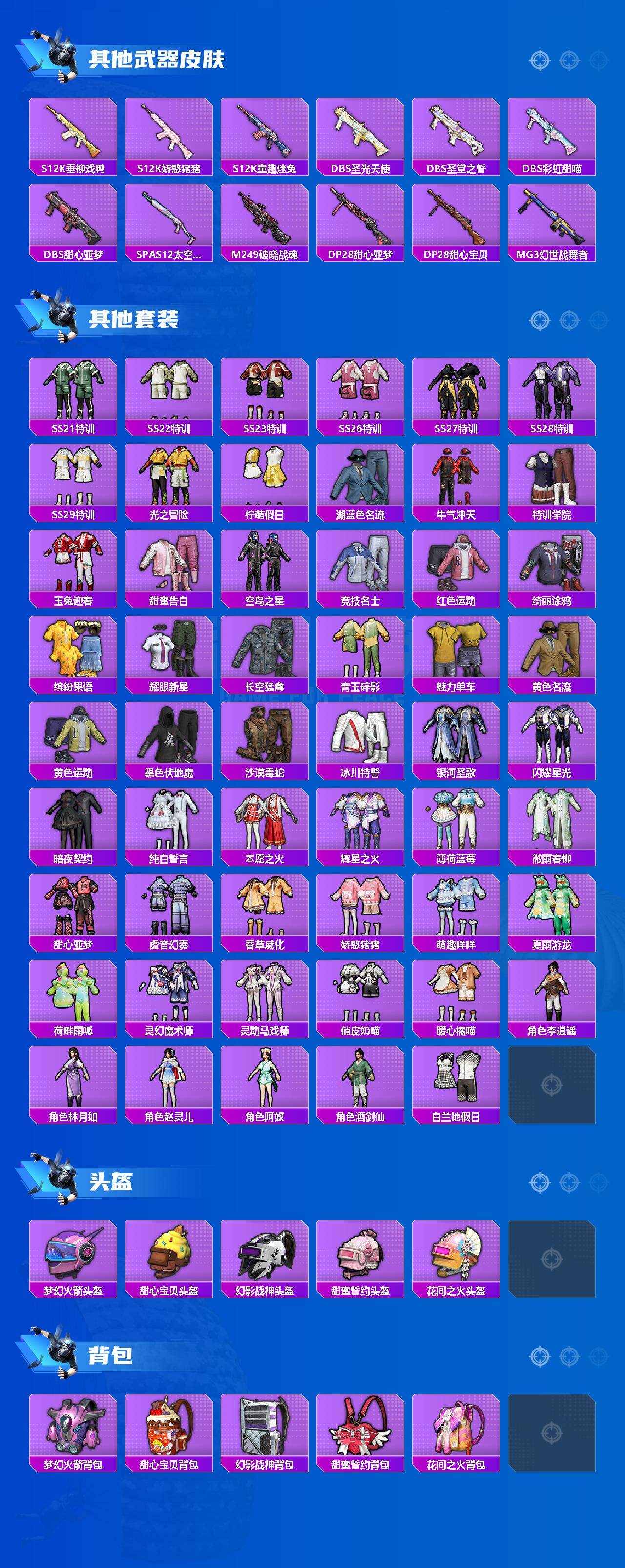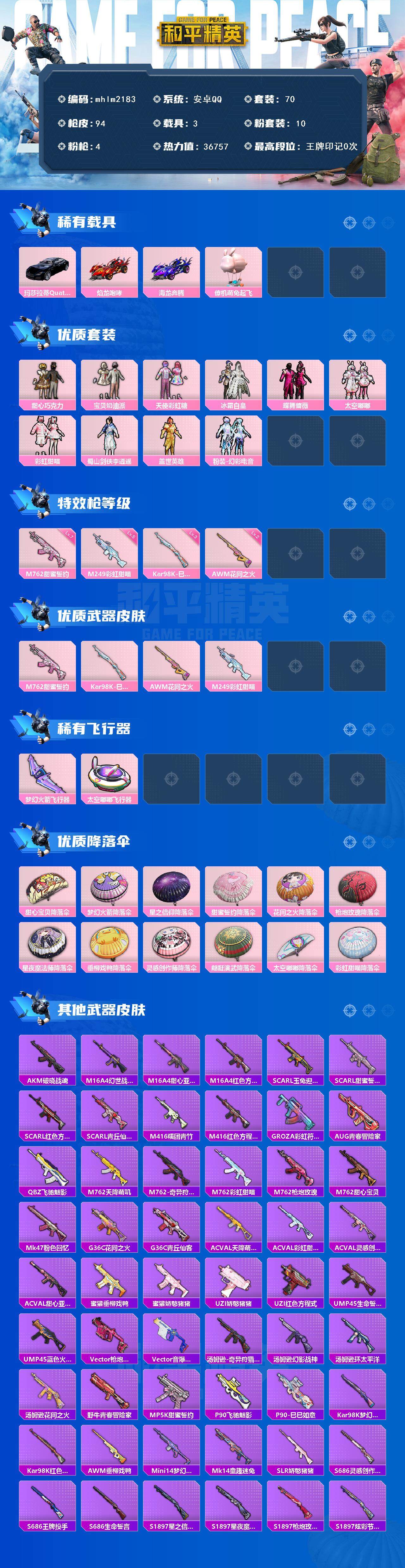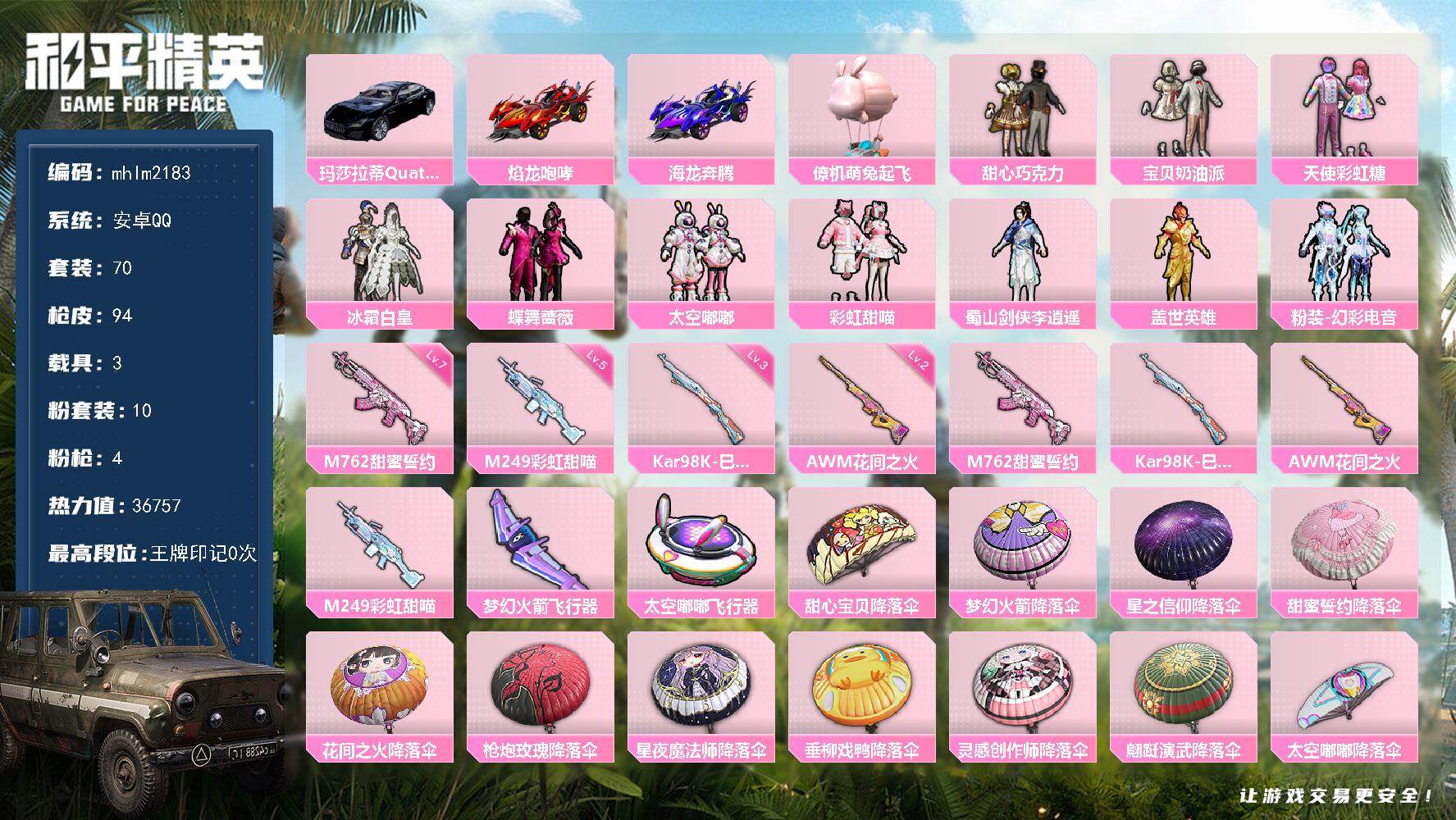 [13805690]【mhlm2183】安卓 手q-10粉装-4特效呛-3载具-2粉色飞行器-36757热力值-1王牌印记-70套装-94呛皮 【粉色载具】:玛莎拉蒂quattropte(夜幕蓝),焰龙咆哮,海龙奔腾,僚机-萌兔起飞 【粉色套装】:粉装-甜心巧克力,粉装-宝贝奶油派,粉装-天使彩虹糖,粉装-冰霜白皇,粉装-蝶舞蔷薇,粉装-太空嘟嘟,粉装-彩虹甜喵,蜀山剑侠-李,粉装-盖世英雄,粉装-幻彩电音 【粉色呛皮等级】:m762-甜蜜誓约七级,kar98k-巳巳如意三级,awm-花间之火二级,m249-彩虹甜喵五级 【粉色呛皮】:m762-甜蜜誓约,kar98k-巳巳如意,awm-花间之火,m249-彩虹甜喵 【粉色飞行器】:梦幻火箭飞行器,太空嘟嘟飞行器 【粉色降落伞】:甜心宝贝降落伞,梦幻火箭降落伞,星之信仰降落伞,甜蜜誓约降落伞,花间之火降落伞,呛炮玫瑰降落伞,星夜魔法师降落伞,垂柳戏鸭降落伞,灵感创作师降落伞,翩跹演武降落伞,太空嘟嘟降落伞,彩虹甜喵降落伞 【稀有呛皮】:akm-破晓战魂,m16a4-幻世战舞者,m16a4-甜心亚梦,m16a4-红色方程式,scar-l-玉兔迎春,scar-l-甜蜜誓约,scar-l-红色方程式,scar-l-青丘仙客,m416-糯团青竹,m416-红色方程式,groza-彩虹符号,aug-青春冒险家,q-飞驰魅影,m762-天降萌叽,m762-奇异狩猎者,m762-彩虹甜喵,m762-呛炮玫瑰,m762-甜心宝贝,mk47-粉色回忆,g36c-花间之火,g36c-青丘仙客,ac-val-天降萌叽,ac-val-彩虹甜喵,ac-val-灵感创作师,ac-val-甜心亚梦,蜜獾-垂柳戏鸭,蜜獾-娇憨猪猪,uzi-娇憨猪猪,uzi-红色方程式,ump45-生命誓言,ump45-蓝色火焰,vect-呛炮玫瑰,vect-音爆索尼克,汤姆逊-奇异狩猎者,汤姆逊-幻影战神,汤姆逊-环太平洋,汤姆逊-花间之火,野牛-青春冒险家,mp5k-甜蜜誓约,p90-飞驰魅影,p90-巳巳如意,kar98k-梦幻火箭,kar98k-红色方程式,awm-垂柳戏鸭,mini14-梦幻火箭,mk14-童趣迷兔,slr-娇憨猪猪,s686-灵感创作师,s686-王牌投手,s686-生命誓言,s1897-星之信仰,s1897-星夜魔法师