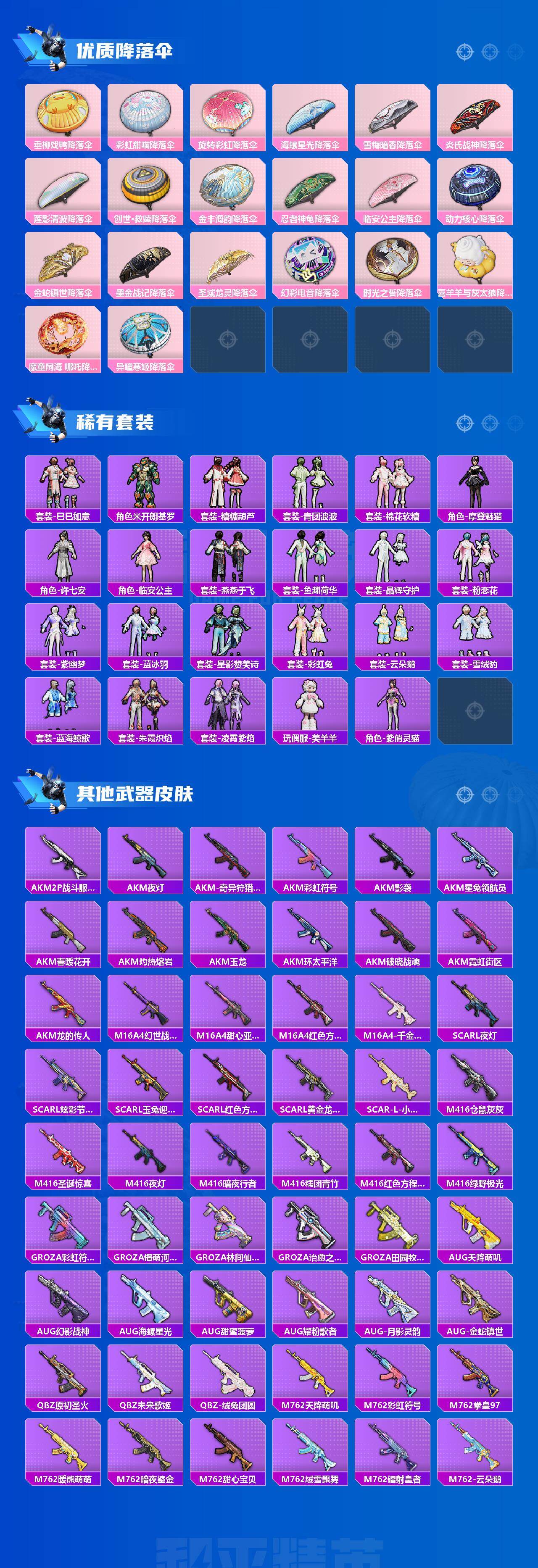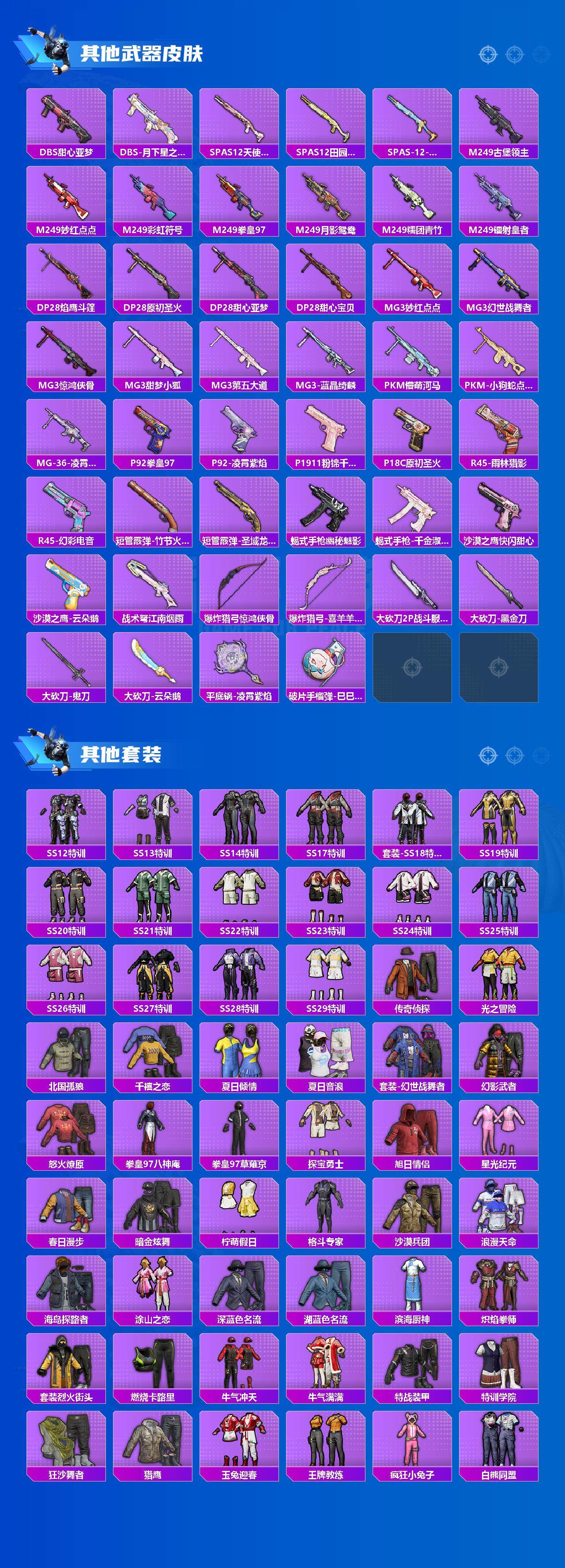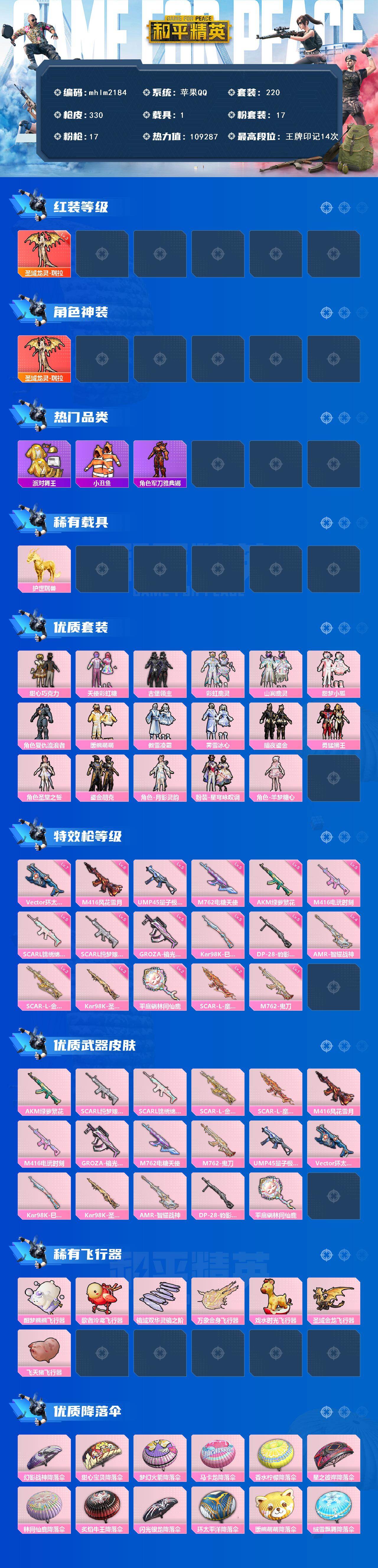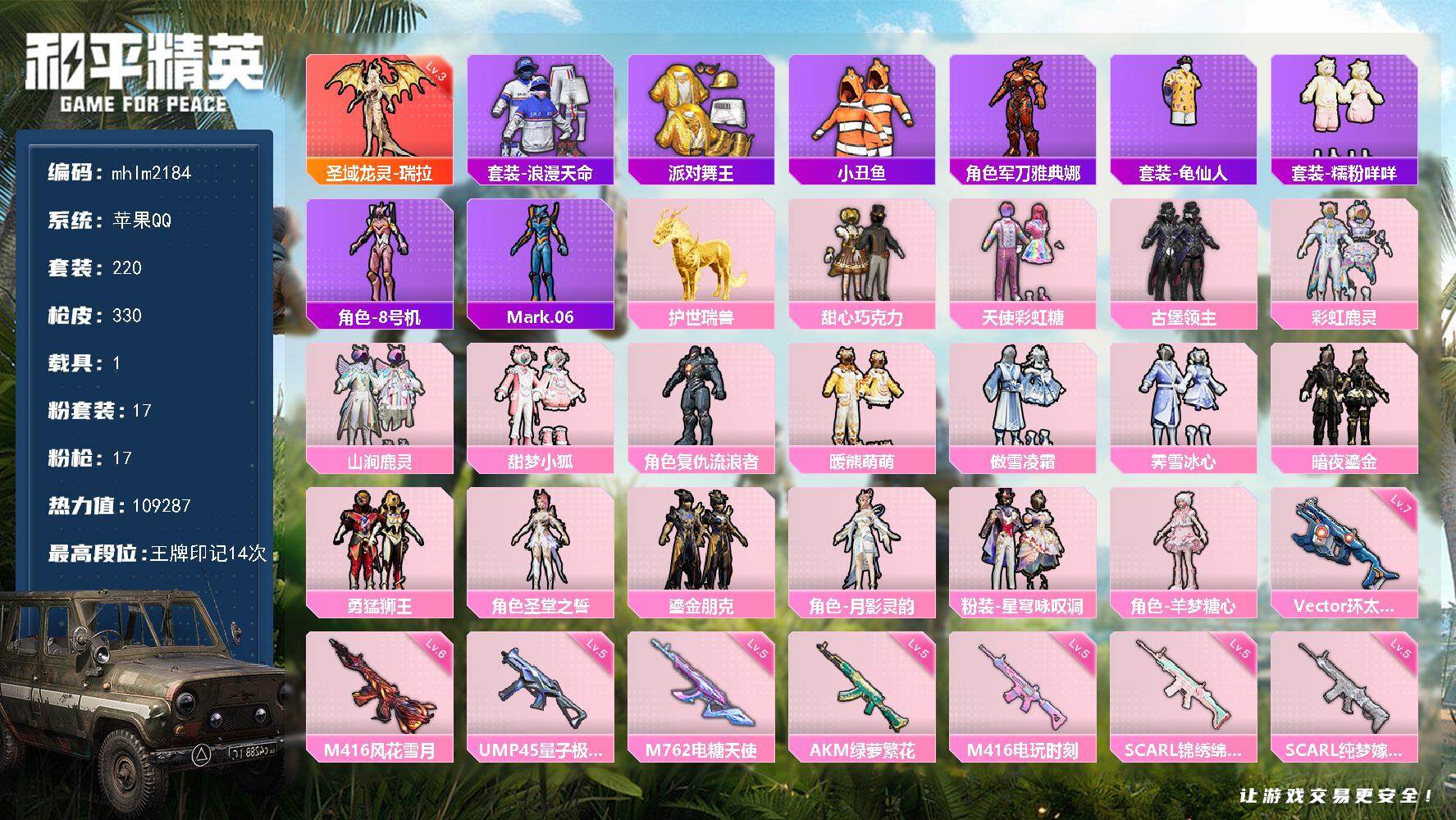 [13805713]【mhlm2184】苹果 手q-1神装-17粉装-17特效呛-1载具-9粉色飞行器-109287热力值-14王牌印记-220套装-330呛皮 【红色神装等级】:圣域龙灵-瑞拉三级 【红色角色神装】:圣域龙灵-瑞拉 【热门品类】:套装-浪漫天命,套装-派对舞王,套装-小丑鱼,角色-军刀雅典娜,套装-龟仙人,套装-糯粉咩咩,角色-8号机,角色-mark.06 【粉色载具】:护世瑞兽 【粉色套装】:粉装-甜心巧克力,粉装-天使彩虹糖,粉装-古堡领主,粉装-彩虹鹿灵,粉装-山涧鹿灵,粉装-甜梦小狐,角色-复仇流浪者,粉装-暖熊萌萌,粉装-傲雪凌霜,粉装-霁雪冰心,粉装-暗夜鎏金,粉装-勇猛狮王,角色-圣堂之誓,粉装-鎏金朋克,角色-月影灵韵,粉装-星穹咏叹调,角色-羊梦糖心 【粉色呛皮等级】:akm-绿萝繁花五级,scar-l-纯梦嫁纱五级,scar-l-锦绣绵绵五级,scar-l-金蛇镇世三级,scar-l-魔童闹海 哪吒二级,m416-风花雪月六级,m416-电玩时刻五级,groza-镜光银凌五级,m762-电糖天使五级,m762-鬼刀一级,ump45-量子极限五级,vect-环太平洋七级,kar98k-巳巳如意五级,kar98k-圣域龙灵三级,amr-智耀战神四级,dp-28-豹影疾电五级,平底锅-林间仙鹿二级 【粉色呛皮】:akm-绿萝繁花,scar-l-纯梦嫁纱,scar-l-锦绣绵绵,scar-l-金蛇镇世,scar-l-魔童闹海 哪吒,m416-风花雪月,m416-电玩时刻,groza-镜光银凌,m762-电糖天使,m762-鬼刀,ump45-量子极限,vect-环太平洋,kar98k-巳巳如意,kar98k-圣域龙灵,amr-智耀战神,dp-28-豹影疾电,平底锅-林间仙鹿 【粉色飞行器】:酣梦熊熊飞行器,歌者泠鸢飞行器,镜域双华-灵镜之阶,万象金身飞行器,戏水时光飞行器,圣域金龙飞行器,飞天猪飞行器 【粉色降落伞】:幻影战神降落伞,甜心宝贝降落伞,梦幻火箭降落伞,马卡龙降落伞,香水柠檬降落伞,星之彼岸降落伞,林间仙鹿降落伞,炙焰牛王降落伞,闪光银龙降落伞,环太平洋降落伞,暖熊萌萌降落伞,绒雪飘舞降落伞,垂柳戏鸭降落伞,彩虹甜喵降落伞,旋转彩虹降落伞,海螺星光降落伞,雪梅暗香降