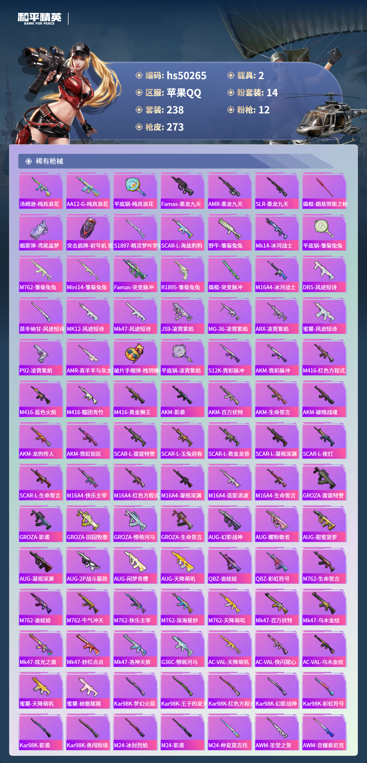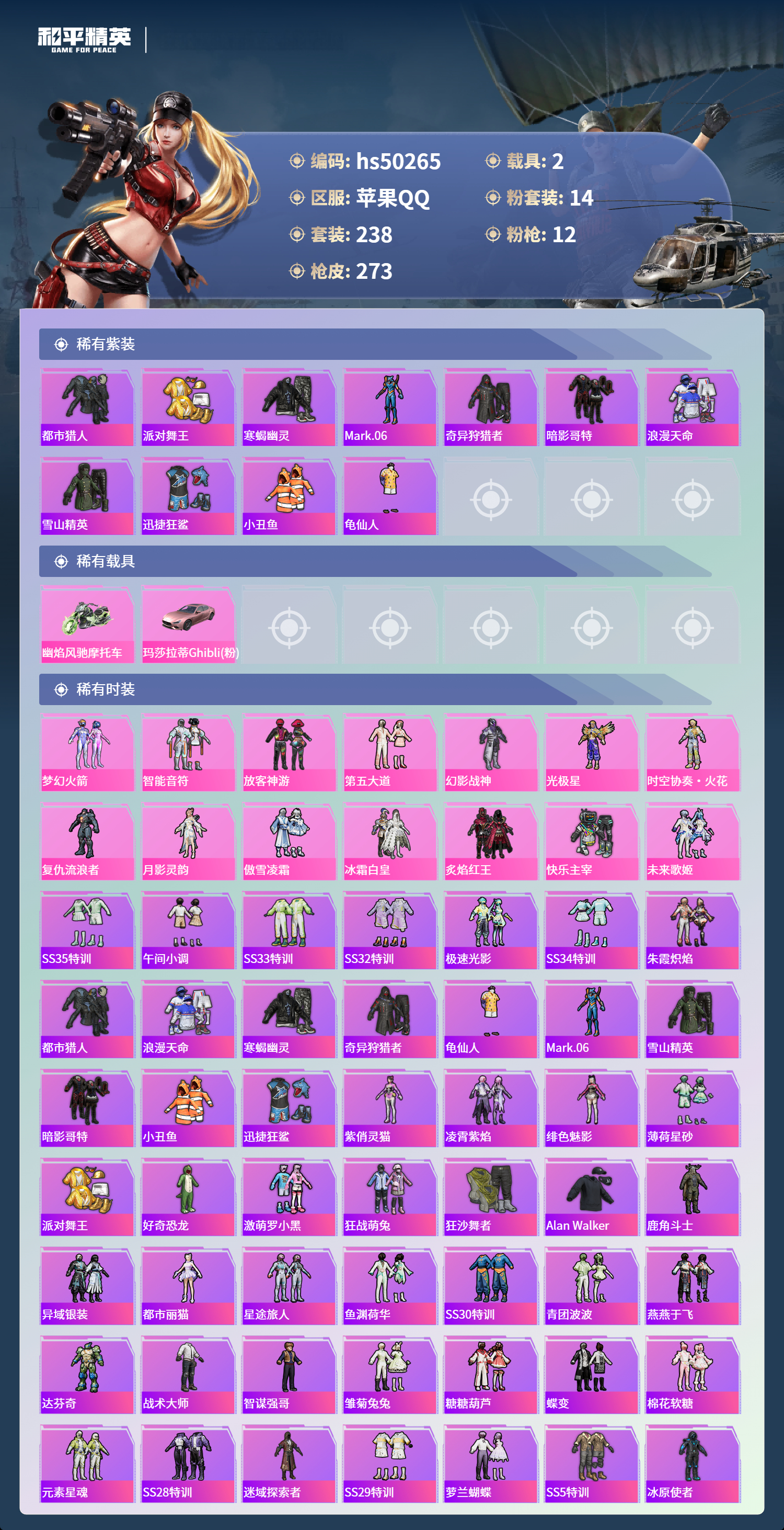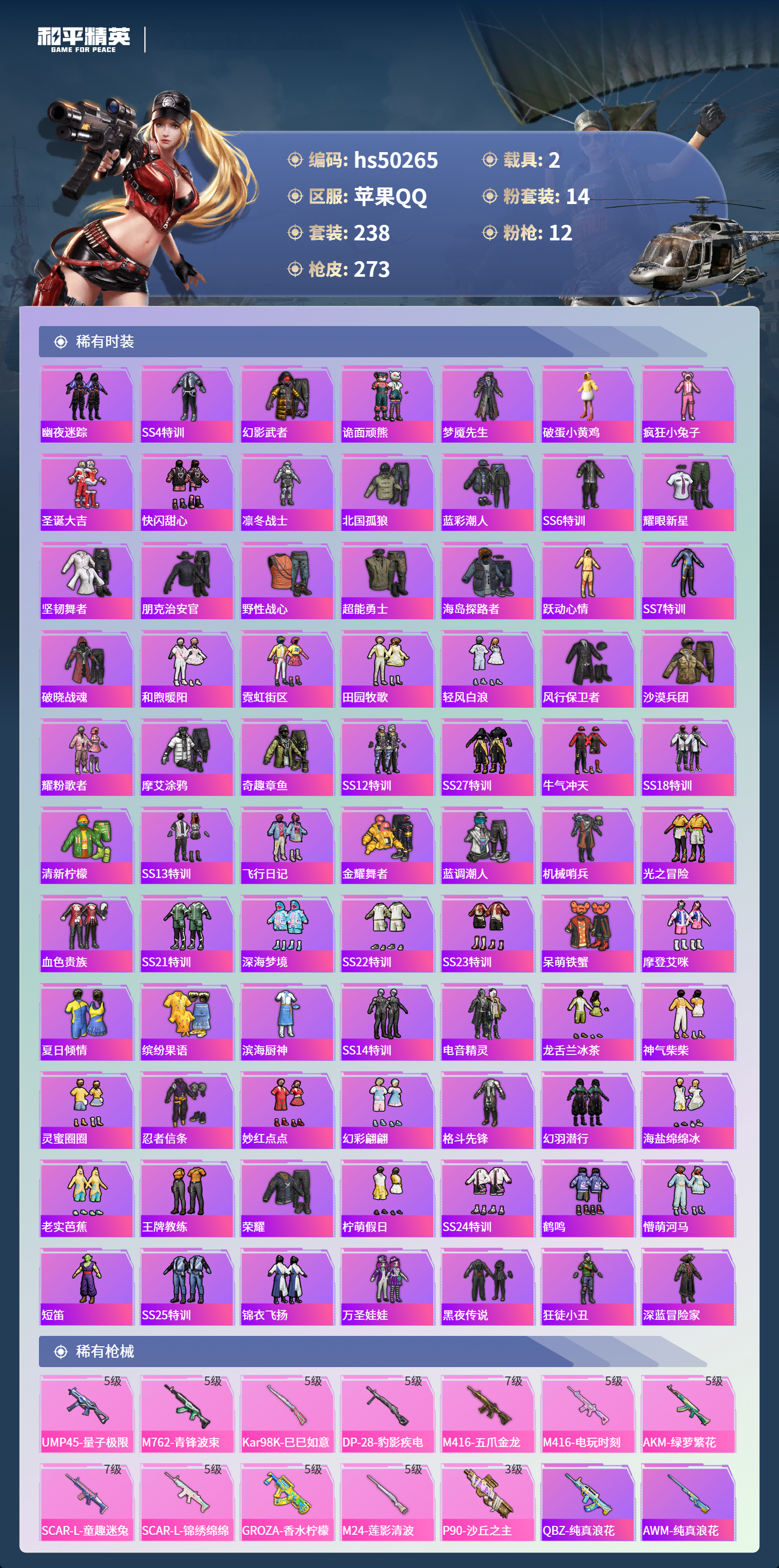 hs50265 苹果手q-9王牌印记-14粉装-12特效呛-2载具-95145热力值-238套装-273呛皮-5卓越印记-2传奇印记【14粉装】套装-冰霜白皇套装-第五大道角色-复仇流浪者套装-放客神游时空协奏·火花套装-炙焰红王套装-未来歌姬角色-月影灵韵角色-光极星套装-傲雪凌霜套装-智能音符套装-幻影战神套装-梦幻火箭套装-快乐主宰【12特效呛】scar-l-锦
