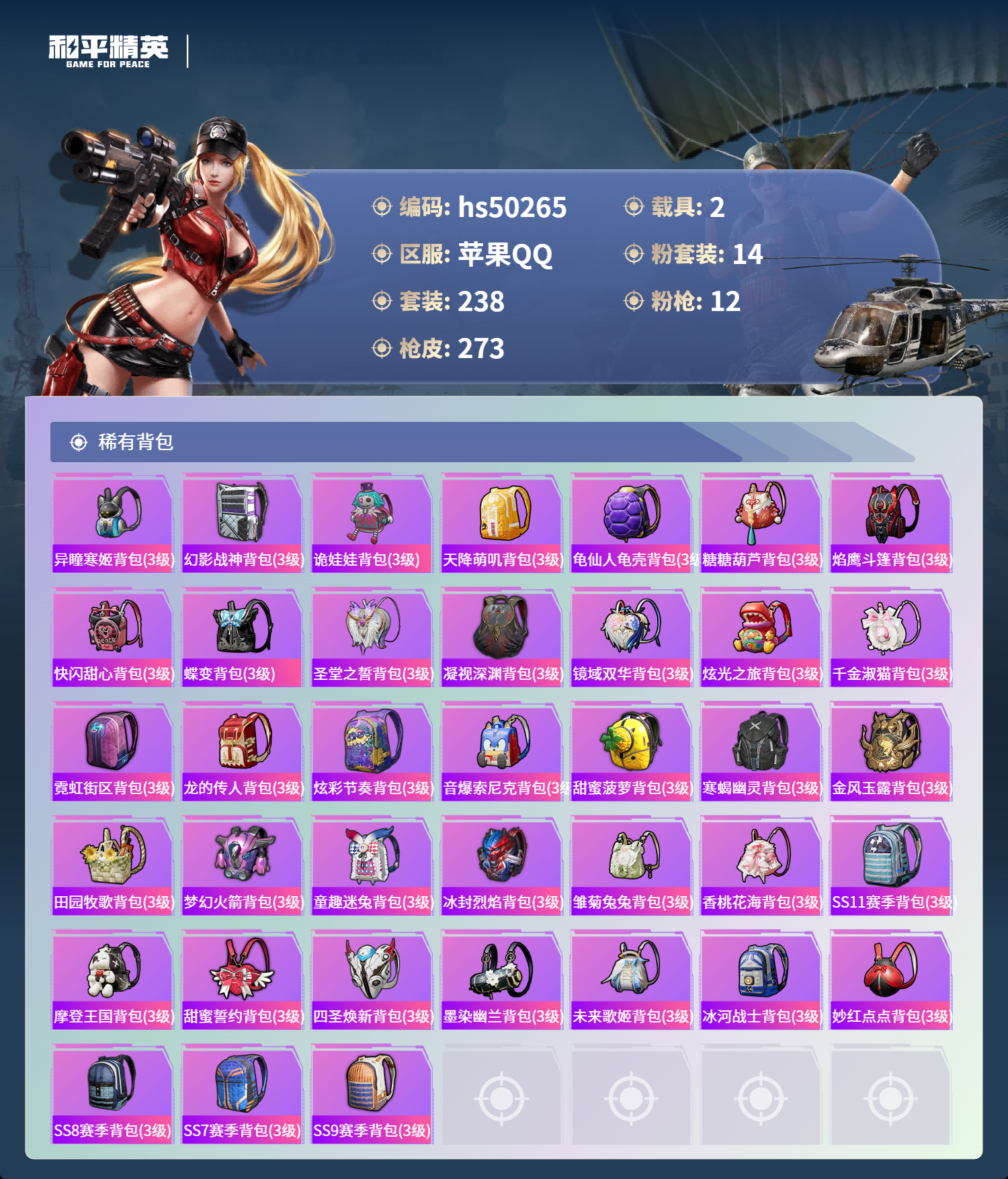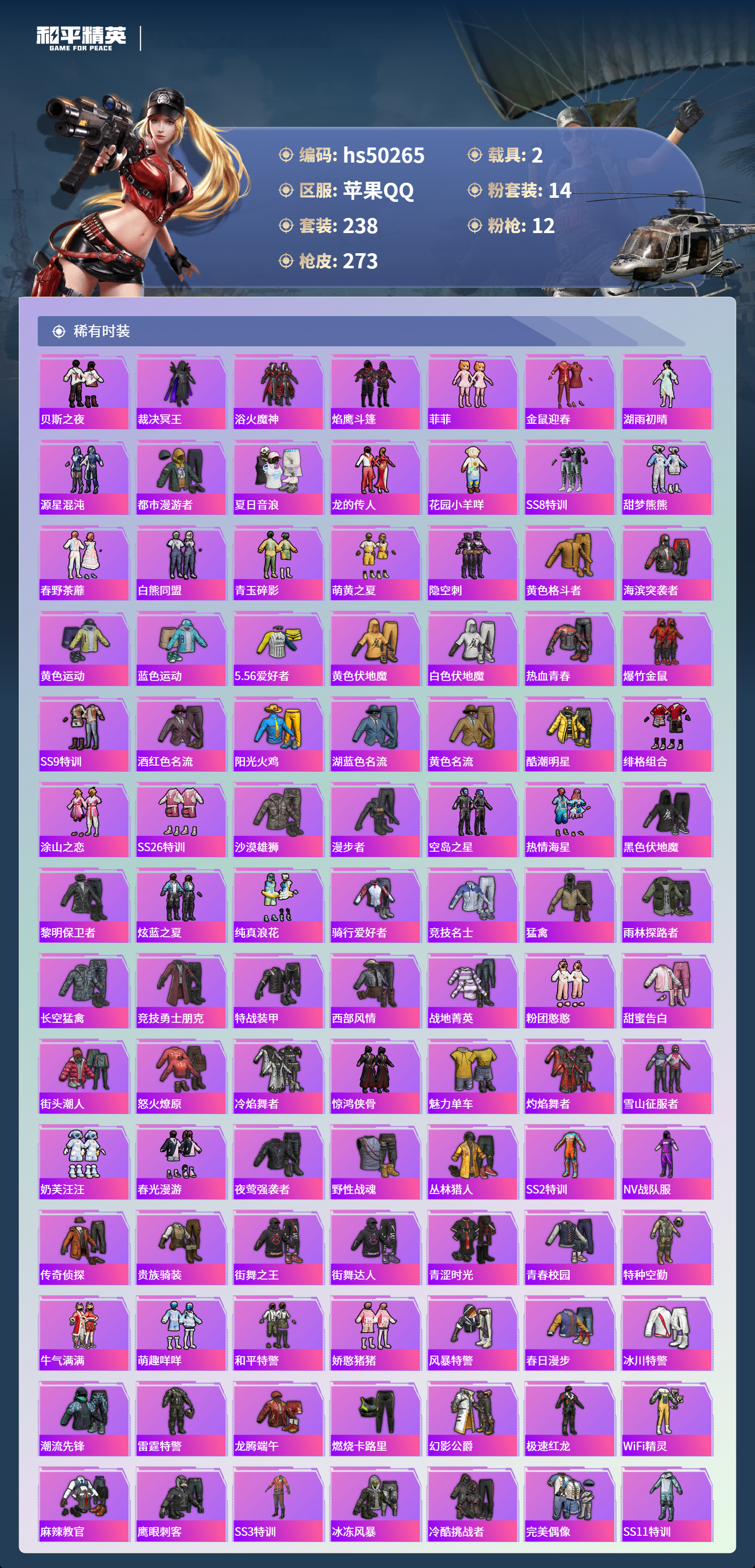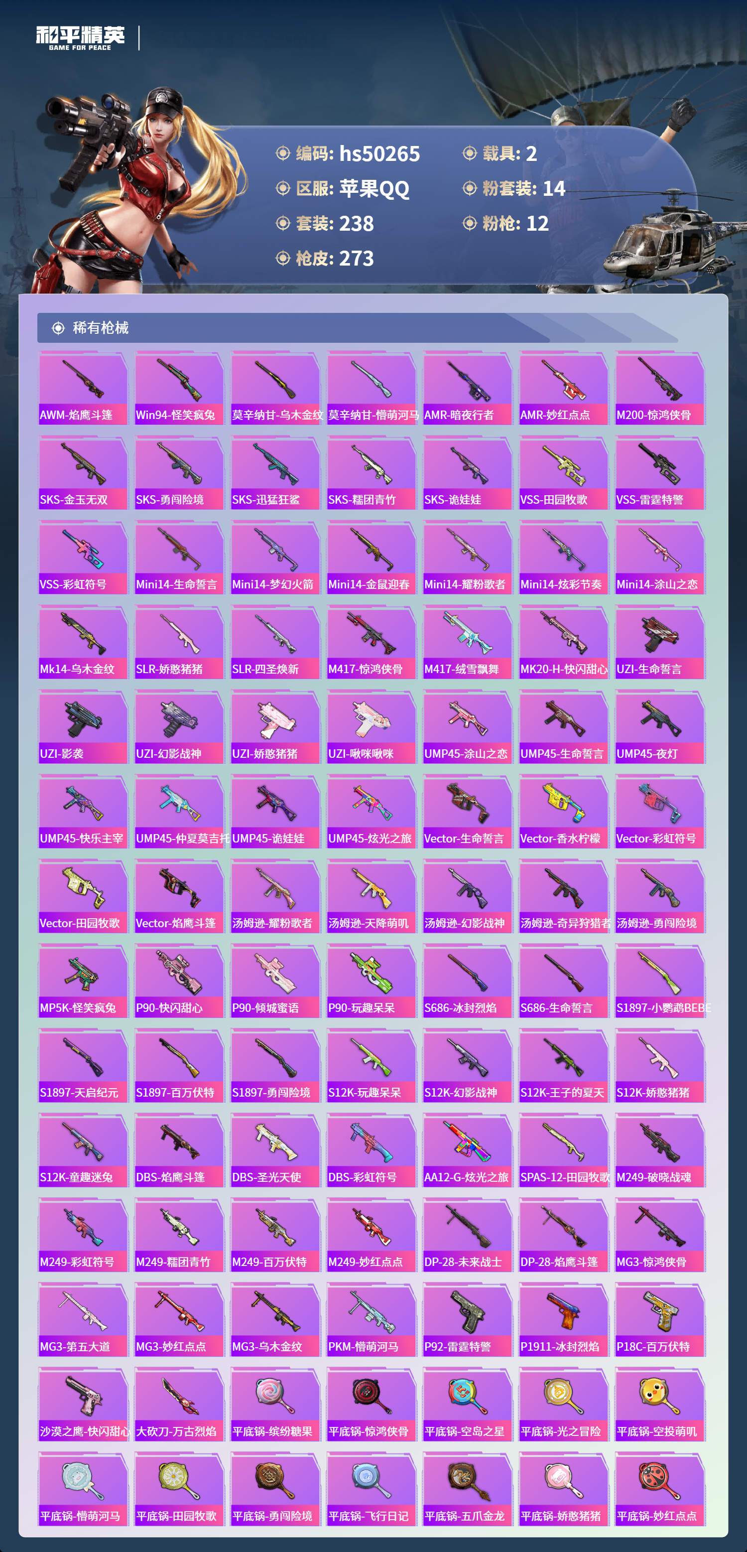 hs50265 苹果手q-9王牌印记-14粉装-12特效呛-2载具-95145热力值-238套装-273呛皮-5卓越印记-2传奇印记【14粉装】套装-冰霜白皇套装-第五大道角色-复仇流浪者套装-放客神游时空协奏·火花套装-炙焰红王套装-未来歌姬角色-月影灵韵角色-光极星套装-傲雪凌霜套装-智能音符套装-幻影战神套装-梦幻火箭套装-快乐主宰【12特效呛】scar-l-锦
