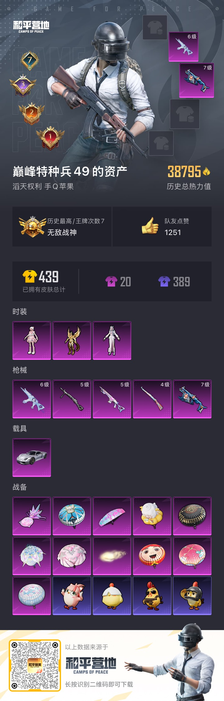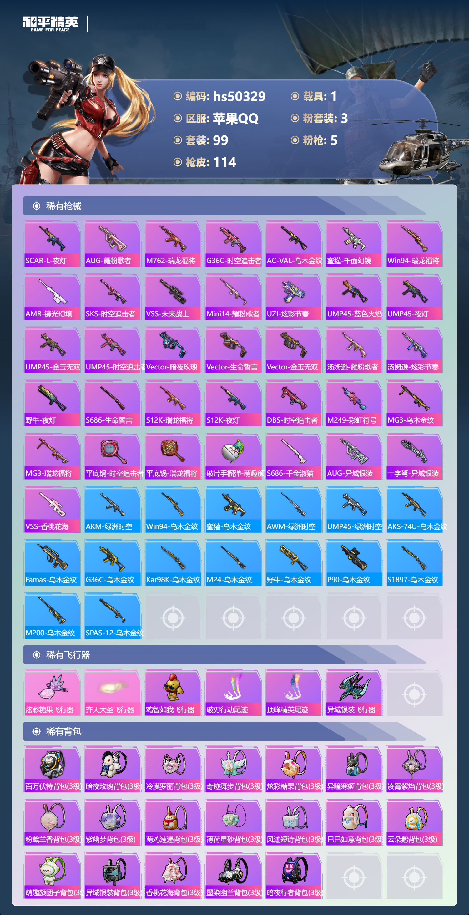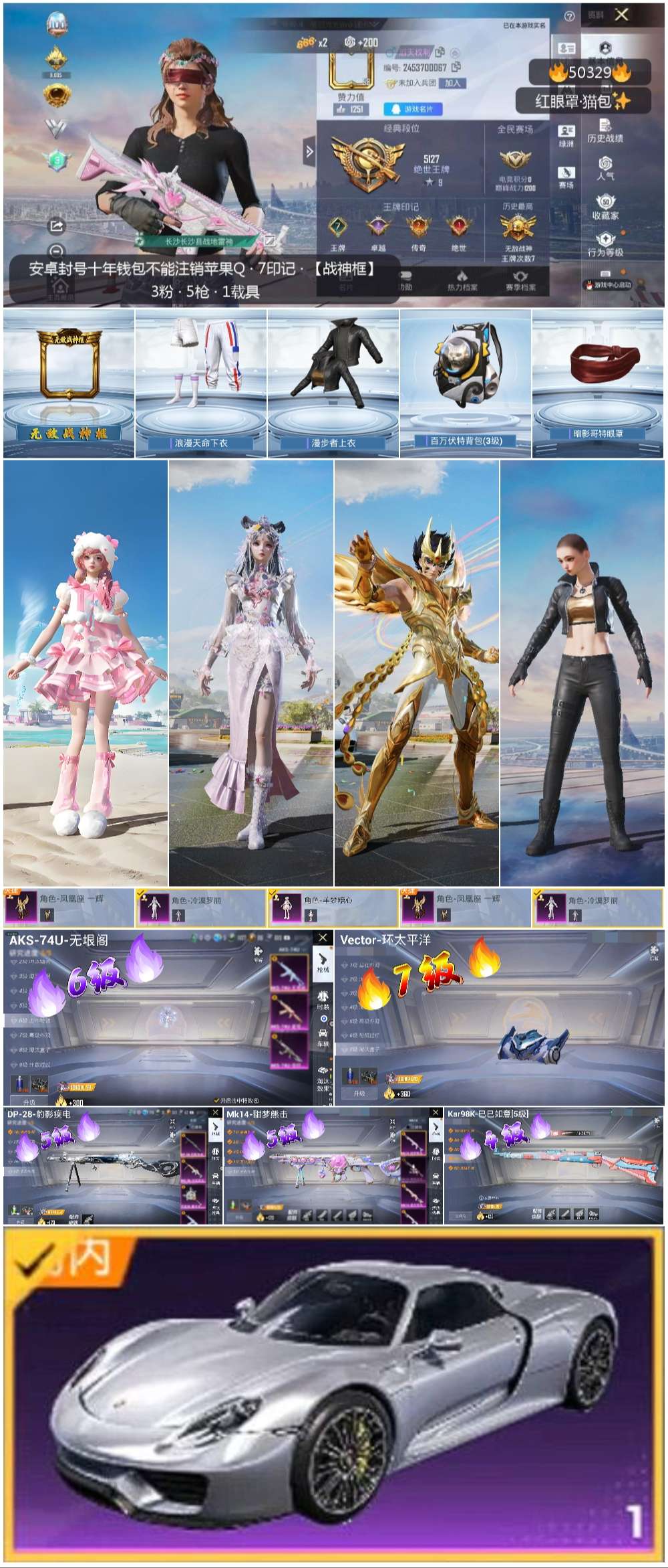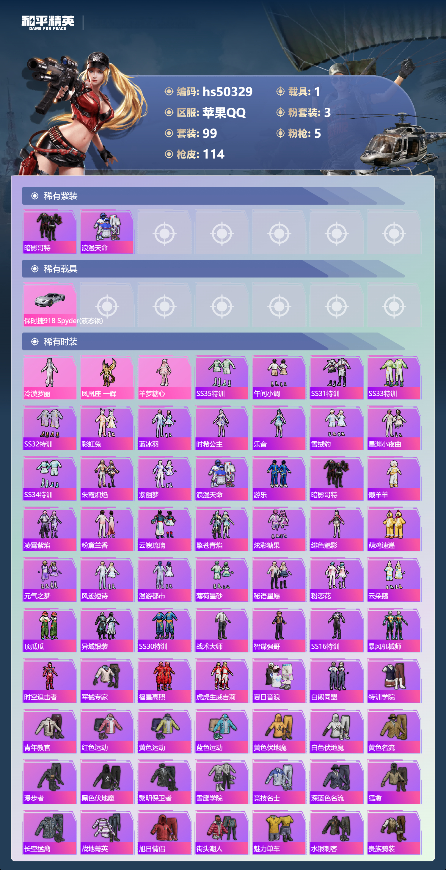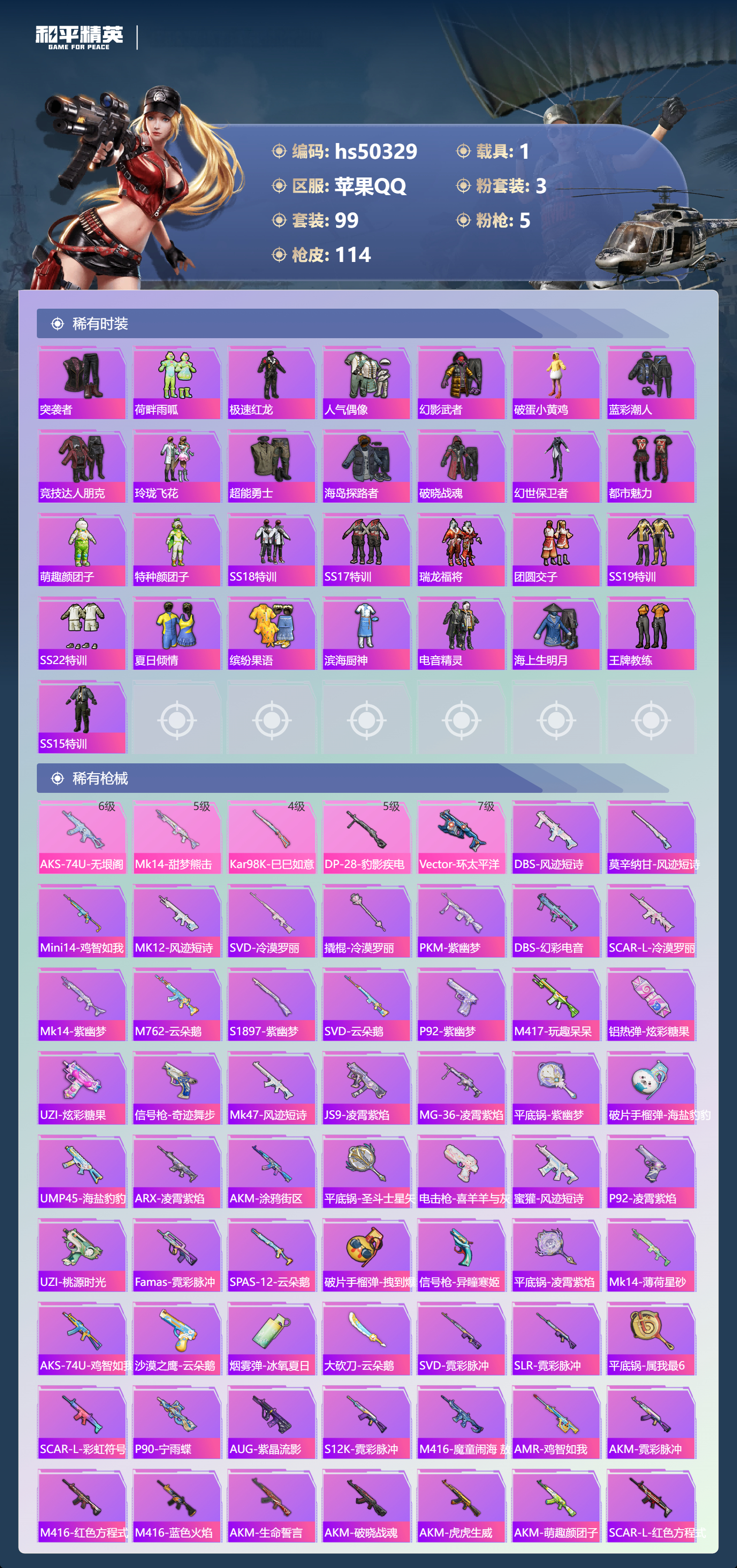 hs50329 苹果手q-7王牌印记-有战神框-3粉装-5特效呛-1载具-38795热力值-99套装-114呛皮-3卓越印记-2传奇印记【3粉装】角色-凤凰座 一辉角色-冷漠罗丽角色-羊梦糖心【5特效呛】dp-28-豹影疾电/5级vect-环太平洋/7级aks-74u-无垠阁/6级kar98k-巳巳如意/4级mk14-甜梦熊击/5级【2稀有紫装】暗影哥特浪漫天命【1稀有载