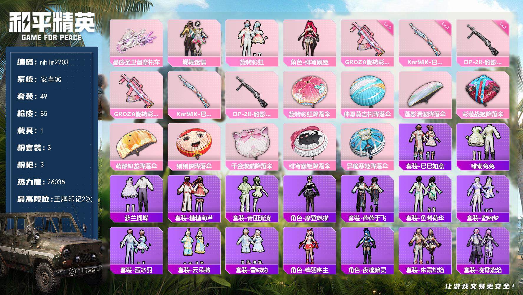 [13841371]【mhlm2203】安卓 手q-3粉装-3特效呛-1载具-0粉色飞行器-26035热力值-2王牌印记-49套装-85呛皮 【粉色载具】:最终圣卫者摩托车 【粉色套装】:粉装-蝶舞迷情,粉装-旋转彩虹,角色-绯穹魔姬 【粉色呛皮等级】:groza-旋转彩虹六级,kar98k-巳巳如意四级,dp-28-豹影疾电一级 【粉色呛皮】:groza-旋转彩虹,kar98k-巳巳如意,dp-28-豹影疾电 【粉色降落伞】:旋转彩虹降落伞,仲夏莫吉托降落伞,莲影清波降落伞,彩装战姬降落伞,萌酷奶龙降落伞,猪猪侠降落伞,千金淑猫降落伞,绯穹魔姬降落伞,异瞳寒姬降落伞 【稀有套装】:套装-巳巳如意,套装-雏菊兔兔,套装-萝兰蝴蝶,套装-糖糖葫芦,套装-青团波波,角色-摩登魅猫,套装-燕燕于飞,套装-鱼渊荷华,套装-紫幽梦,套装-蓝冰羽,套装-云朵鹅,套装-雪绒豹,角色-绛羽幽主,角色-夜瞳黯灵,套装-朱霞炽焰,套装-凌霄紫焰,角色-紫俏灵猫 【稀有呛皮】:akm-龙的传人,m16a4-幻世战舞者,m16a4-生命誓言,m16a4-千金淑猫,scar-l-炫彩节奏,scar-l-生命誓言,m416-糯团青竹,q-洛神天依,m762-云朵鹅,mk47-炫光之旅,ac-val-天降萌叽,ac-val-彩虹甜喵,arx-凌霄紫焰,uzi-生命誓言,ump45-仲夏莫吉托,ump45-炫光之旅,vect-生命誓言,汤姆逊-天降萌叽,js9-凌霄紫焰,p90-巳巳如意,kar98k-炫彩节奏,m24-仲夏莫吉托,mini14-旋转彩虹,mini14-绯穹魔姬,m200-仲夏莫吉托,svd-云朵鹅,aa12-g-炫光之旅,spas-12-云朵鹅,m249-彩虹符号,m249-绯穹魔姬,dp-28-旋转彩虹,mg-36-凌霄紫焰,p92-凌霄紫焰,短管霰弹-圣域龙灵,沙墨之鹦-旋转彩虹,沙墨之鹦-云朵鹅,大砍刀-云朵鹅,平底锅-凌霄紫焰,破片手留单-巳巳如意 【其他套装】:套装-ss28特训,套装-ss29特训,套装-夏日音浪,套装-完美偶像,套装-空岛之星,套装-竞技名士,套装-竞技达人朋克,套装-绯格组合,套装-霓虹街区,套装-鹤鸣,套装-黑色伏地魔,套装-龙的传人,套装-玲珑飞花,套装-爆裂葡萄,套装-俏皮奶喵,套装-梦幻奶油,套装-酸甜橘柚,套装-龙舌兰冰茶,套装-明鸳圣