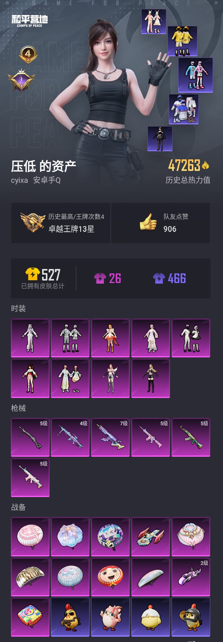 【和平精英】【lyhp15945】9粉装6特效呛 烟云彩露 小可学妹 浪漫天命 小黄鸭 罗小黑 满级电糖762 9粉装,6特效呛,0载具,历史最高段位:卓越王牌13星 王牌印记4次 热力值:47263,124套装,134呛械,168装备,81战备;套装:套装-岚岚物语,套装-冰川幽秘,角色-小可学妹,角色-蔷薇星,角色-水仙星,套装-莲影清波,角色-烟云彩露,角色-小蓝,角色-冷漠罗丽,套装-特训学院,套装-猎鹰,套装-青年教官,套装-橘黑制服,套装-红色运动,套装-黄色运动,套装-蓝色运动,套装-黄色伏地魔,套装-白色伏地魔,套装-黑色伏地魔,套装-骑行爱好者,套装-冰川格斗者,套装-竞技名士,套装-深蓝色名流,套装-酒红色名流,套装-湖蓝色名流,套装-黄色名流,套装-猛禽,套装-长空猛禽,套装-冷焰舞者,套装-灼焰舞者,套装-浪漫天命,套装-战地督导,套装-完美偶像,套装-人气偶像,套装-幻影武者,套装-街头潮人,套装-蓝彩潮人,套装-魅力单车,套装-绮丽涂鸦,套装-耀眼新星,套装-竞技达人朋克,套装-都市漫游者,套装-都市魅力,套装-热血青春,套装-青涩时光,套装-缤纷果语,套装-滨海厨神,套装-元素星魂,套装-极速红龙,套装-破蛋小黄鸡,套装-鹤鸣,套装-霓虹街区,套装-激萌罗小黑,套装-潮萌小黄鸭,套装-白熊同盟,套装-萌黄之夏,套装-山经魅狐,套装-白糯汤圆,套装-纯白舞曲,套装-战术大师,套装-ss18特训,套装-耀粉歌者,套装-暗影爵士,套装-暗黑裁决,套装-治愈之星,套装-科技之星,套装-热情海星,套装-纯真浪花,套装-冰爽海盐,套装-ss14特训,套装-ss17特训,套装-极乐追光,套装-ss19特训,套装-沁蓝冰爽,套装-音速流光,套装-粉团憨憨,套装-娇憨猪猪,套装-暖心橘喵,套装-轻风白浪,套装-ss23特训,套装-莱茵河畔,套装-王牌教练,套装-龟仙人,套装-ss25特训,套装-惊鸿侠骨,套装-锦衣飞扬,套装-晨曦薄雾,套装-果汁能量,套装-ss26特训,套装-快闪甜心,套装-春光漫游,套装-漫游都市,套装-空岛之星,角色-星际旅行,套装-焰鹰斗篷,套装-幽夜迷踪,套装-幻羽潜行,套装-ss27特训,套装-老实芭蕉,套装-ss28特训,角色-蝶吟花词,套装-海盐绵绵冰,套装-湖畔霞光,套装-ss29特训,角色-无面战甲,角色-摩登魅猫,套装-ss30特训,套装-ss31特训,套装-ss33特训,套装-云朵鹅,套装-巳巳如意,套装-ss32特训,套装-彩虹兔,套装-顶瓜瓜,套装-雪绒豹,套装-极速光影,套装-霓虹热舞,套装-蓝海鲸歌,套装-元气之梦,套装-ss34特训,套装-朱霞炽焰,套装-游乐,套装-凌霄紫焰,套装-薄荷星砂;呛皮:m16a4-莲影清波,q-纯真浪花,7级m762-电糖天使,m762-橘柚倾心,m762-云朵鹅,蜜獾-天降萌叽,蜜獾-精灵梦叶罗丽,蜜獾-绯穹魔姬,groza-治愈之星,groza-无面战甲,aug-耀粉歌者,aug-异域银装,aug-紫晶流影,5级scar-l-锦绣绵绵,scar-l-红色方程式,scar-l-炫彩节奏,scar-l-海盐豹豹,5级akm-绿萝繁花,akm-夜灯,akm-彩虹符号,5级m416-电玩时刻,m416-滑板小狐,m416-糯团青竹,famas-乌木金纹,ac-val-灵感创作师,ac-val-魅影蝠王,ac-val-快闪甜心,arx-凌霄紫焰,g36c-乌木金纹,kar98k-梦幻火箭,kar98k-彩虹符号,kar98k-飞驰魅影,m200-惊鸿侠骨,m200-乌木金纹,amr-白勺歌姬,amr-墨龙九天,amr-鸡智如我,amr-乌木金纹,莫辛纳甘-乌木金纹,awm-焰鹰斗篷,awm-纯真浪花,awm-乌木金纹,m24-治愈之星,m24-香水柠檬,m24-幻彩电音,m24-时光之吻,m24-乌木金纹,svd-云朵鹅,mk14-治愈之星,mk14-猪猪侠,mk14-薄荷星砂,m417-惊鸿侠骨,m417-玩趣呆呆,m417-猪猪侠,slr-圣穹绘梦,mk20-h-快闪甜心,mk20-h-竞速先锋,mk20-h-乌木金纹,sks-冠军兔兔,vss-田园牧歌,p90-飞驰魅影,p90-快闪甜心,p90-玩趣呆呆,p90-乌木金纹,uzi-红色方程式,uzi-炫彩节奏,uzi-天降萌叽,uzi-冰河战士,uzi-啾咪啾咪,vect-彩虹符号,vect-治愈之星,vect-田园牧歌,vect-焰鹰斗篷,汤姆逊-耀粉歌者,汤姆逊-天降萌叽,汤姆逊-纯真浪花,ump45-生命誓言,ump45-猪猪侠,野牛-乌木金纹,aks-74u-鸡智如我,aks-74u-乌木金纹,js9-凌霄紫焰,mp5k-乌木金纹,s1897-飞驰魅影,s1897-精灵梦叶罗丽,s1897-乌木金纹,dbs-第五大道,dbs-焰鹰斗篷,dbs-幻彩电音,dbs-乌木金纹,spas-12-田园牧歌,spas-12-云朵鹅,spas-12-乌木金纹,s686-红色方程式,s686-橘柚倾心,aa12-g-纯真浪花,s12k-香水柠檬,s12k-垂柳戏鸭,m249-彩虹符号,m249-无面战甲,m249-乌木金纹,5级dp-28-豹影疾电,dp-28-橘柚倾心,dp-28-焰鹰斗篷,mg3-乌木金纹,mg3-惊鸿侠骨,4级mg-36-幻彩电音,mg-36-凌霄紫焰,p92-凌霄紫焰,p18c-镜光幻境,r45-幻彩电音,蝎式手呛-闲梦青缨,tmp-9-江南烟雨,沙墨之鹦-快闪甜心,沙墨之鹦-云朵鹅,p1911-无面战甲,大砍刀-云朵鹅,大砍刀-咒蚀之裁,平底锅-治愈之星,平底锅-飞驰魅影,平底锅-田园牧歌,平底锅-惊鸿侠骨,平底锅-快闪甜心,平底锅-空岛之星,平底锅-焰鹰斗篷,平底锅-精灵梦叶罗丽,平底锅-纯真浪花,平底锅-凌霄紫焰,撬棍-甜心宝贝,撬棍-巴啦啦小魔仙,爆炸猎弓-惊鸿侠骨,破片手留单-呆爆全场,盐雾蛋-鸢尾晶梦,盐雾蛋-冰氧夏日;降落伞:彩虹甜喵降落伞,第五大道降落伞,莲影清波降落伞,炫光之旅降落伞,猪猪侠降落伞,辉耀战甲降落伞,巴啦啦小魔仙降落伞,幻彩电音降落伞,荧海星豚降落伞,马戏团糖果降落伞,化学天才降落伞,钢铁雄心降落伞,治愈之星降落伞,龙宫之主降落伞,ss25王牌降落伞,惊鸿侠骨降落伞,云上灯宵降落伞,ss26王牌降落伞,快闪甜心降落伞,空岛之星降落伞,焰鹰斗篷降落伞,ss27王牌降落伞,纯真浪花降落伞,ss28王牌降落伞,海盐豹豹降落伞,异域银装降落伞,无面战甲降落伞,云朵鹅降落伞,凌霄紫焰降落伞,魔童闹海 敖闰降落伞,竞
