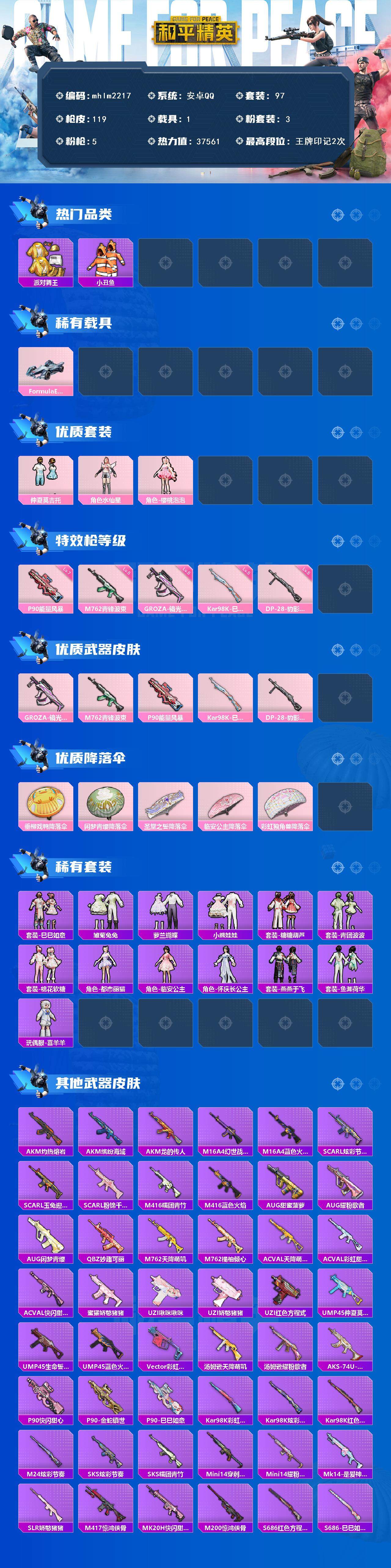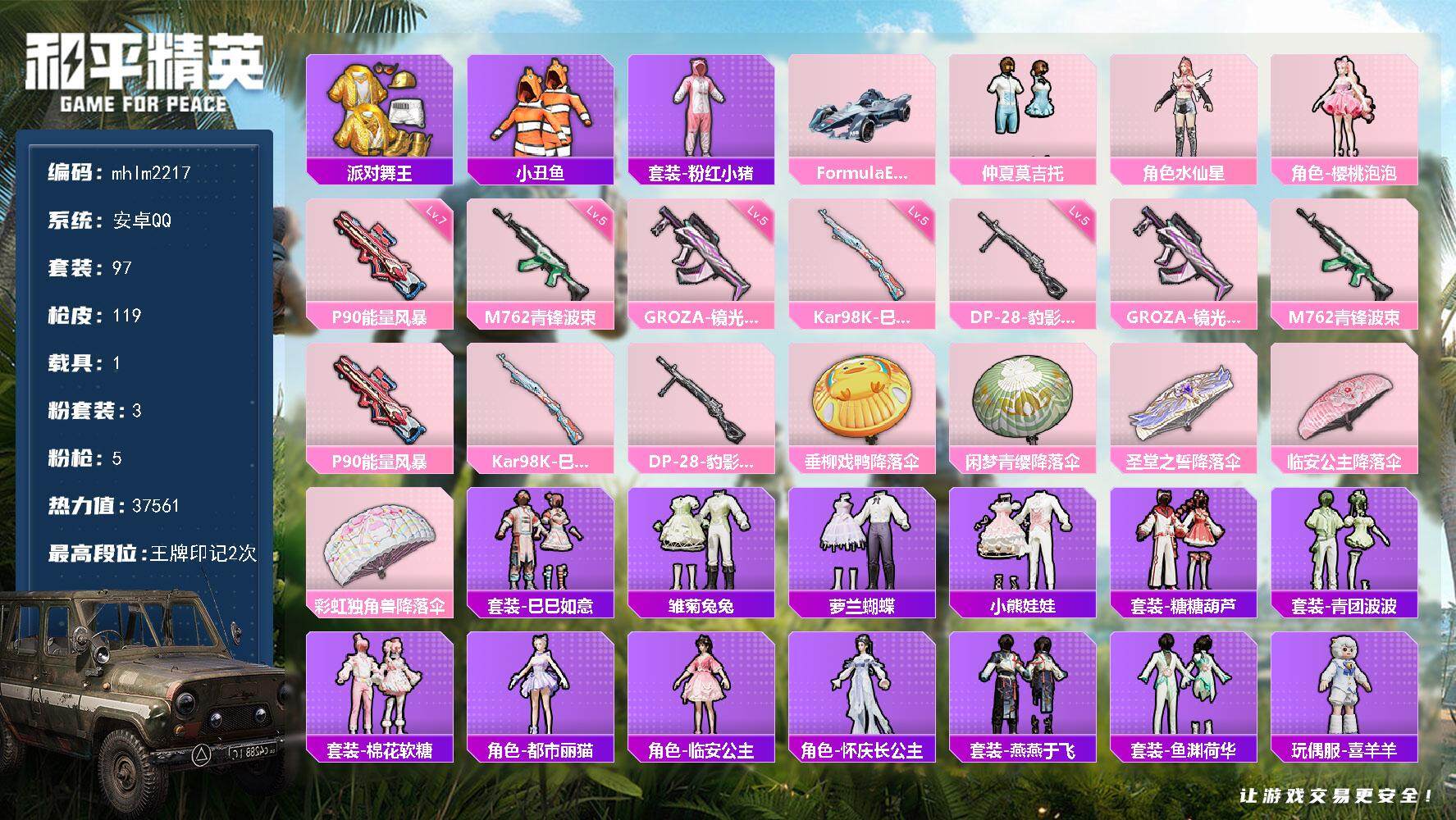 [13843446]【mhlm2217】安卓 手q-3粉装-5特效呛-1载具-0粉色飞行器-37561热力值-2王牌印记-97套装-119呛皮 【热门品类】:套装-派对舞王,套装-小丑鱼,套装-粉红小猪 【粉色载具】:fmula e gen2(巅峰兰) 【粉色套装】:粉装-仲夏莫吉托,角色-水仙星,角色-樱桃泡泡 【粉色呛皮等级】:groza-镜光银凌五级,m762-青锋波束五级,p90-能量风暴七级,kar98k-巳巳如意五级,dp-28-豹影疾电五级 【粉色呛皮】:groza-镜光银凌,m762-青锋波束,p90-能量风暴,kar98k-巳巳如意,dp-28-豹影疾电 【粉色降落伞】:垂柳戏鸭降落伞,闲梦青缨降落伞,圣堂之誓降落伞,临安公主降落伞,彩虹独角兽降落伞 【稀有套装】:套装-巳巳如意,套装-雏菊兔兔,套装-萝兰蝴蝶,套装-小熊娃娃,套装-糖糖葫芦,套装-青团波波,套装-棉花软糖,角色-都市丽猫,角色-临安公主,角色-怀庆长公主,套装-燕燕于飞,套装-鱼渊荷华,玩偶服-喜羊羊 【稀有呛皮】:akm-灼热熔岩,akm-缤纷海域,akm-龙的传人,m16a4-幻世战舞者,m16a4-蓝色火焰,scar-l-炫彩节奏,scar-l-玉兔迎春,scar-l-粉锦千层,m416-糯团青竹,m416-蓝色火焰,aug-甜蜜菠萝,aug-耀粉歌者,aug-闲梦青缨,q-妙趣可丽,m762-天降萌叽,m762-橘柚倾心,ac-val-天降萌叽,ac-val-彩虹甜喵,ac-val-快闪甜心,蜜獾-娇憨猪猪,uzi-啾咪啾咪,uzi-娇憨猪猪,uzi-红色方程式,ump45-仲夏莫吉托,ump45-生命誓言,ump45-蓝色火焰,vect-彩虹符号,汤姆逊-天降萌叽,汤姆逊-耀粉歌者,aks-74u-鬼刀,p90-快闪甜心,p90-金蛇镇世,p90-巳巳如意,kar98k-彩虹符号,kar98k-炫彩节奏,kar98k-红色方程式,m24-炫彩节奏,sks-炫彩节奏,sks-糯团青竹,mini14-穿刺龙虾,mini14-耀粉歌者,mk14-是爱神辣,slr-娇憨猪猪,m417-惊鸿侠骨,mk20-h-快闪甜心,m200-惊鸿侠骨,s686-红色方程式,s686-巳巳如意,s1897-炫彩节奏,s12k-娇憨猪猪,s12k-幻世战舞者,m249-彩虹符号,m
