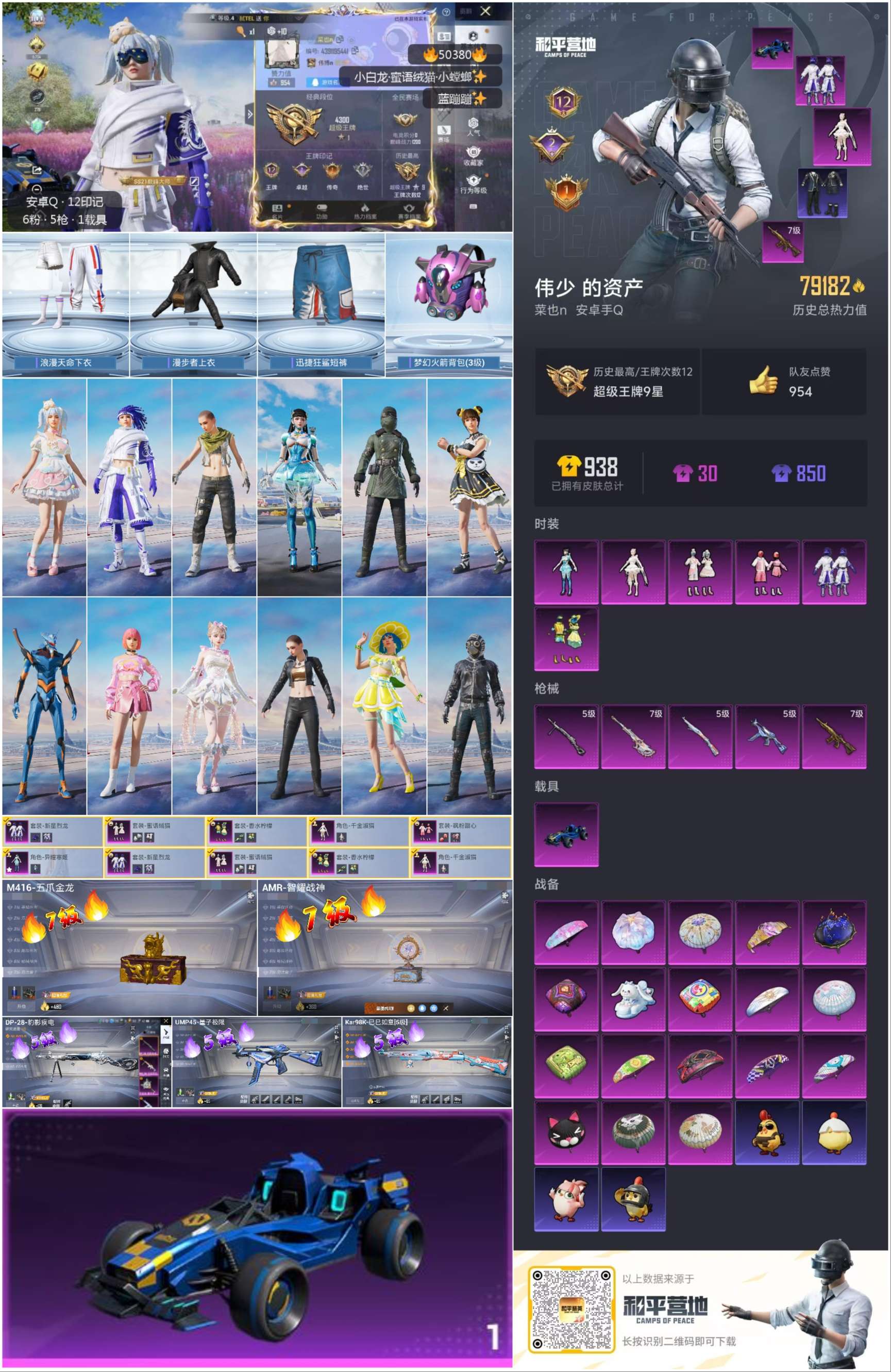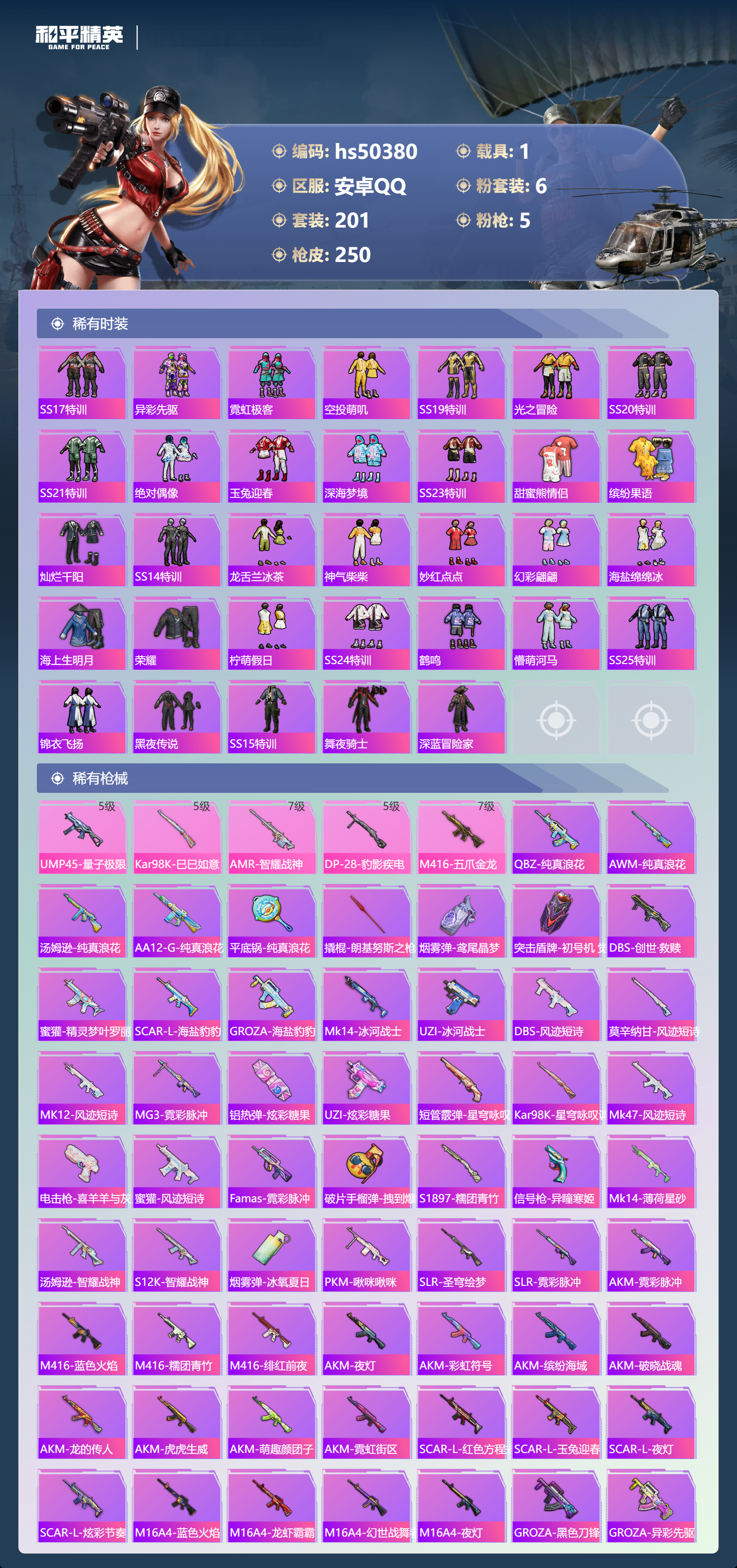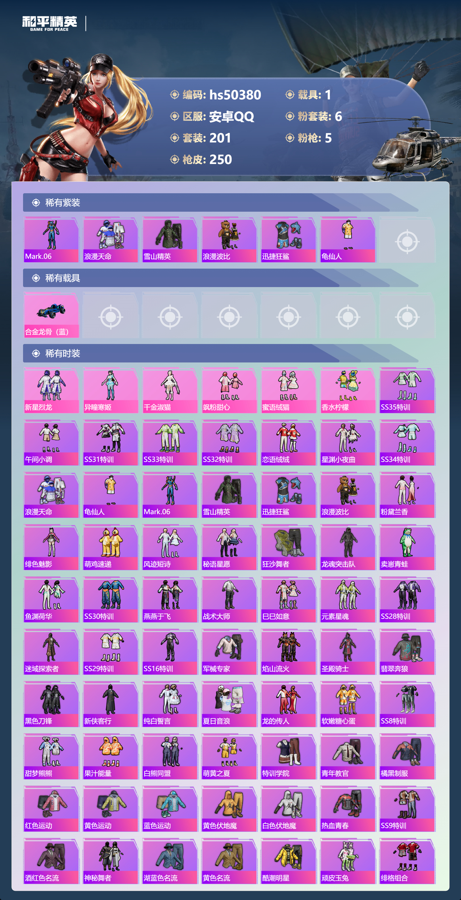 安卓手q-12王牌印记-6粉装-5特效呛-1载具-79182热力值-201套装-250呛皮-2卓越印记-1传奇印记【6粉装】角色-千金淑猫套装-飒粉甜心套装-蜜语绒猫套装-香水柠檬套装-新星烈龙角色-异瞳寒姬【5特效呛】dp-28-豹影疾电/5级kar98k-巳巳如意/5级ump45-量子极限/5级amr-智耀战神/7级m416-五爪金龙/7级【6稀有紫装】mark.06浪漫天