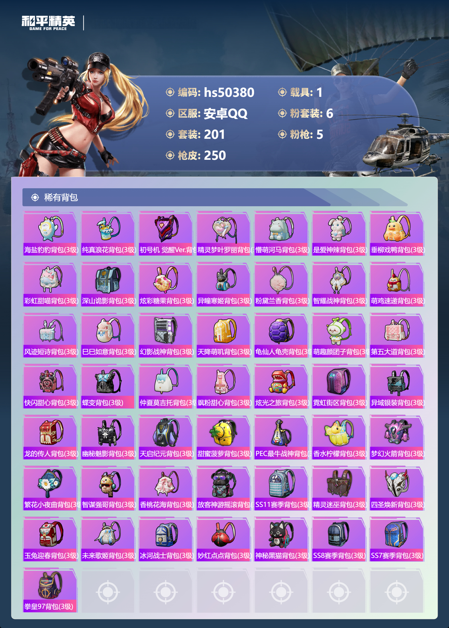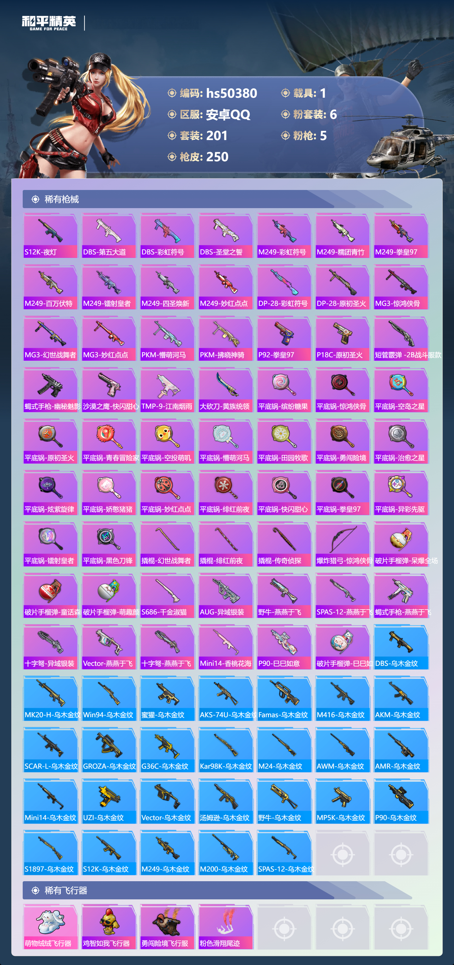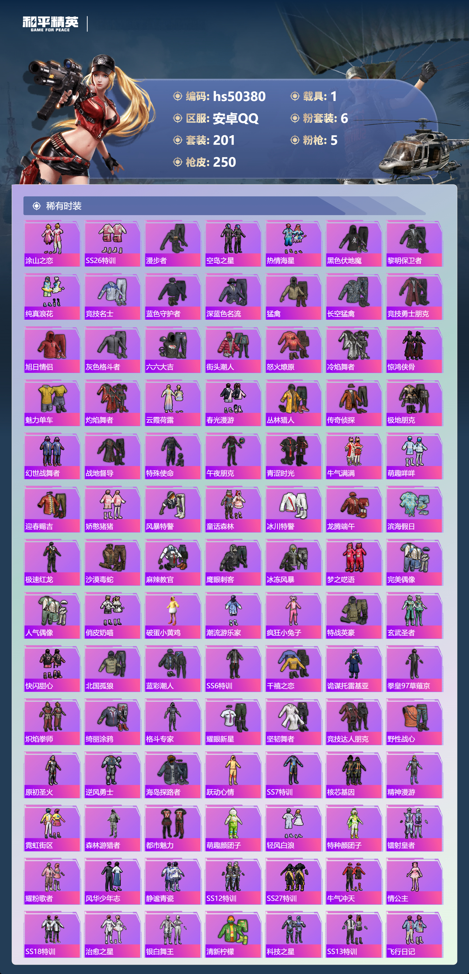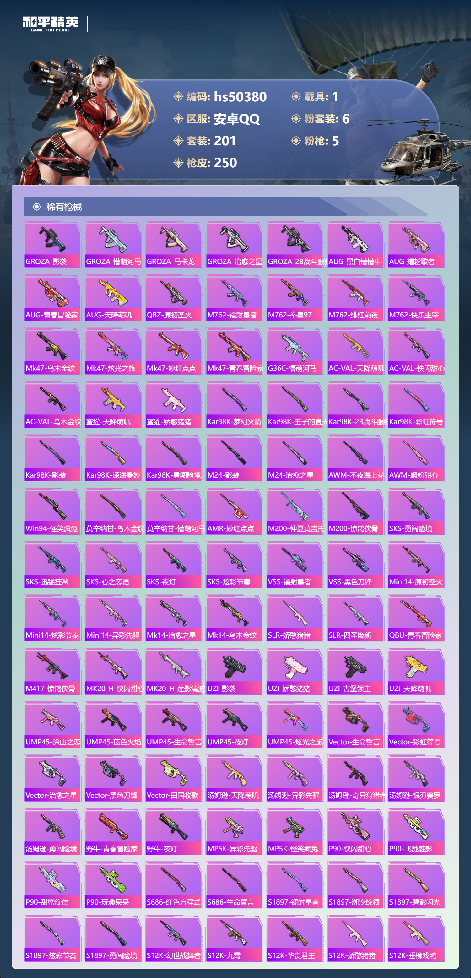 安卓手q-12王牌印记-6粉装-5特效呛-1载具-79182热力值-201套装-250呛皮-2卓越印记-1传奇印记【6粉装】角色-千金淑猫套装-飒粉甜心套装-蜜语绒猫套装-香水柠檬套装-新星烈龙角色-异瞳寒姬【5特效呛】dp-28-豹影疾电/5级kar98k-巳巳如意/5级ump45-量子极限/5级amr-智耀战神/7级m416-五爪金龙/7级【6稀有紫装】mark.06浪漫天