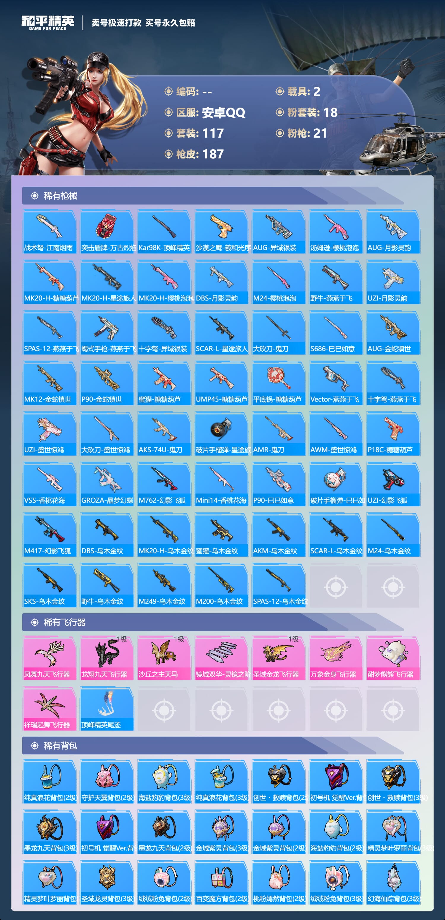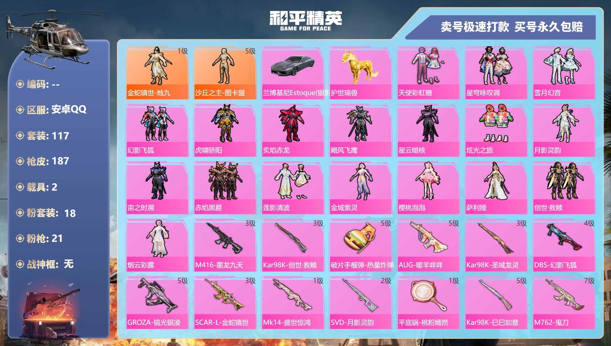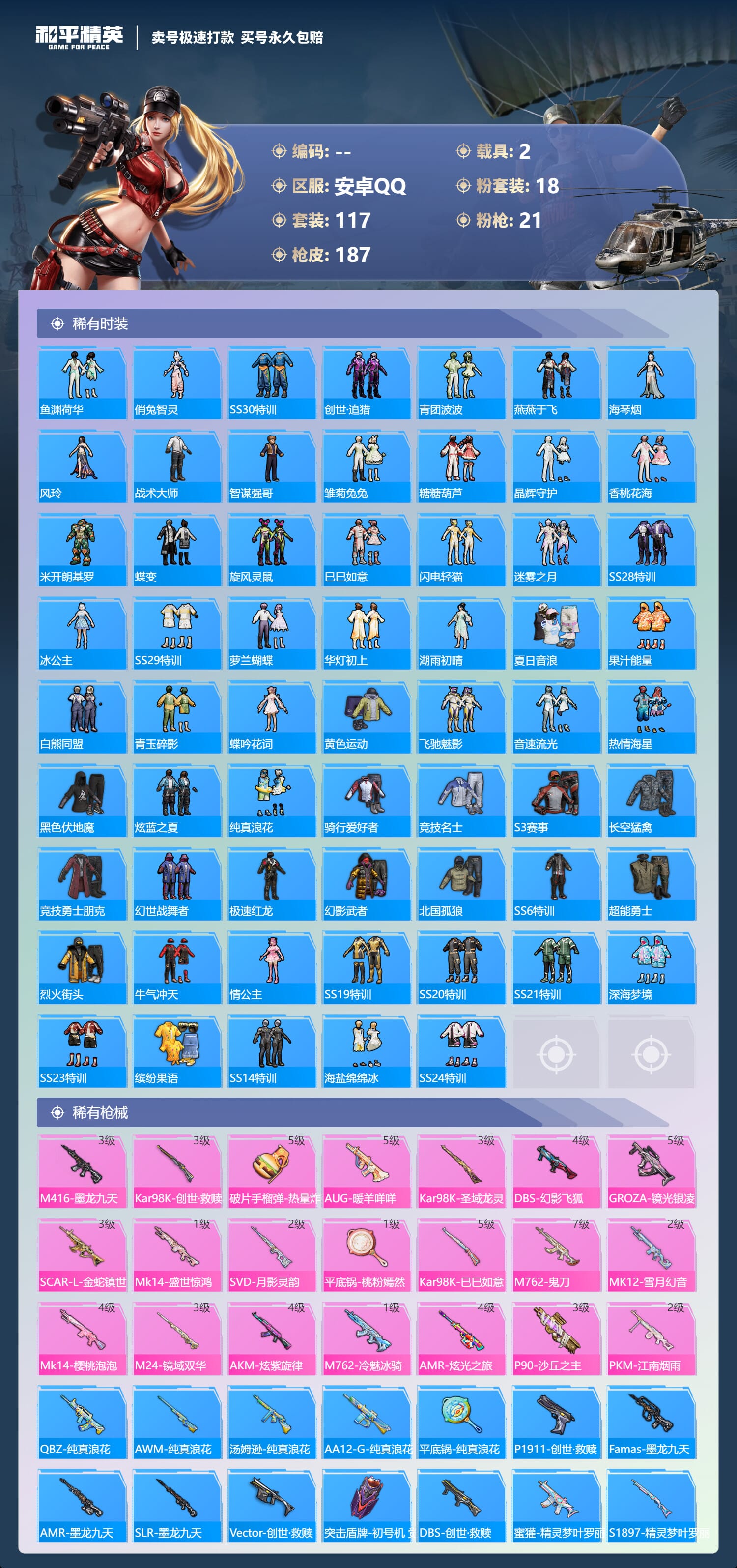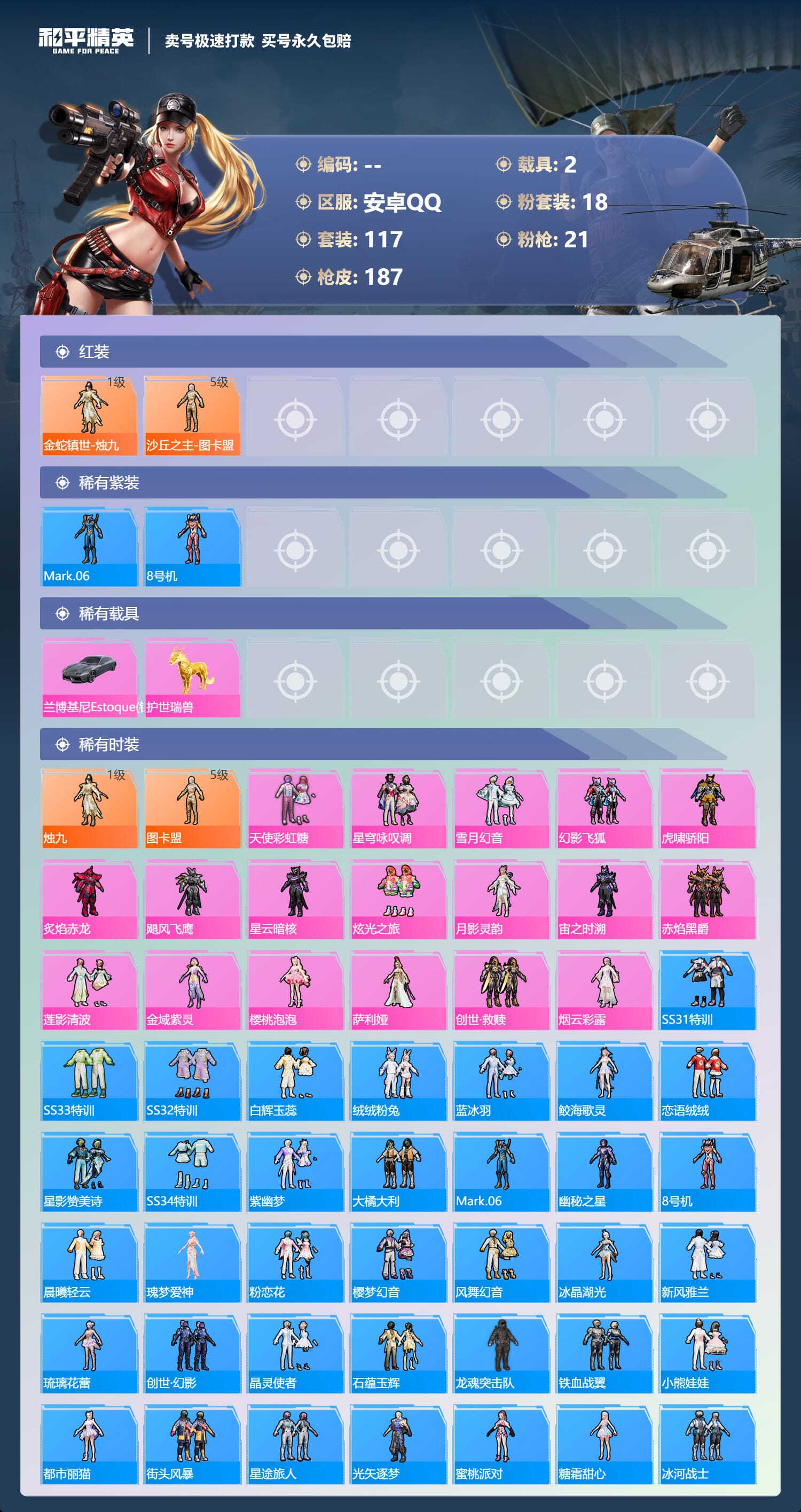 [13864555]实名: 可修改 时装数: 423 载具数: 2 呛械数: 187 战备数: 134 神级装扮: 沙丘之主-图卡盟金蛇镇世-烛九 热门装扮: 天使彩虹糖炙焰赤龙飓风飞鹰虎啸骄阳赤焰黑爵炫光之旅宙之时溯星云暗核莲影清波烟云彩露创世·救赎金域紫灵月影灵韵萨利娅幻影飞狐樱桃泡泡雪月幻音星穹咏叹调 载具: 兰博基尼estoque银翼灰护世瑞兽 稀有呛皮: akm炫紫旋律m762冷魅冰骑amr炫光之旅p90沙丘之主m24镜域双华pkm江南烟雨m416墨龙九天kar98k创世·救赎groza-镜光银凌svd-月影灵韵kar98k-巳巳如意scar-l金蛇镇世mk14-盛世惊鸿m762-鬼刀aug-暖羊咩咩dbs-幻影飞狐破片手留单-热量炸弹mk14-樱桃泡泡平底锅-桃粉嫣然mk12-雪月幻音kar98k-圣域龙灵