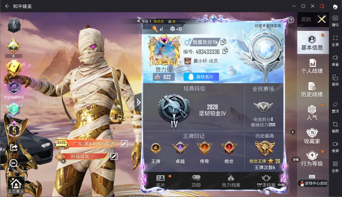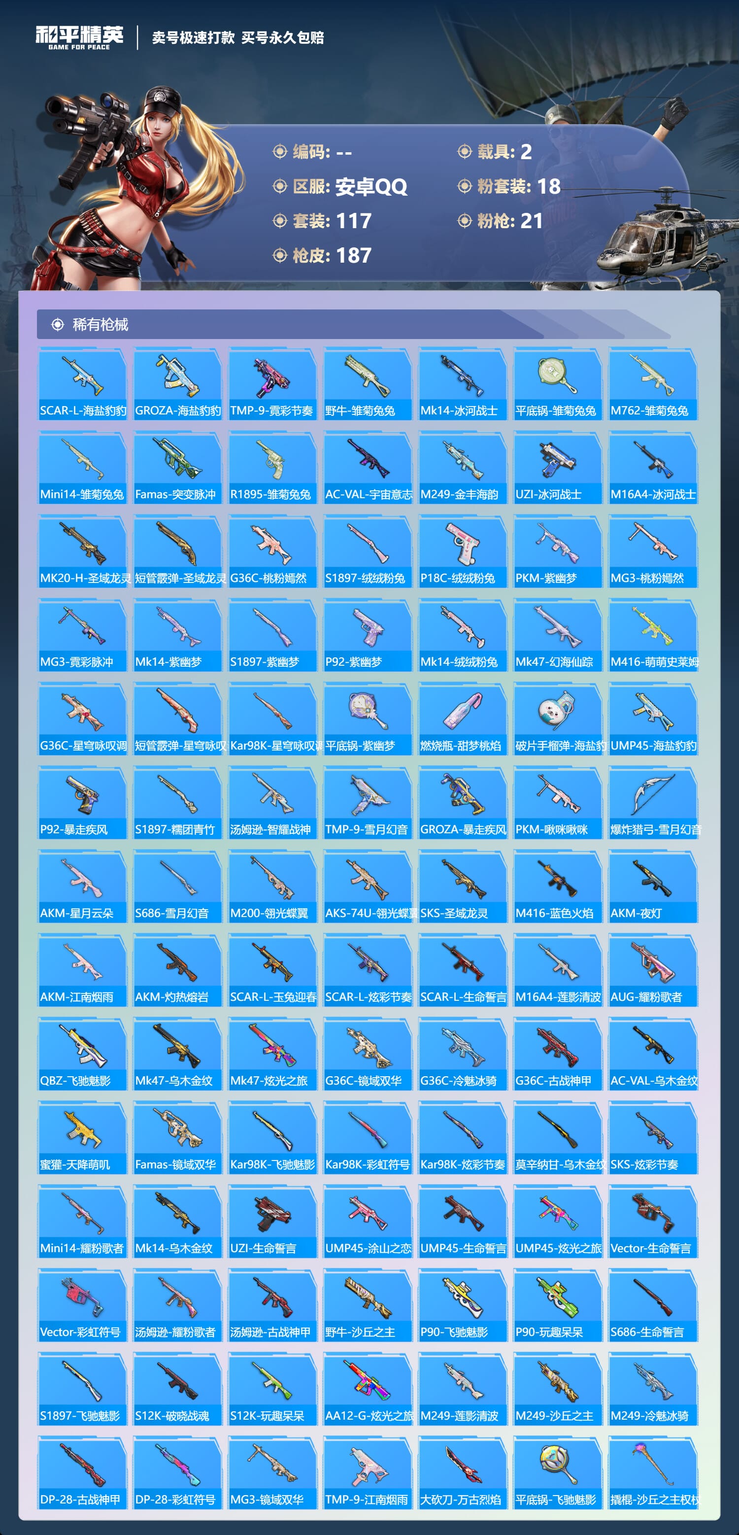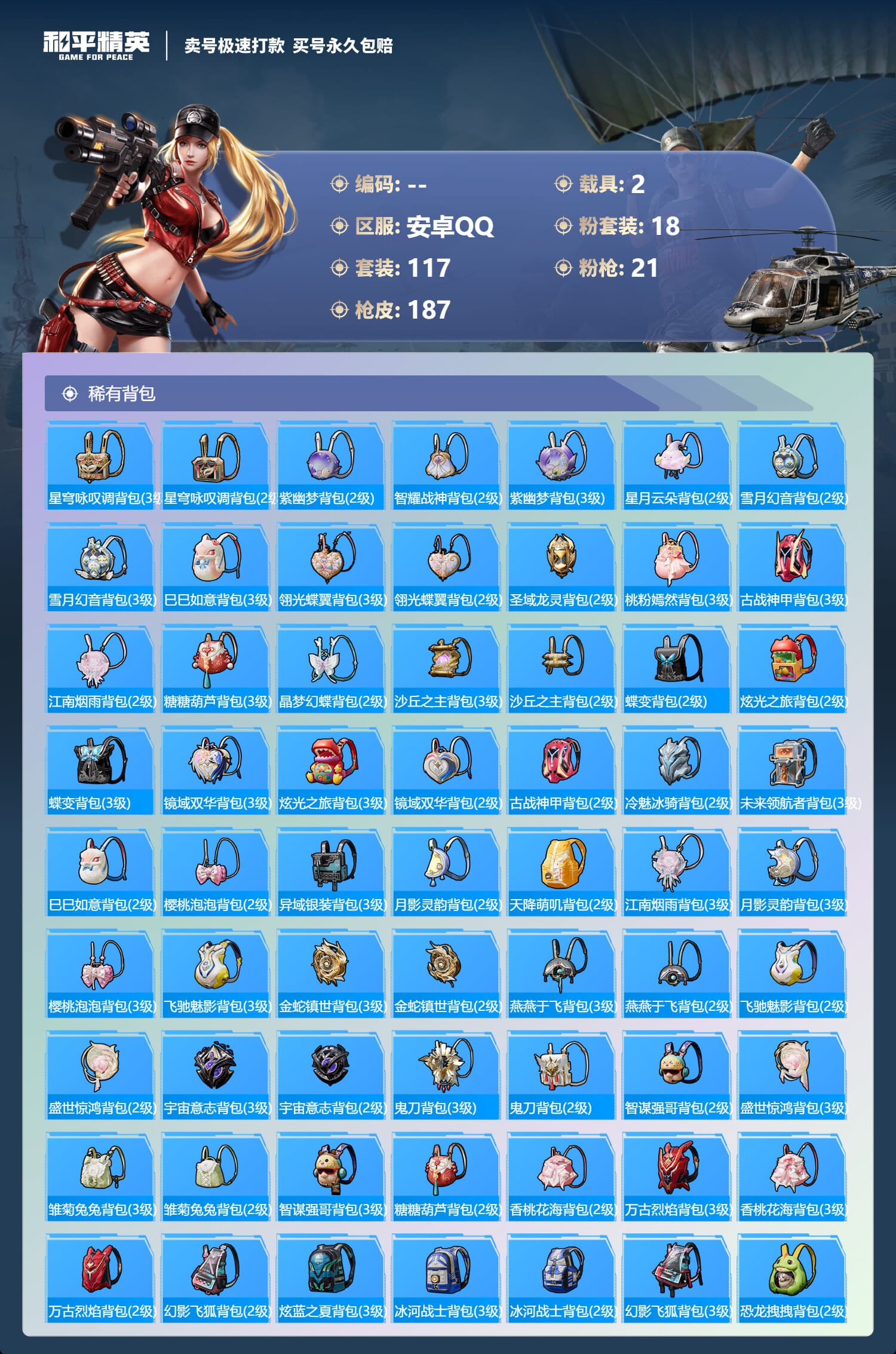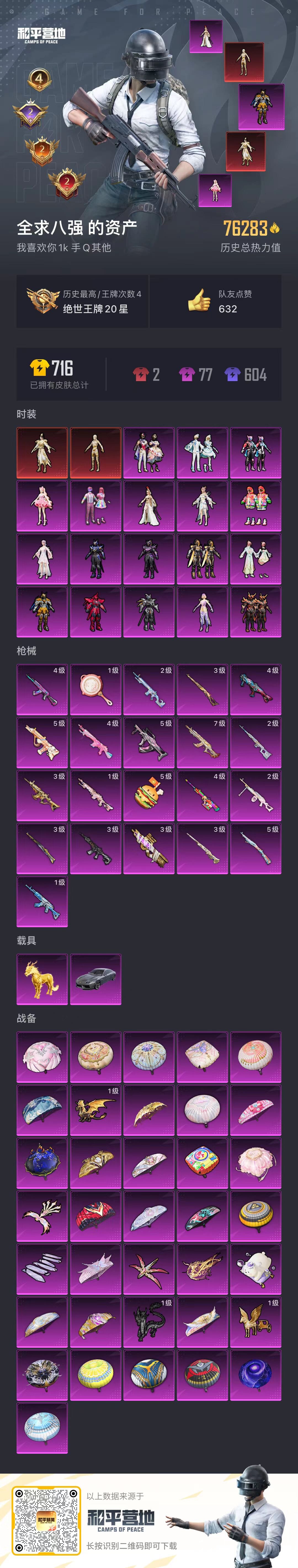 [13864555]实名: 可修改 时装数: 423 载具数: 2 呛械数: 187 战备数: 134 神级装扮: 沙丘之主-图卡盟金蛇镇世-烛九 热门装扮: 天使彩虹糖炙焰赤龙飓风飞鹰虎啸骄阳赤焰黑爵炫光之旅宙之时溯星云暗核莲影清波烟云彩露创世·救赎金域紫灵月影灵韵萨利娅幻影飞狐樱桃泡泡雪月幻音星穹咏叹调 载具: 兰博基尼estoque银翼灰护世瑞兽 稀有呛皮: akm炫紫旋律m762冷魅冰骑amr炫光之旅p90沙丘之主m24镜域双华pkm江南烟雨m416墨龙九天kar98k创世·救赎groza-镜光银凌svd-月影灵韵kar98k-巳巳如意scar-l金蛇镇世mk14-盛世惊鸿m762-鬼刀aug-暖羊咩咩dbs-幻影飞狐破片手留单-热量炸弹mk14-樱桃泡泡平底锅-桃粉嫣然mk12-雪月幻音kar98k-圣域龙灵