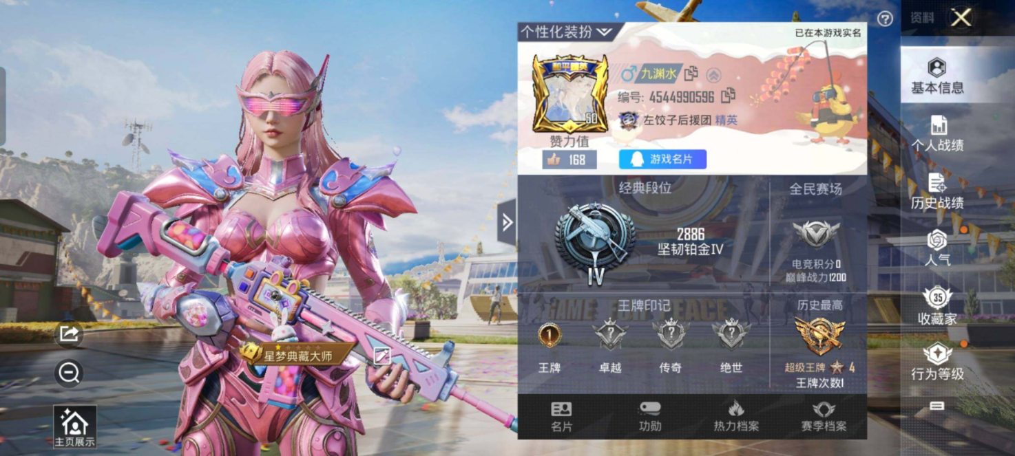 5763【2粉装3特效呛】守护天翼 朗月武圣 m416-电玩时刻 5级 kar98k-巳巳如意 5级 ump45-量子极限 5级 【2热门】龟仙人 破蛋小黄鸡 25816热力值 1王牌印记 历史超级王牌4星 67套装 93呛皮 营地id:
