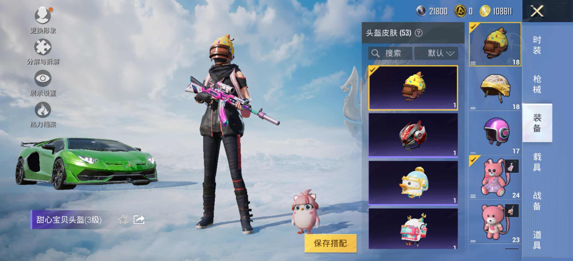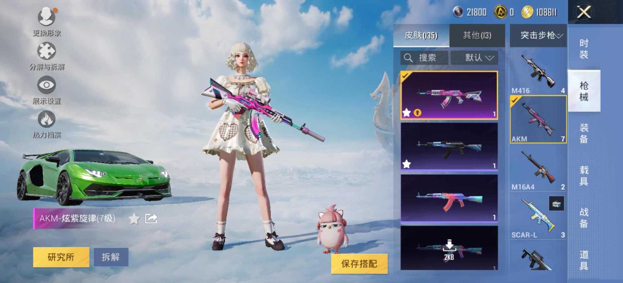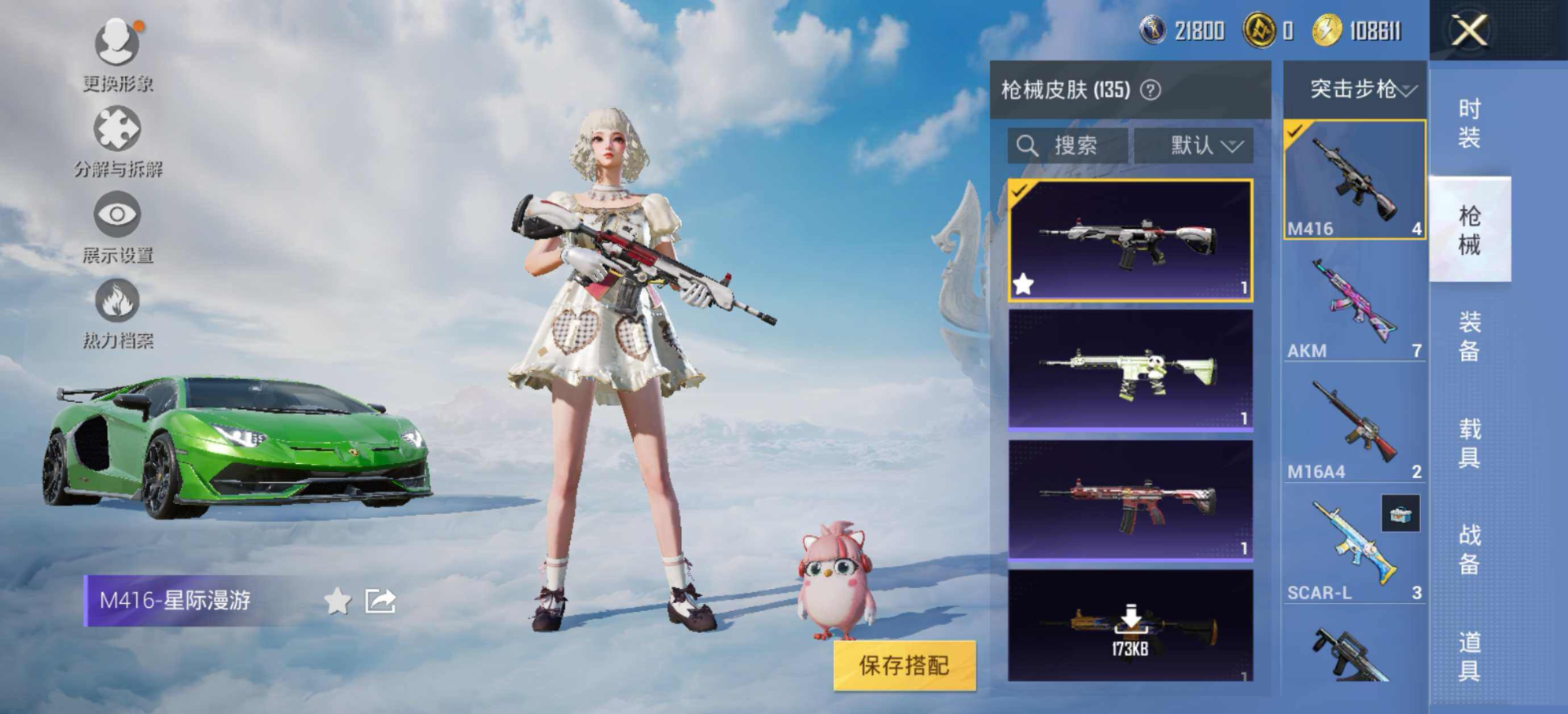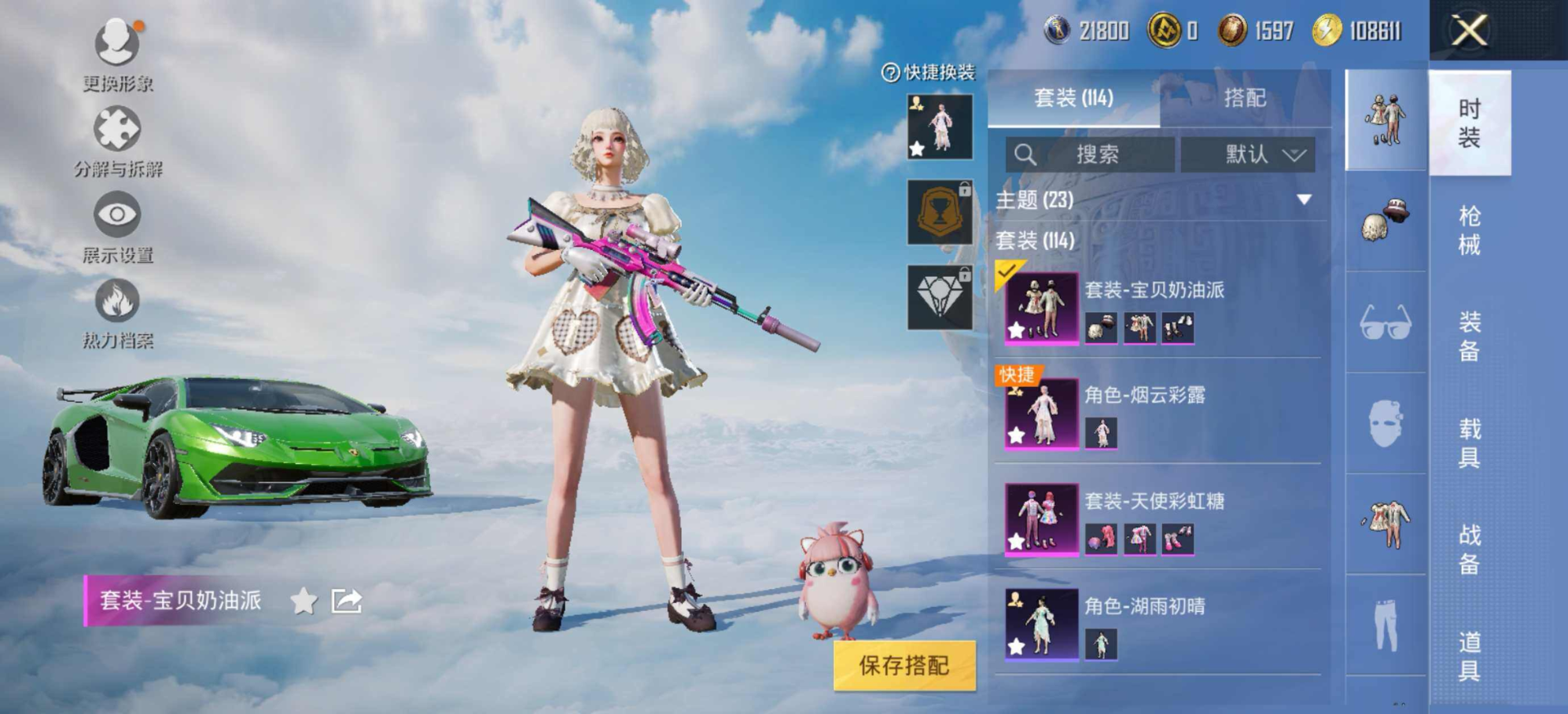 5884 历史无敌战神m416-星际漫游 44413热力值 9王牌印记114套装 134呛皮 【1载具】 兰博svj绿色 【1稀有】 【3粉装】 宝贝奶油派 天使彩虹糖 烟云彩露 【5特效呛】 akm-炫紫旋律 7级 kar98k-巳巳如意 5级 dp-28-豹影疾电 5级 mk14-甜梦熊击 5级 盐雾蛋-电雾迷城 5级 【1飞行器】 齐天大圣飞行器 【10热门】