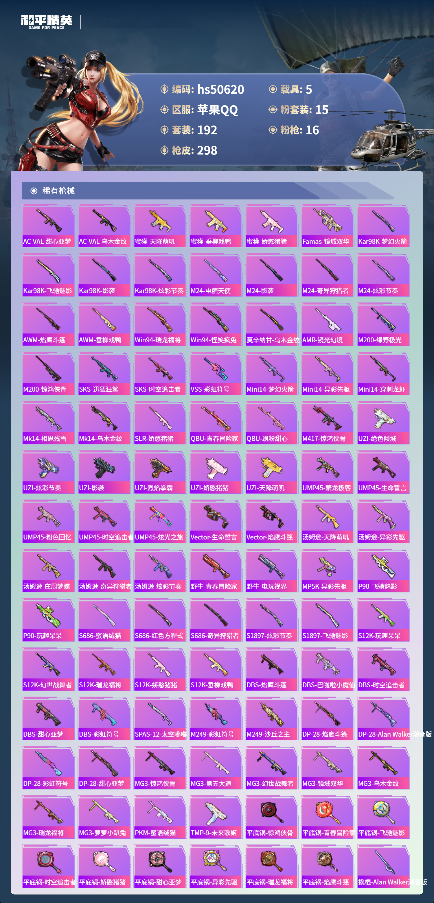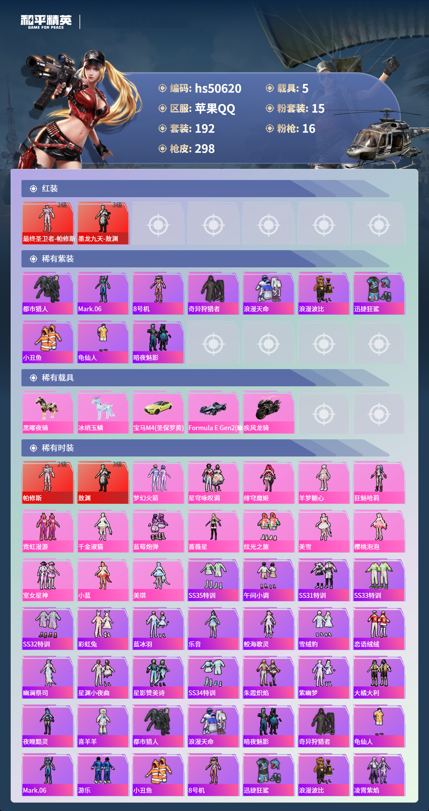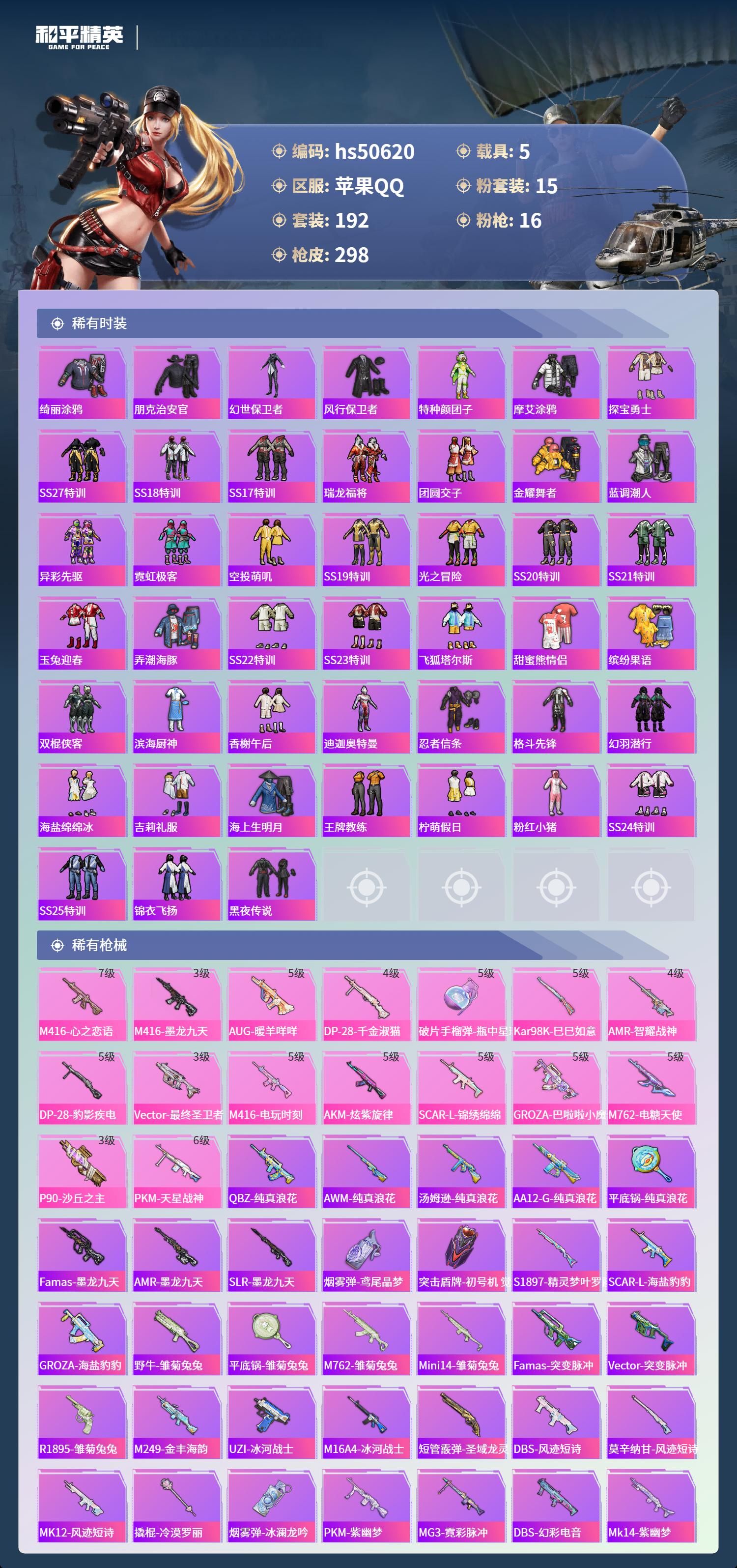 hs50620 苹果手q-11王牌印记-2红装-15粉装-16特效呛-5载具-热力值-192套装-298呛皮-4卓越印记-3传奇印记【2红装】最终圣卫者-帕修斯/2级墨龙九天-敖渊/3级【15粉装】套装-炫光之旅角色-小蓝套装-蓝莓炮弹角色-千金淑猫角色-樱桃泡泡套装-霓虹漫游套装-星穹咏叹调角色-绯穹魔姬角色-羊梦糖心套装-室女星神角色-狂魅哈莉角色-蔷薇