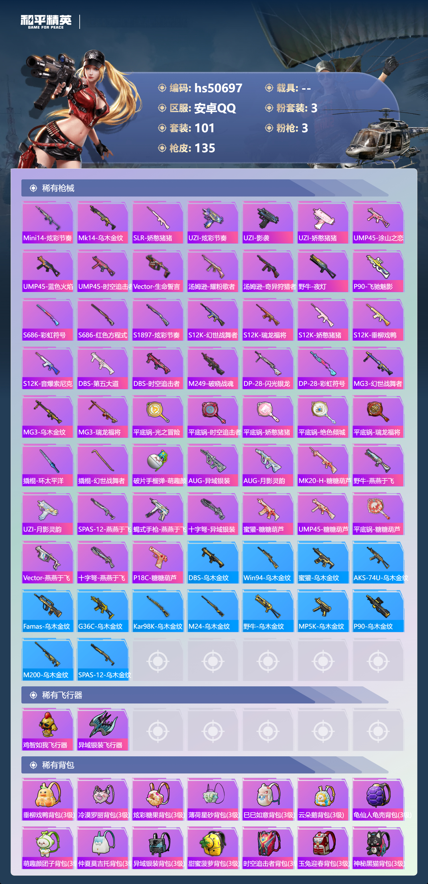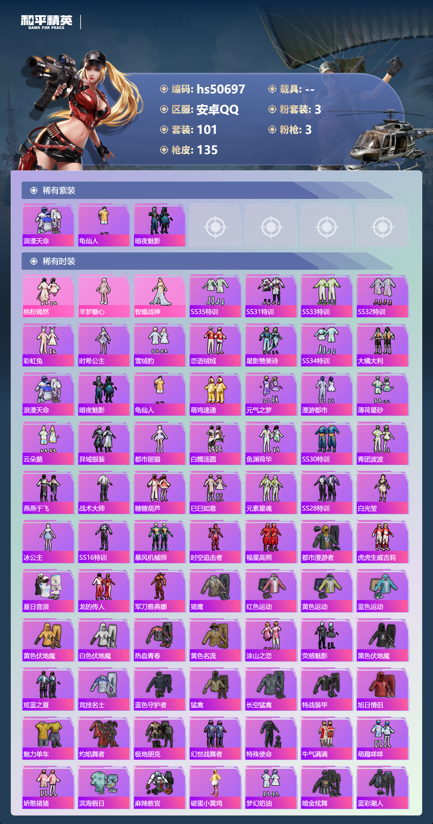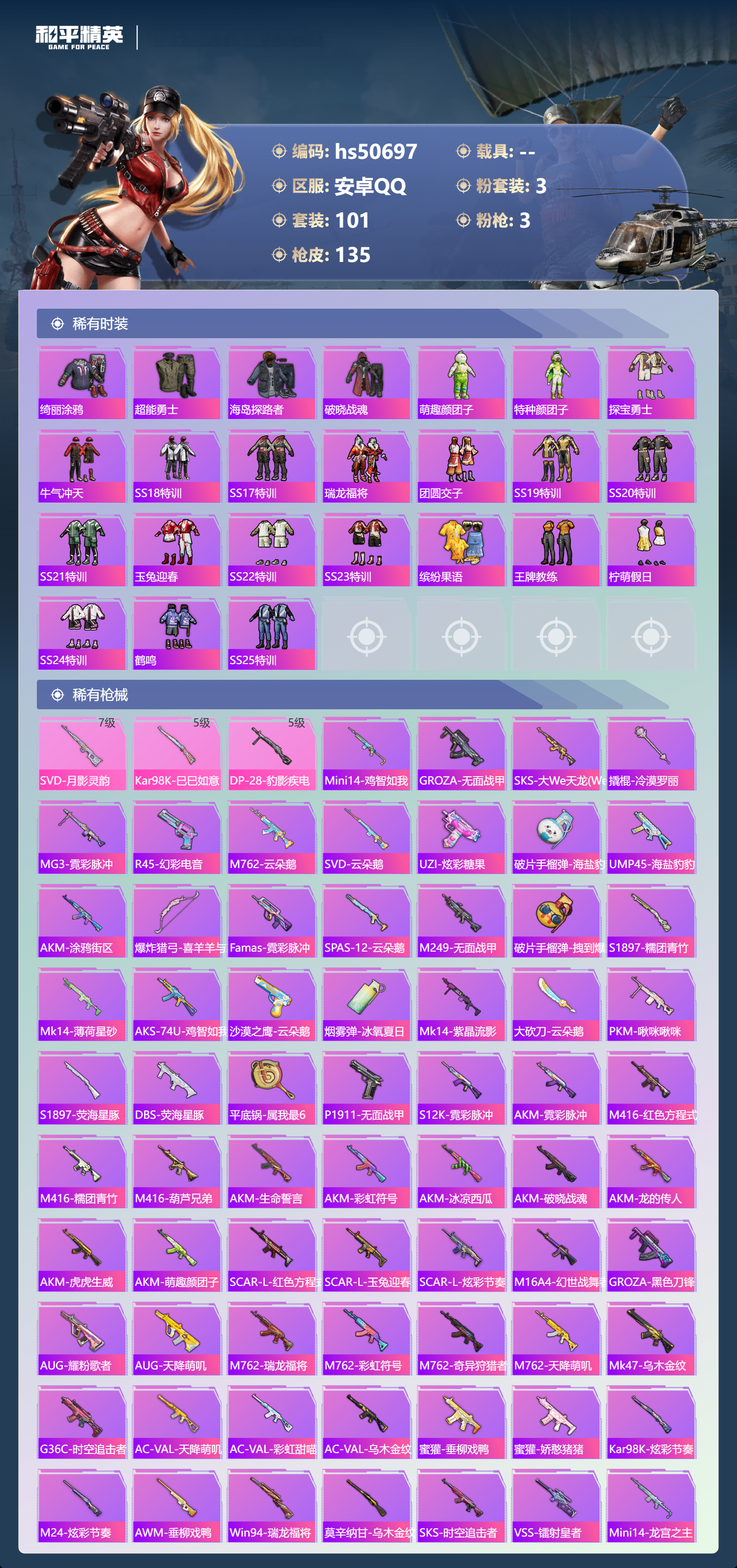 hs50697 安卓手q-7王牌印记-3粉装-3特效呛-37429热力值-101套装-135呛皮【3粉装】套装-桃粉嫣然角色-智耀战神角色-羊梦糖心【3特效呛】dp-28-豹影疾电/5级svd-月影灵韵/7级kar98k-巳巳如意/5级【3稀有紫装】浪漫天命龟仙人暗夜魅影【101稀有时装】桃粉嫣然羊梦糖心智耀战神ss35特训ss31特训ss33特训ss32特训彩虹