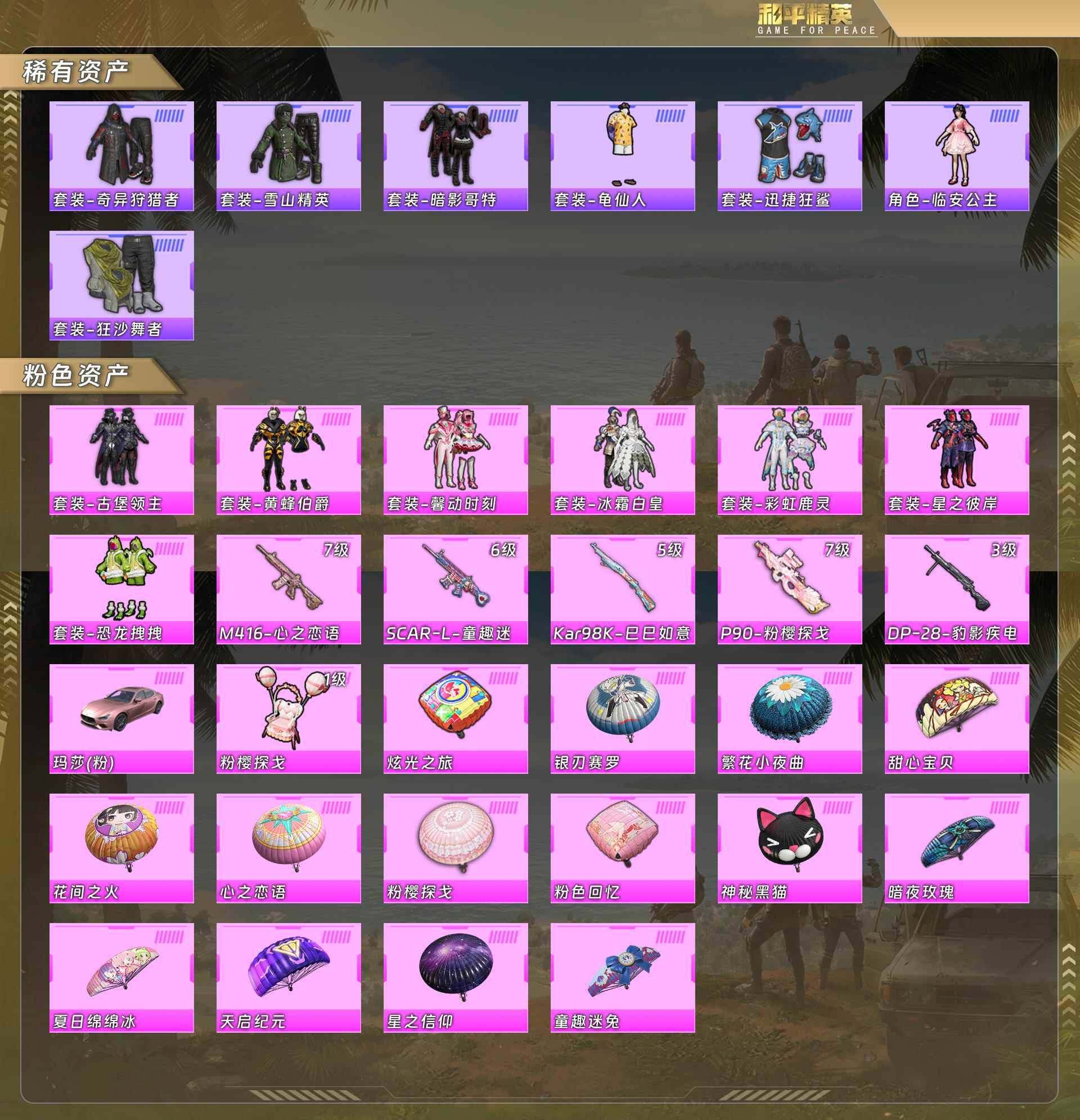 身法号-地铁满天赋/粉熊背包/奇异狩猎者/暗影哥特/迅捷狂鲨/角狂沙舞者/古堡领主/黄蜂伯爵/馨动时刻/冰霜白皇/彩虹鹿灵/星之彼岸/恐龙拽拽/m416-心之恋语[7级]/scar-l-童趣迷兔[6级]/kar98k-巳巳如意[5级]/p90-粉樱探戈[7级]/dp-28-豹影疾电[3级]/玛莎拉蒂ghibli粉/没战神框 hp3109 【热门品类】:套装-深海小丑鱼,套装-小丑鱼,套装-奇异狩猎者,套装-龟仙人,套装-暗影哥特 【粉色载具】:玛莎拉蒂ghibli(粉) 【粉色套装】:粉装-古堡领主,粉装-黄蜂伯爵,粉装-冰霜白皇,粉装-星之彼岸,粉装-馨动时刻,粉装-彩虹鹿灵,粉装-恐龙拽拽 【粉色呛皮等级】:scar-l-童趣迷兔六级,m416-心之恋语七级,p90-粉樱探戈七级,kar98k-巳巳如意五级,dp-28-豹影疾电三级 【粉色呛皮】:scar-l-童趣迷兔,m416-心之恋语,p90-粉樱探戈,kar98k-巳巳如意,dp-28-豹影疾电 【粉色飞行器】:粉樱探戈飞行器 【粉色降落伞】:粉色回忆降落伞,甜心宝贝降落伞,天启纪元降落伞,星之信仰降落伞,神秘黑猫降落伞,繁花小夜曲降落伞,心之恋语降落伞,花间之火降落伞,夏日绵绵冰降落伞,银刃赛罗降落伞,童趣迷兔降落伞,暗夜玫瑰降落伞,粉樱探戈降落伞,炫光之旅降落伞 【稀有套装】:套装-龟仙人,角色-临安公主 【稀有呛皮】:akm-pel轰鸣竞梦者,akm-夜灯,akm-奇异狩猎者,akm-恐龙拽拽,akm-灼热熔岩,akm-玉龙,akm-破晓战魂,akm-萌趣颜团子,akm-虎虎生威,akm-阿狸红,akm-霓虹街区,akm-龙的传人,m16a4-机械英豪,m16a4-魔法学院,scar-l-暗夜玫瑰,scar-l-炫彩节奏,scar-l-粉色回忆,scar-l-龙宫之主,m416-夜灯,m416-梨园星光,m416-潮汐统领,m416-神秘黑猫,m416-红色方程式,groza-彩虹符号,groza-懵萌河马,groza-林间仙鹿,groza-治愈之星,groza-马卡龙,groza-黑色刀锋,aug-流星咚咚,aug-青春冒险家,aug-魔法学院,q-原初圣火,q-彩虹符号,q-神秘黑猫,q-赛罗,q-飞驰魅影,m762-深海曼妙,m762-牛气冲天,m762-瑞龙福将,m762-镭射皇者,mk47-洛神天依,mk47-炫光之旅,mk47-百万伏特,mk47-粉色回忆,mk47-青春冒险家,g36c-不夜海上花,g36c-懵萌河马,g36c-时空追击者,g36c-暗夜玫瑰,g36c-绮梦青鸾,g36c-金风玉露,famas-桃粉嫣然,uzi-众神之王,uzi-啾咪啾咪,uzi-天降萌叽,uzi-炫彩节奏,ump45-时空追击者,ump45-炫光之旅,ump45-生命誓言,ump45-粉色回忆,vect-pel轰鸣竞梦者,vect-夜灯,vect-彩虹符号,vect-治愈之星,vect-生命誓言,vect-黑色刀锋,汤姆逊-勇闯险境,汤姆逊-天降萌叽,汤姆逊-庄周梦蝶,汤姆逊-林间仙鹿,野牛-机械英豪,野牛-青春冒险家,mp5k-众神之王,mp5k-梨园星光,p90-甜蜜旋律,p90-飞驰魅影,p90-巳巳如意,kar98k-勇闯险境,kar98k-彩虹符号,kar98k-炫彩节奏,kar98k-飞驰魅影,m24-治愈之星,m24-众神之王,m24-奇异狩猎者,awm-不夜海上花,sks-勇闯险境,sks-时空追击者,sks-炫彩节奏,vss-粉色回忆,vss-镭射皇者,vss-黑色刀锋,mini14-原初圣火,mini14-梦幻火箭,mini14-穿刺龙虾,mini14-金鼠迎春,mk14-治愈之星,mk14-童趣迷兔,win94-机械英豪,win94-瑞龙福将,slr-众神之王,slr-四圣焕新,qbu-不夜海上花,qbu-锦绣火鲤,qbu-青春冒险家,莫辛纳甘-懵萌河马,m417-惊鸿侠骨,m200-惊鸿侠骨,s686-不夜海上花,s686-奇异狩猎者,s686-生命誓言,s686-红色方程式,s1897-勇闯险境,s1897-天启纪元,s1897-神秘黑猫,s1897-镭射皇者,s1897-飞驰魅影,s12k-玩趣呆呆,s12k-瑞龙福将,s12k-龙虾霸霸,s12k-机械英豪,s12k-智耀战神,dbs-时空追击者,aa12-g-炫光之旅,m249-古堡领主,m249-四圣焕新,m249-彩虹符号,m249-破晓战魂,m249-镭射皇者,dp-28-原初圣火,dp-28-彩虹符号,dp-28-清新柠檬,mg3-幻世战舞者,mg3-惊鸿侠骨,mg3-瑞龙福将,pkm-懵萌河马,p18c-原初圣火,p18c-百万伏特,爆炸猎弓-惊鸿侠骨,大砍刀-粉色回忆 【其他套装】:套装-ss5特训,套装-ss6特训,套装-ss7特训,套装-ss8特训,套装-ss9特训,套装-ss10特训,套装-ss11特训,套装-ss12特训,套装-ss13特训,套装-ss14特训,套装-ss15特训,套装-ss16特训,套装-ss17特训,套装-ss18特训,套装-ss19特训,套装-ss24特训,套装-ss25特训,套装-ss26特训,套装-ss27特训,套装-ss28特训,套装-ss29特训,套装-丛林猎人,套装-传奇侦探,套装-冰川格斗者,套装-北国孤狼,套装-吉莉礼服,套装-完美偶像,套装-怒火燎原,套装-战地名士,套装-探宝勇士,套装-春日漫步,套装-暗影哥特,套装-格斗先锋,套装-沙漠兵团,套装-海上生明月,套装-海岛探路者,套装-潮流先锋,套装-灰色格斗者,套装-热血青春,套装-牛气满满,套装-特战装甲,套装-特训学院,套装-狂沙舞者,套装-猛禽,套装-王牌教练,套装-甜蜜告白,套装-甜蜜熊情侣,套装-疯狂小兔子,套装-白色伏地魔,套装-破蛋小黄鸡,套装-神秘领域,套装-福星高照,套装-空岛之星,套装-突袭者,套装-竞技勇士朋克,套装-竞技名士,套装-竞技达人朋克,套装-绯格组合,套装-耀眼新星,套装-耀粉歌者,套装-萌趣颜团子,套装-萌黄之夏,套装-虎虎生威吉莉,套装-跃动心情,套装-迎春赐吉,套装-都市漫游者,套装-都市魅力,套装-野性战魂,套装-长空猛禽,套装-霓虹街区,套装-青春校园,套装-青涩时光,套装-青玉碎影,套装-飞行日记,套装-魅力单车,套装-鹤鸣,套装-黄色名流,套装-龙腾端午,套装-龟仙人,套装-奇异狩猎者,套装-金耀舞者,套装-蓝调潮人,套装-战地菁英,套装-装甲骑士,套装-深海小丑鱼,套装-呆萌铁蟹,套装-迅捷狂鲨,套装-坚韧舞者,套装-黑夜传说,套装-初雨海棠,套装-金环蜂王,套装-雪山精英,套装-圣诞大吉,套装-核芯基因,套装-精神漫游,套装-黑色刀锋,套装-威严将相,套装-银河圣歌,套装-迷域探索者,套装-清香五月粽,套