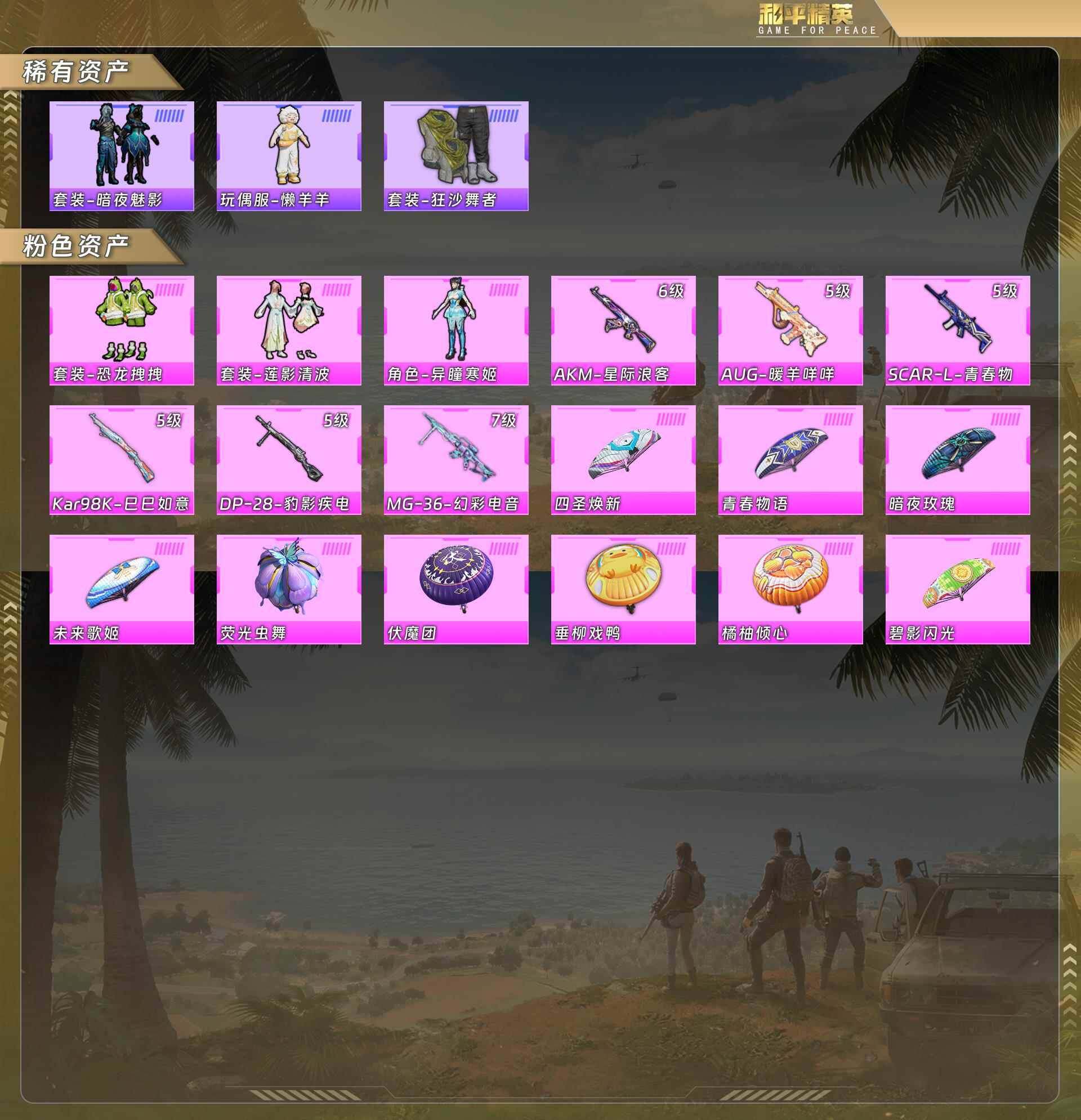 地铁满天赋/暗夜魅影/狂沙舞者/恐龙拽拽/莲影清波/异瞳寒姬/km-星际浪客[6级]/aug-暖羊咩咩[5级]/scar-l-青春物语[5级]/kar98k-巳巳如意[5级]/dp-28-豹影疾电[5级]/mg-36-幻彩电音[7级]/没战神框 hp3256 【粉色套装】:粉装-恐龙拽拽,粉装-莲影清波,角色-异瞳寒姬 【粉色呛皮等级】:akm-星际浪客六级,scar-l-青春物语五级,aug-暖羊咩咩五级,kar98k-巳巳如意五级,dp-28-豹影疾电五级,mg-36-幻彩电音七级 【粉色呛皮】:akm-星际浪客,scar-l-青春物语,aug-暖羊咩咩,kar98k-巳巳如意,dp-28-豹影疾电,mg-36-幻彩电音 【粉色降落伞】:伏魔团降落伞,四圣焕新降落伞,荧光虫舞降落伞,暗夜玫瑰降落伞,碧影闪光降落伞,青春物语降落伞,橘柚倾心降落伞,垂柳戏鸭降落伞,未来歌姬降落伞 【稀有套装】:套装-巳巳如意,套装-火种守卫者,套装-朱霞炽焰,套装-凌霄紫焰,玩偶服-懒羊羊 【稀有呛皮】:akm-夜灯,akm-彩虹符号,akm-灼热熔岩,akm-生命誓言,akm-筑梦精灵,akm-虎虎生威,akm-霓虹街区,akm-龙的传人,m16a4-幻世战舞者,m16a4-甜心亚梦,scar-l-玉兔迎春,scar-l-红色方程式,m416-夜灯,m416-糯团青竹,m416-红色方程式,m416-魔法学院,groza-异彩先驱,groza-彩虹符号,groza-治愈之星,groza-田园牧歌,aug-天降萌叽,aug-幻梦音符,aug-耀粉歌者,q-彩虹符号,q-洛神天依,q-飞驰魅影,m762-天降萌叽,m762-牛气冲天,m762-瑞龙福将,mk47-洛神天依,g36c-暗夜玫瑰,g36c-炙焰牛王,g36c-星穹咏叹调,ac-val-天降萌叽,ac-val-甜心亚梦,蜜獾-垂柳戏鸭,蜜獾-天降萌叽,蜜獾-娇憨猪猪,arx-凌霄紫焰,uzi-天降萌叽,uzi-娇憨猪猪,uzi-炫彩节奏,uzi-红色方程式,ump45-生命誓言,ump45-蓝色火焰,vect-彩虹符号,vect-治愈之星,vect-田园牧歌,vect-香水柠檬,汤姆逊-天降萌叽,汤姆逊-异彩先驱,汤姆逊-炫彩节奏,mp5k-异彩先驱,mp5k-蓝莓炮弹,js9-凌霄紫焰,p90-飞驰魅影,kar98k-彩虹符号,kar98k-炫彩节奏,kar98k-红色方程式,kar98k-飞驰魅影,m24-治愈之星,m24-炫彩节奏,m24-香水柠檬,m24-幻彩电音,awm-垂柳戏鸭,awm-庄周梦蝶,awm-恐龙拽拽,sks-炫彩节奏,vss-田园牧歌,vss-碧影闪光,mini14-异彩先驱,mini14-梦幻火箭,mini14-穿刺龙虾,mini14-筑梦精灵,mk14-山经魅狐,mk14-治愈之星,win94-瑞龙福将,slr-娇憨猪猪,s686-彩虹符号,s686-生命誓言,s1897-炫彩节奏,s1897-碧影闪光,s1897-飞驰魅影,s12k-瑞龙福将,s12k-垂柳戏鸭,s12k-夜灯,s12k-娇憨猪猪,s12k-幻世战舞者,dbs-彩虹甜喵,dbs-彩虹符号,dbs-甜心亚梦,dbs-幻彩电音,spas-12-田园牧歌,m249-星之彼岸,m249-破晓战魂,m249-糯团青竹,dp-28-彩虹符号,dp-28-橘柚倾心,dp-28-甜心亚梦,dp-28-齐天大圣,mg3-幻世战舞者,mg3-瑞龙福将,mg3-青空秋雨,mg-36-凌霄紫焰,p92-凌霄紫焰,tmp-9-雪月幻音,爆炸猎弓-天星战神,撬棍-冷漠罗丽,平底锅-凌霄紫焰 【其他套装】:套装-ss11特训,套装-ss12特训,套装-ss14特训,套装-ss15特训,套装-ss17特训,套装-ss18特训,套装-ss19特训,套装-ss20特训,套装-ss21特训,套装-ss22特训,套装-ss23特训,套装-ss24特训,套装-ss25特训,套装-ss27特训,套装-ss28特训,套装-ss29特训,套装-夏日音浪,套装-幻世战舞者,套装-探宝勇士,套装-格斗先锋,套装-海岛探路者,套装-灰色格斗者,套装-炫蓝之夏,套装-牛气冲天,套装-牛气满满,套装-特战装甲,套装-特殊使命,套装-狂沙舞者,套装-玉兔迎春,套装-甜蜜熊情侣,套装-疯狂小兔子,套装-白熊同盟,套装-白色伏地魔,套装-破蛋小黄鸡,套装-福星高照,套装-空投萌叽,套装-竞技名士,套装-绯格组合,套装-萌黄之夏,套装-蓝色守护者,套装-虎虎生威吉莉,套装-酒红色名流,套装-酷潮明星,套装-长空猛禽,套装-青玉碎影,套装-顽皮玉兔,套装-魅力单车,套装-麻辣教官,套装-黄色名流,套装-黄色运动,套装-战地菁英,套装-冰爽海盐,套装-浪漫樱花,套装-治愈之星,套装-科技之星,套装-快乐星愿,套装-暗夜魅影,套装-瑞龙福将,套装-团圆交子,套装-异彩先驱,套装-霓虹极客,套装-飞驰魅影,套装-音速流光,套装-雪兔飞飞,套装-沁蓝冰爽,套装-浓情蜜辣,套装-智慧隐士,套装-猎梦纪元,套装-甜心亚梦,套装-虚音幻奏,套装-娇憨猪猪,套装-萌趣咩咩,套装-暖心熊熊,套装-夏雨游龙,套装-梦幻奶油,套装-田园牧歌,套装-轻风白浪,套装-和煦暖阳 【稀有头盔】:精灵迷巫头盔(3级),梦幻火箭头盔(3级),深海小丑鱼头盔(2级),深海小丑鱼头盔(1级) 【稀有背包】:梦幻火箭背包(1级),深海小丑鱼背包(3级) 【营地id】:748794196