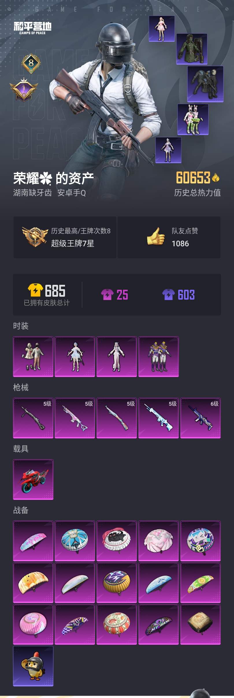 【和平精英】【lyhp16645】4粉5特1载具 都市 奶油 4粉装,5特效呛,1载具,历史最高段位:超级王牌7星 王牌印记8次 热力值:60653,151套装,200呛械,211装备,96战备;套装:套装-宝贝奶油派,套装-王牌四分卫,角色-冷漠罗丽,角色-冰魄,套装-特训学院,套装-猎鹰,套装-青年教官,套装-橘黑制服,套装-红色运动,套装-黄色运动,套装-蓝色运动,套装-黄色伏地魔,套装-白色伏地魔,套装-黑色伏地魔,套装-骑行爱好者,套装-竞技名士,套装-深蓝色名流,套装-酒红色名流,套装-湖蓝色名流,套装-黄色名流,套装-猛禽,套装-长空猛禽,套装-漫步者,套装-竞技勇士朋克,套装-蓝色守护者,套装-海岛探路者,套装-旭日情侣,套装-冷焰舞者,套装-灼焰舞者,套装-都市猎人,套装-青羽突袭者,套装-刚毅裁决者,套装-战地督导,套装-特殊使命,套装-黄色格斗者,套装-灰色格斗者,套装-甜蜜告白,套装-沙漠毒蛇,套装-鹰眼刺客,套装-冰冻风暴,套装-完美偶像,套装-人气偶像,套装-幻影武者,套装-蓝彩潮人,套装-魅力单车,套装-绮丽涂鸦,套装-坚韧舞者,套装-竞技达人朋克,套装-超能勇士,套装-破晓战魂,套装-都市魅力,套装-荣耀,套装-沙漠兵团,套装-丛林猎人,套装-雪山精英,套装-极地朋克,套装-幻世战舞者,套装-清新柠檬,套装-金耀舞者,套装-蓝调潮人,套装-缤纷果语,套装-滨海厨神,套装-极速红龙,套装-格斗先锋,套装-旷野奇兵,套装-海上生明月,套装-麻辣教官,套装-粉红小猪,套装-疯狂小兔子,套装-深蓝冒险家,套装-迷域探索者,套装-ss5特训,套装-金鼠迎春,套装-北国孤狼,套装-ss6特训,套装-跃动心情,套装-ss7特训,套装-黑色刀锋,套装-核芯基因,套装-精神漫游,套装-霓虹街区,套装-软嫩糖心蛋,套装-潮萌小黄鸭,套装-ss8特训,套装-众神之王,套装-智慧之神,套装-摇滚狂鲨,套装-夏日音浪,套装-ss9特训,套装-顽皮玉兔,套装-牛气满满,套装-朱雀圣者,套装-原初圣火,套装-逆风勇士,套装-萌趣颜团子,套装-特种颜团子,套装-ss12特训,套装-牛气冲天,套装-ss18特训,套装-耀粉歌者,套装-电音精灵,角色-赛罗奥特曼,套装-吉莉礼服,套装-暗夜魅影,套装-ss17特训,套装-醒狮腾龙,套装-瑞龙福将,套装-团圆交子,套装-福星高照,套装-雪兔飞飞,套装-虎虎生威吉莉,套装-ss19特训,套装-浓情蜜辣,套装-极速竞梦,套装-飞驰魅影,套装-音速流光,套装-炫蓝之夏,套装-ss20特训,套装-甜心亚梦,套装-虚音幻奏,套装-ss21特训,套装-萌趣咩咩,套装-娇憨猪猪,套装-玉兔迎春,套装-ss22特训,套装-绯格组合,套装-ss23特训,套装-ss24特训,套装-ss25特训,套装-漫游都市,套装-明鸳圣池,套装-恋语绒绒,角色-绯色魅影,套装-异域银装,套装-ss31特训,套装-ss33特训,套装-云朵鹅,套装-ss32特训,套装-顶瓜瓜,套装-雪绒豹,套装-大橘大利,角色-时希公主,角色-灵公主,套装-霓虹热舞,套装-元气之梦,套装-ss34特训,套装-擎苍青焰,套装-朱霞炽焰,套装-凌霄紫焰,套装-薄荷星砂,套装-ss35特训;呛皮:akm-灼热熔岩,akm-生命誓言,akm-奇异狩猎者,akm-天启纪元,akm-霓虹街区,akm-夜灯,akm-涂鸦街区,akm-彩虹符号,akm-萌趣颜团子,akm-虎虎生威,akm-霓彩脉冲,akm-乌木金纹,ac-val-甜心亚梦,ac-val-乌木金纹,ac-val-天降萌叽,m416-夜灯,m416-蓝色火焰,m416-红色方程式,m416-暗夜行者,m416-乌木金纹,groza-影袭,groza-黑色刀锋,groza-恐龙拽拽,groza-紫翼圣骑,groza-海盐豹豹,groza-乌木金纹,m762-牛气冲天,m762-瑞龙福将,m762-彩虹甜喵,m762-云朵鹅,m762-乌木金纹,mk47-乌木金纹,famas-霓彩脉冲,famas-乌木金纹,6级scar-l-青春物语,scar-l-红色方程式,scar-l-扶摇飞仙,scar-l-暗夜玫瑰,scar-l-碧影闪光,scar-l-玉兔迎春,scar-l-冷漠罗丽,scar-l-乌木金纹,g36c-蛇蝎美人,g36c-乌木金纹,q-神秘黑猫,q-原初圣火,q-彩虹符号,q-飞驰魅影,q-乌木金纹,m16a4-蓝色火焰,m16a4-甜心亚梦,m16a4-幻世战舞者,m16a4-乌木金纹,蜜獾-娇憨猪猪,蜜獾-鸡智如我,蜜獾-乌木金纹,aug-耀粉歌者,aug-异域银装,aug-紫晶流影,aug-乌木金纹,arx-凌霄紫焰,5级kar98k-巳巳如意,kar98k-勇闯险境,kar98k-马卡龙,kar98k-彩虹符号,kar98k-炫彩节奏,kar98k-飞驰魅影,kar98k-乌木金纹,m24-影袭,m24-众神之王,m24-炫彩节奏,m24-乌木金纹,m200-乌木金纹,awm-恐龙拽拽,awm-乌木金纹,win94-瑞龙福将,win94-乌木金纹,svd-冷漠罗丽,svd-云朵鹅,莫辛纳甘-乌木金纹,mini14-金玉无双,mini14-穿刺龙虾,mini14-原初圣火,mini14-炫彩节奏,mini14-耀粉歌者,mini14-乌木金纹,sks-夜灯,sks-勇闯险境,sks-心之恋语,sks-炫彩节奏,sks-乌木金纹,vss-粉色回忆,vss-华贵君王,vss-黑色刀锋,5级mk20-h-海螺星光,mk20-h-乌木金纹,5级mk14-甜梦熊击,mk14-乌木金纹,mk14-薄荷星砂,slr-众神之王,slr-娇憨猪猪,m417-玩趣呆呆,ump45-夜灯,ump45-蓝色火焰,ump45-生命誓言,ump45-海盐豹豹,ump45-乌木金纹,p90-飞驰魅影,p90-筑梦精灵,p90-乌木金纹,汤姆逊-奇异狩猎者,汤姆逊-勇闯险境,汤姆逊-耀粉歌者,汤姆逊-炫彩节奏,汤姆逊-天降萌叽,汤姆逊-乌木金纹,uzi-红色方程式,uzi-影袭,uzi-金风玉露,uzi-众神之王,uzi-炫彩节奏,uzi-娇憨猪猪,uzi-炫彩糖果,uzi-乌木金纹,mp5k-众神之王,mp5k-梨园星光,vect-生命誓言,vect-黑色刀锋,vect-彩虹符号,vect-暗夜玫瑰,vect-乌木金纹,js9-凌霄紫焰,aks-74u-乌木金纹,野牛-乌木金纹,s12k-幻影战神,s12k-夜灯,s12k-华贵君王,s12k-pel轰鸣竞梦者,s12k-瑞龙福将,s12k-娇憨猪猪,s12k-幻世战舞者,s12k-乌木金纹,s1897-天启纪元,s1897-勇闯险境,s1897-炫彩节奏,s1897-飞驰魅影,s1897-星夜魔法师,s1897-糯团青竹,s1897-乌木金纹,s686-未来战士,s6