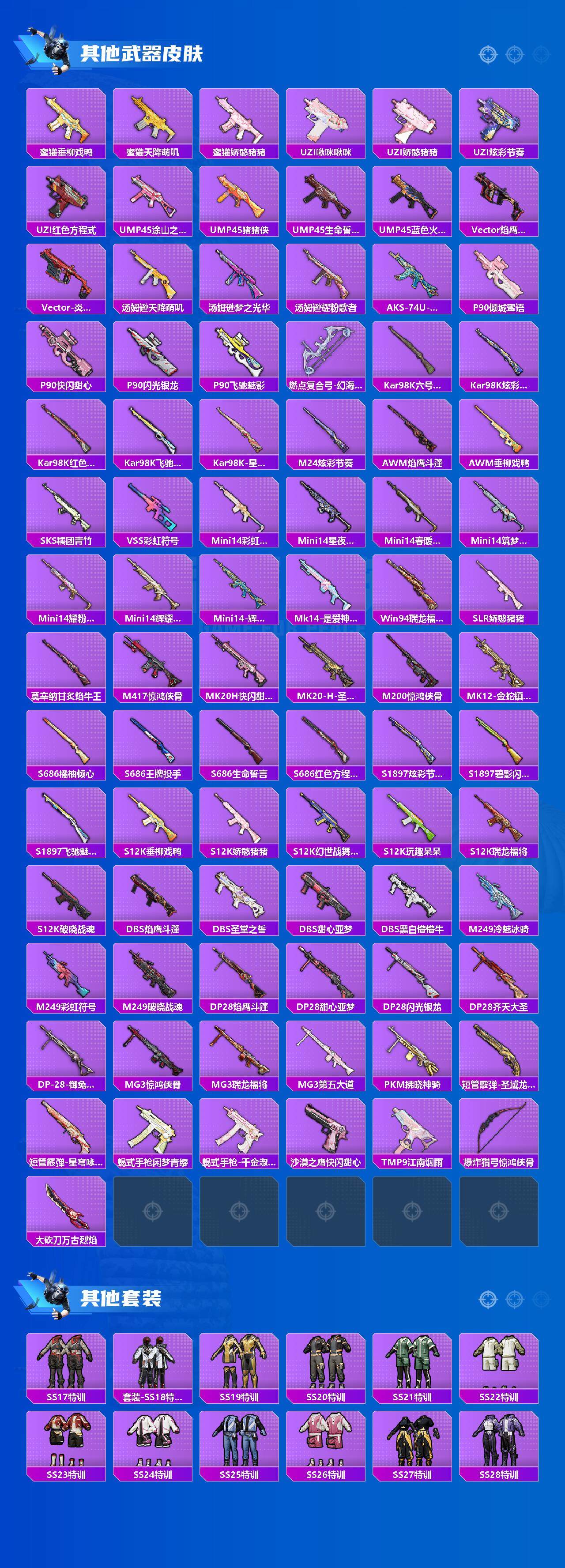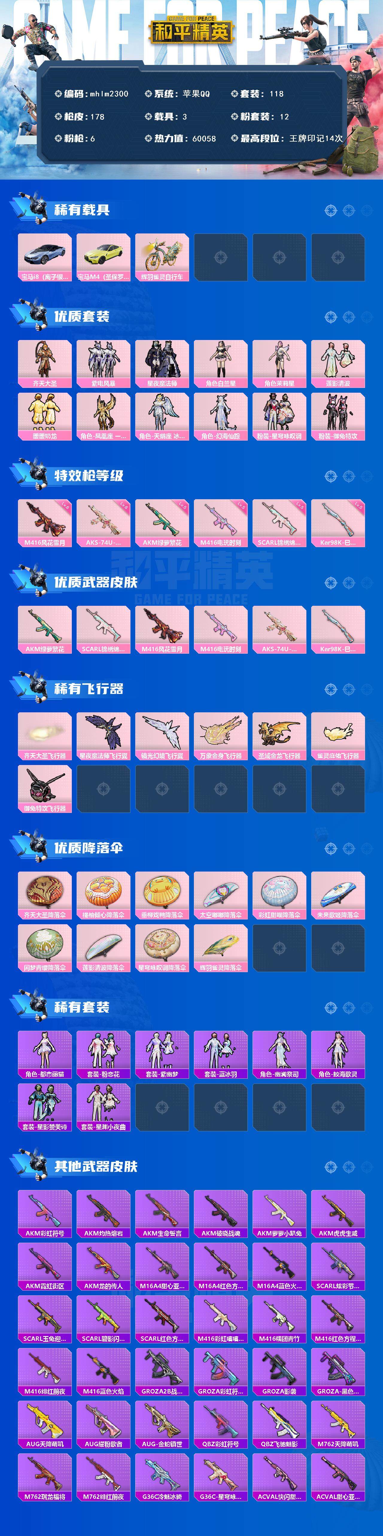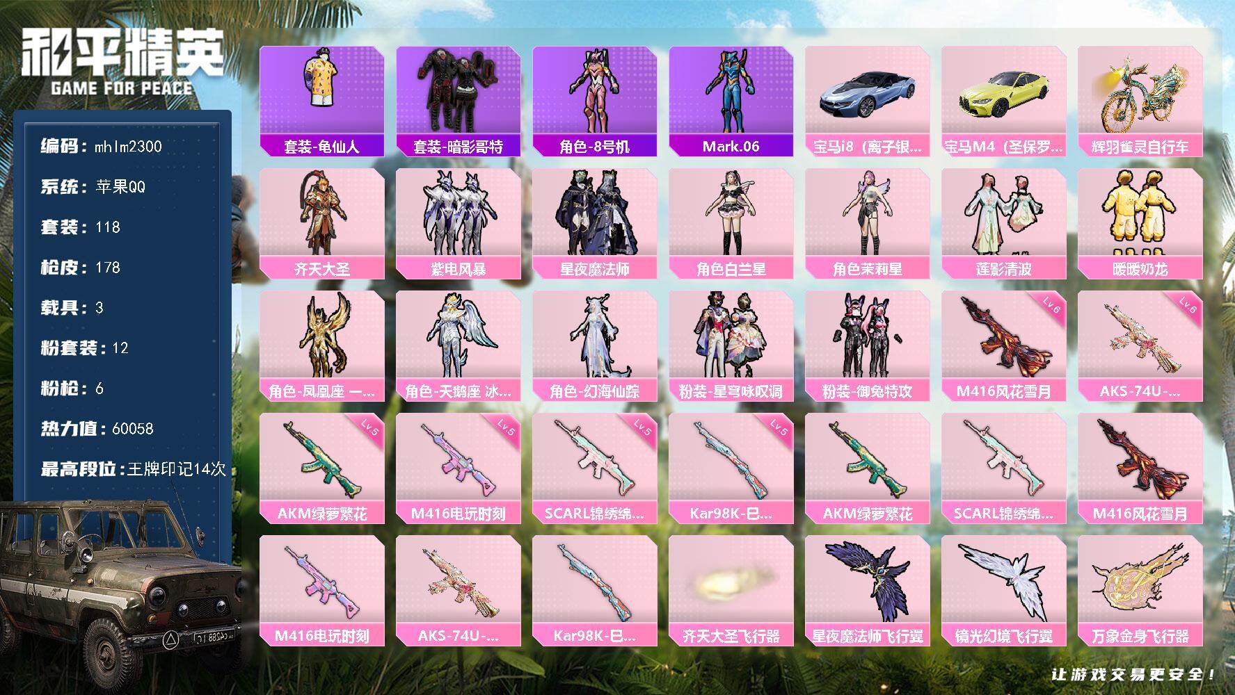 [14000914]【mhlm2300】苹果 手q-12粉装-6特效呛-3载具-7粉色飞行器-60058热力值-14王牌印记-118套装-178呛皮 【热门品类】:套装-龟仙人,套装-暗影哥特,角色-8号机,角色-mark.06 【粉色载具】:宝马i8(离子银),宝马m4(圣保罗黄),辉羽雀灵自行车 【粉色套装】:粉装-齐天大圣,粉装-紫电风暴,粉装-星夜魔法师,角色-白兰星,角色-茉莉星,粉装-莲影清波,粉装-暖暖奶龙,角色-凤凰座 一辉,角色-天鹅座 冰河,角色-幻海仙踪,粉装-星穹咏叹调,粉装-御兔特攻 【粉色呛皮等级】:akm-绿萝繁花五级,scar-l-锦绣绵绵五级,m416-风花雪月六级,m416-电玩时刻五级,aks-74u-星穹咏叹调六级,kar98k-巳巳如意五级 【粉色呛皮】:akm-绿萝繁花,scar-l-锦绣绵绵,m416-风花雪月,m416-电玩时刻,aks-74u-星穹咏叹调,kar98k-巳巳如意 【粉色飞行器】:齐天大圣飞行器,星夜魔法师飞行翼,镜光幻境飞行翼,万象金身飞行器,圣域金龙飞行器,雀灵庇佑飞行器,御兔特攻飞行器 【粉色降落伞】:齐天大圣降落伞,橘柚倾心降落伞,垂柳戏鸭降落伞,太空嘟嘟降落伞,彩虹甜喵降落伞,未来歌姬降落伞,闲梦青缨降落伞,莲影清波降落伞,星穹咏叹调降落伞,辉羽雀灵降落伞 【稀有套装】:套装-龟仙人,角色-都市丽猫,套装-粉恋花,套装-紫幽梦,套装-蓝冰羽,角色-幽澜祭司,角色-鲛海歌灵,套装-星影赞美诗,套装-星渊小夜曲 【稀有呛皮】:akm-彩虹符号,akm-灼热熔岩,akm-生命誓言,akm-破晓战魂,akm-萝萝小趴兔,akm-虎虎生威,akm-霓虹街区,akm-龙的传人,m16a4-甜心亚梦,m16a4-红色方程式,m16a4-蓝色火焰,scar-l-炫彩节奏,scar-l-玉兔迎春,scar-l-碧影闪光,scar-l-红色方程式,m416-彩虹嘻嘻猴,m416-糯团青竹,m416-红色方程式,m416-绯红前夜,m416-蓝色火焰,groza-2b战斗服款,groza-彩虹符号,groza-影袭,groza-黑色刀锋,aug-天降萌叽,aug-耀粉歌者,aug-金蛇镇世,q-彩虹符号,q-飞驰魅影,m762-天降萌叽,m762-瑞龙福将,m762-绯红前夜,g36c-冷魅冰骑,g3