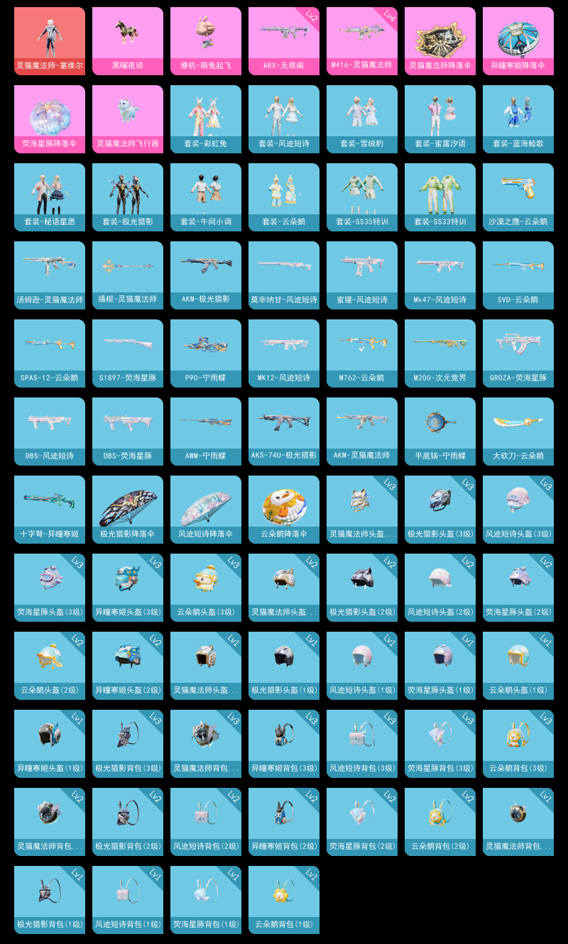 【和平精英】【lyhp16616】1粉装4特效呛2载具含1飞机 1级塞维尔 4级m4灵猫魔法师 黑耀夜骑 0粉装,4特效呛,1载具,历史最高段位:传奇王牌10星 王牌印记3次 热力值:15356,17套装,34呛械,53装备,22战备;套装:灵猫魔法师-塞维尔,套装-湖蓝色名流,套装-长空猛禽,套装-破晓战魂,套装-ss33特训,套装-云朵鹅,套装-ss32特训,套装-彩虹兔,套装-雪绒豹,套装-蜜露汐语,套装-炫彩糖果,套装-蓝海鲸歌,套装-极光猎影,套装-ss35特训,套装-午间小调,套装-秘语星愿,套装-风迹短诗;呛皮:m762-云朵鹅,aug-冰晶雪宝,mk47-风迹短诗,akm-极光猎影,akm-灵猫魔法师,蜜獾-风迹短诗,蜜獾-乌木金纹,famas-乌木金纹,groza-荧海星豚,2级arx-无垠阁,4级m416-灵猫魔法师,m200-次元竞界,svd-云朵鹅,莫辛纳甘-风迹短诗,win94-乌木金纹,awm-宁雨蝶,mk12-风迹短诗,p90-宁雨蝶,汤姆逊-灵猫魔法师,aks-74u-极光猎影,uzi-红色方程式,uzi-炫彩糖果,s1897-荧海星豚,dbs-荧海星豚,dbs-风迹短诗,spas-12-云朵鹅,沙墨之鹦-云朵鹅,平底锅-宁雨蝶,大砍刀-云朵鹅,撬棍-灵猫魔法师,4级破片手留单-美味星星糖,铝热弹-炫彩糖果,2级盐雾蛋-电雾迷城,十子怒-异瞳寒姬;载具:黑曜夜骑;降落伞:灵猫魔法师飞行器,炫彩糖果飞行器;滑翔尾迹:僚机-萌兔起飞; 详情看图