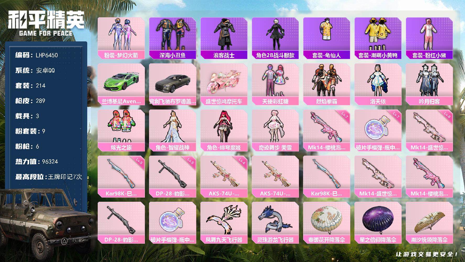 [14037077]【店主推荐捡漏号!可直接换绑】/素材身法号/地铁满天赋 安卓 手q-9粉装-6特效呛-3载具-3粉色飞行器-9.6w热力值-7王牌印记-214套装-289呛皮【热门品类】:粉装-梦幻火箭,套装-深海小丑鱼,套装-浪客战士,角色-2b战斗服款,套装-龟仙人,套装-潮萌小黄鸭,套装-粉红小猪【粉色载具】:兰博基尼aventad svj(翡翠绿),宾利飞驰(布罗德盖棕双色),盛世惊鸿摩托车【粉色套装】:粉装-天使彩虹糖,粉装-梦幻火箭,粉装-烈焰拳霸,角色-洛天依,粉装-吟月归客,粉装-炫光之旅,角色-智耀战神,角色-绯穹魔姬,角色-奇迹舞步 美雪【粉色呛皮等级】:aks-74u-星穹咏叹调四级,kar98k-巳巳如意五级,mk14-盛世惊鸿六级,mk14-樱桃泡泡七级,dp-28-豹影疾电五级,破片手留单-瓶中星球七级【粉色飞行器】:凤舞九天飞行器,灵珠游龙飞行器