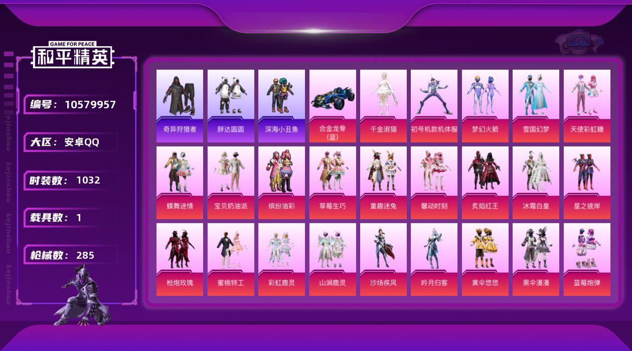 yzj10156-可二次-安卓q-106972热力值 17王牌印记1卓越 历史卓越王牌18星 女号 梦幻火箭 雪国 紫螳螂 猪妹 兔兔白日梦 草莓生巧 甜梦小狐 童趣迷兔 深海小丑鱼 红眼罩 冰霜白皇 小蓝 美雪 小可学妹 天命 满级心之恋语 浪漫波比 胖达圆圆 4am战队服 277套装 285呛皮 【1载具】 合金龙骨蓝色 【3稀有】 奇异狩猎者 scar-l-粉色回忆 浪漫天命 【3