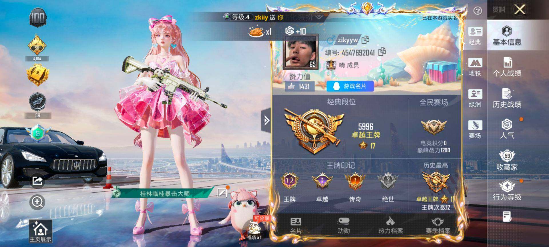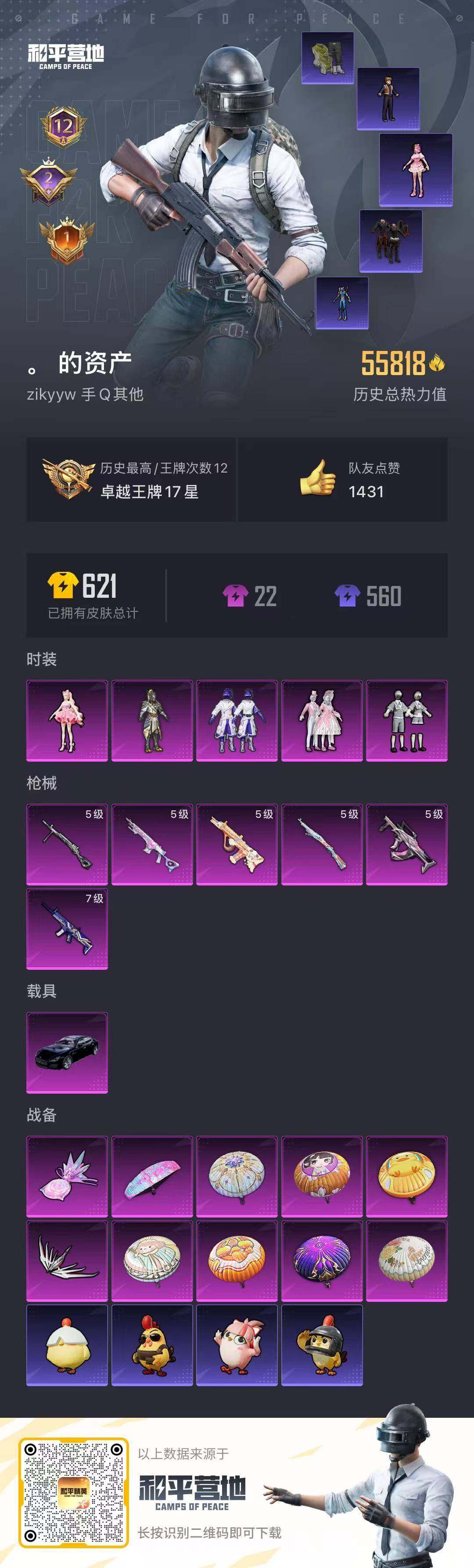 yzj11862 可二次 安卓q-1稀有1载具5粉装6特效呛11热门 精品小号 带地铁 樱桃泡泡 小白龙 甜蜜誓约 scar-l物语满级 aug暖羊满级 蓝螳螂 红眼罩 奥特曼 119套装183呛皮 55818热力值 12印记 历史卓越王牌17星 【1稀有】 akm-缤纷海域 【1载具】 玛莎拉蒂q蓝色 【5粉装】 樱桃泡泡 金曜白虎 新星烈龙 甜蜜誓约 岚岚物语 【6特效呛】 kar98k-
