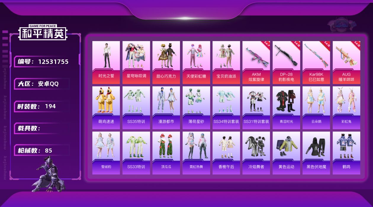 yzj11019-可二次-安卓q-5粉装4特效呛46套装85呛皮 【精品素材小女号 巧克力三姐妹 时光之誓 星穹咏叹调 彩虹兔 云朵鹅 雪绒豹等等各种小裙子穿搭】23532热力值 5印记 历史绝世王牌18星 【5粉装】 宝贝奶油派 天使彩虹糖 甜心巧克力 时光之誓 星穹咏叹调 【4特效呛】 akm-炫紫旋律 7级 kar98k-巳巳如意 5级 dp-28-豹影疾电 5级 aug-暖