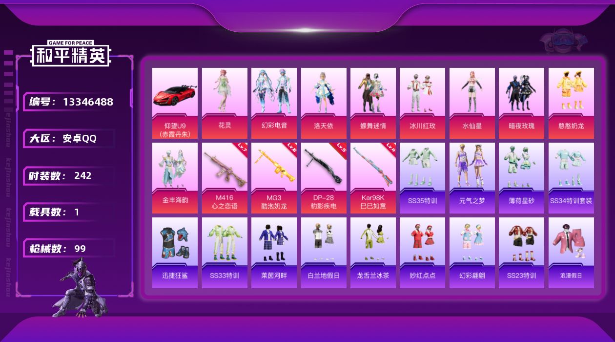 yzj11504 可二次 安卓q-1载具9粉装4特效呛5热门 精品小女号 花仙子 奶龙 洛天依 心之恋语满级 mg3奶龙6级 69套装99呛皮 36384热力值 历史荣耀皇冠ⅰ 【1载具】 仰望u9赤霞丹朱 【9粉装】 蝶舞迷情 水仙星 憨憨奶龙 洛天依 金丰海韵 花灵 幻彩电音 冰川红玫 暗夜玫瑰 【4特效呛】 m416-心之恋语 7级 kar98k-巳巳如意 4级 mg3-酷泡