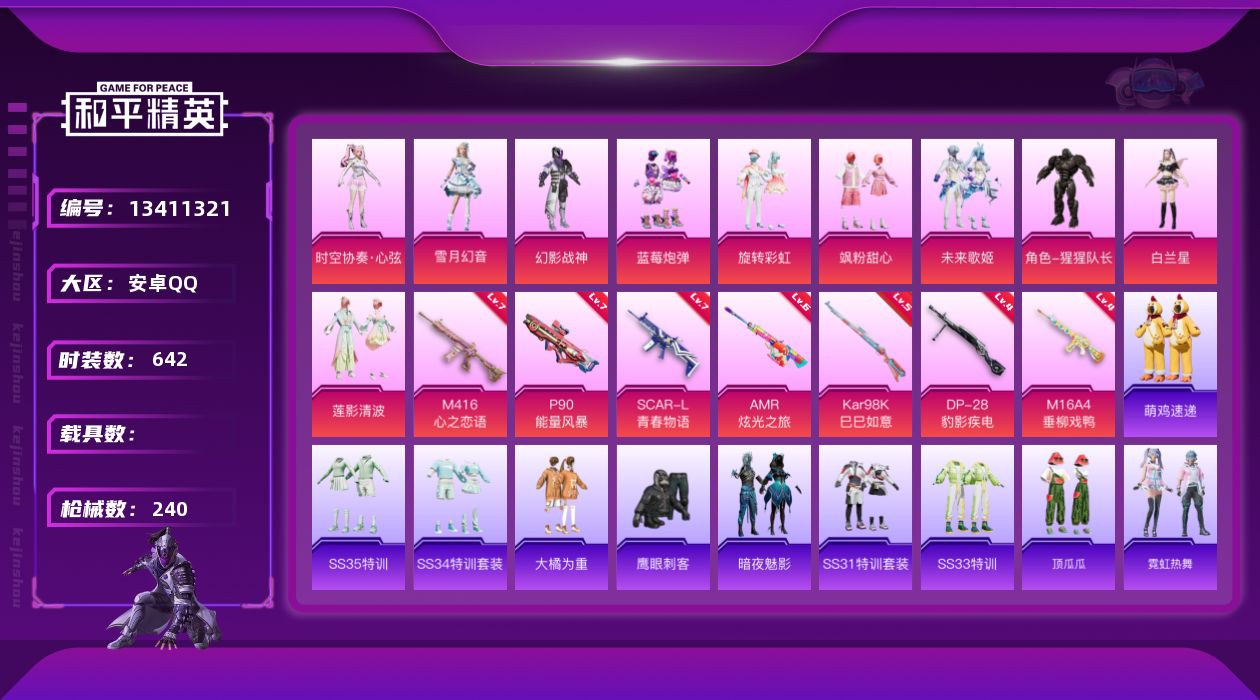 yzj11540-可二次-安卓q-2稀有10粉装7特效呛15热门176套装240呛皮 87568热力值 精氪小女号 173扭蛋碎片 旋转彩虹 蓝莓炮弹 白兰星 未来歌姬 莲影清波 雪月幻音 红眼罩 大橘为重 tt战队服 缤纷油彩背包 ak百万伏特 满级m416心之恋语 满级斯嘎青春物语 满级p90能量风暴 17印记 历史绝世王牌19星 【2稀有】 akm-百万伏特 浪漫天命 【10粉装】 白兰
