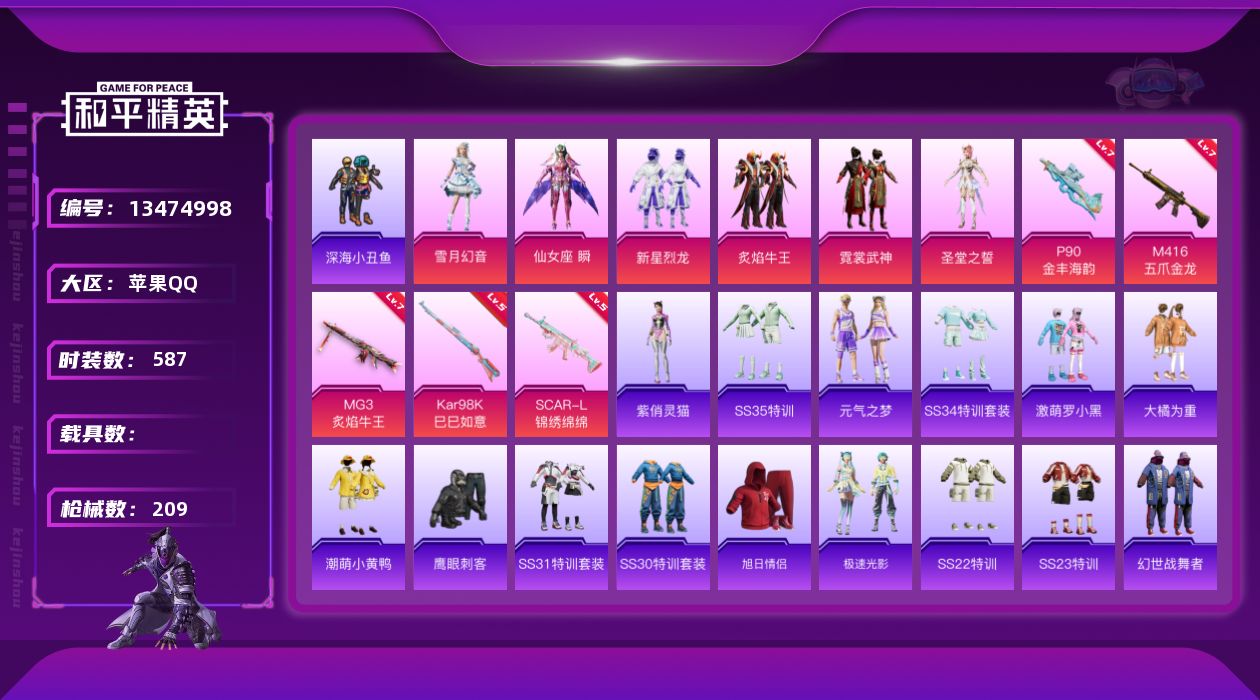 yzj11572-可二次-苹果q-1稀有6粉装5特效呛17热门153套装209呛皮 66160热力值 战神精氪小号 战神框(ss21)小白龙 红眼罩 圣堂之誓 小黄鸭 深海小丑鱼 激萌罗小黑 ak影袭 满级m416五爪金龙 满级p90金丰海韵 满级mg3炙焰牛王 12印记 历史无敌战神 【1稀有】 浪漫天命 【6粉装】 圣堂之誓 仙女座瞬 雪月幻音 霓裳武神 新星烈龙 炙焰牛王 【5特效呛】