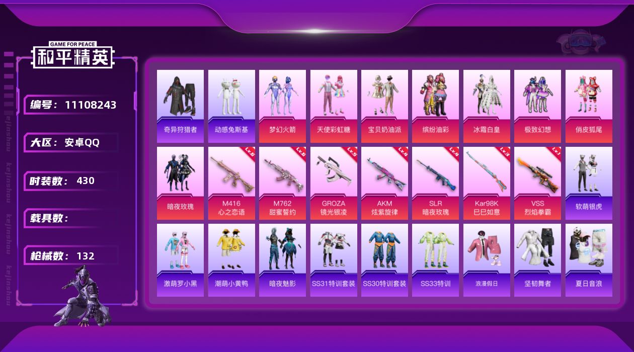 yzj10381-可二次-安卓q-46435热力值 10王牌印记 历史无敌战神ss10赛季战神框 女号 梦幻火箭 猪妹 二姐妹 极限幻想 心之恋语 小黄鸭 软妹银虎 112套装 132呛皮 【1稀有】 奇异狩猎者 【8粉装】 梦幻火箭 宝贝奶油派 天使彩虹糖 缤纷油彩 极致幻想 俏皮狐尾 冰霜白皇 暗夜玫瑰 【7特效呛】 m416-心之恋语 6级 akm-炫紫旋律 4级 kar98k-