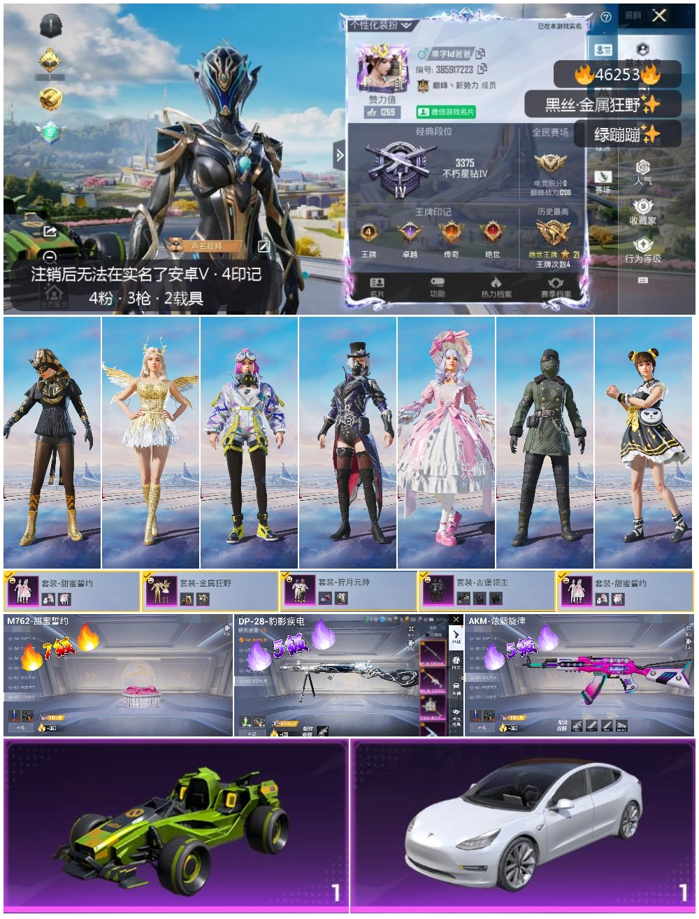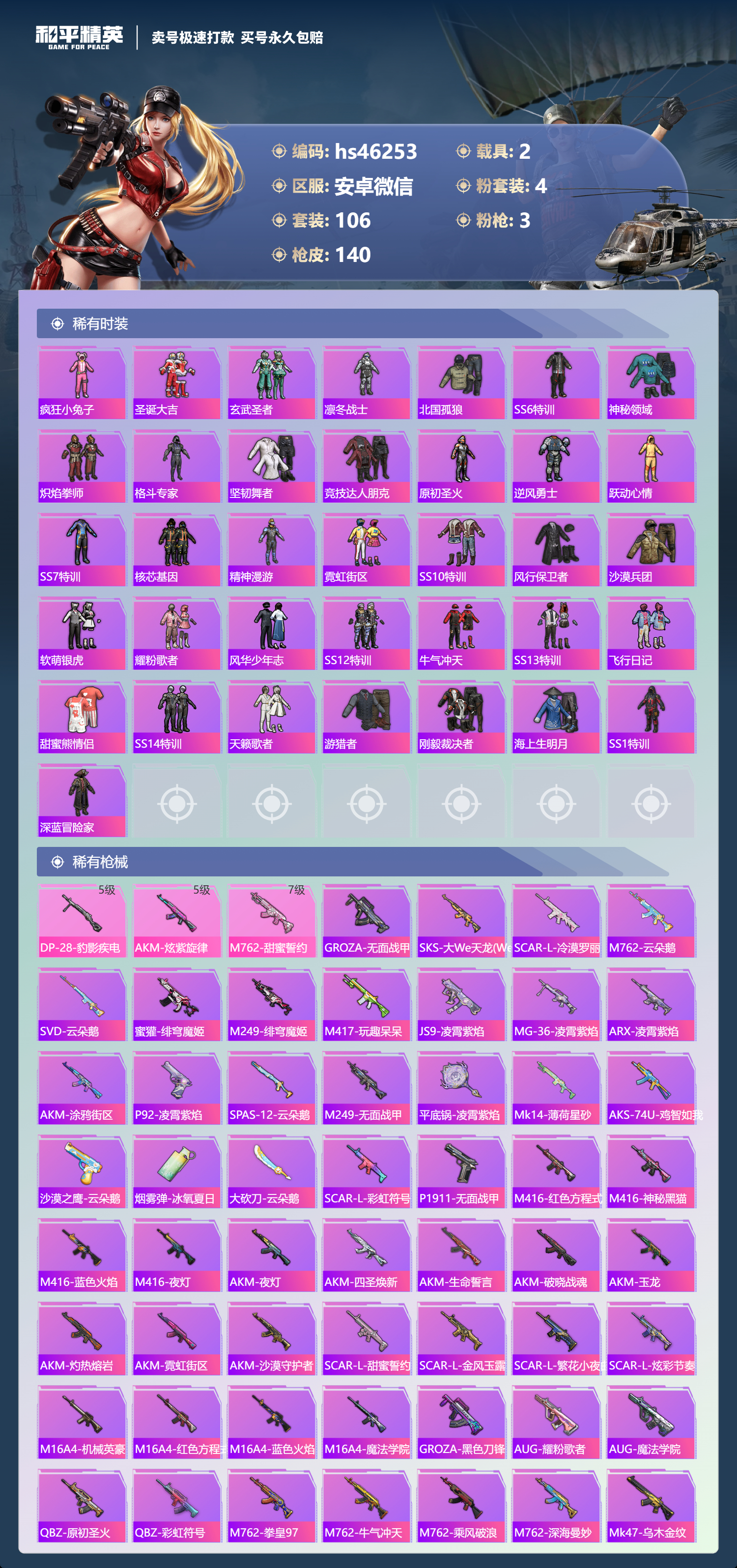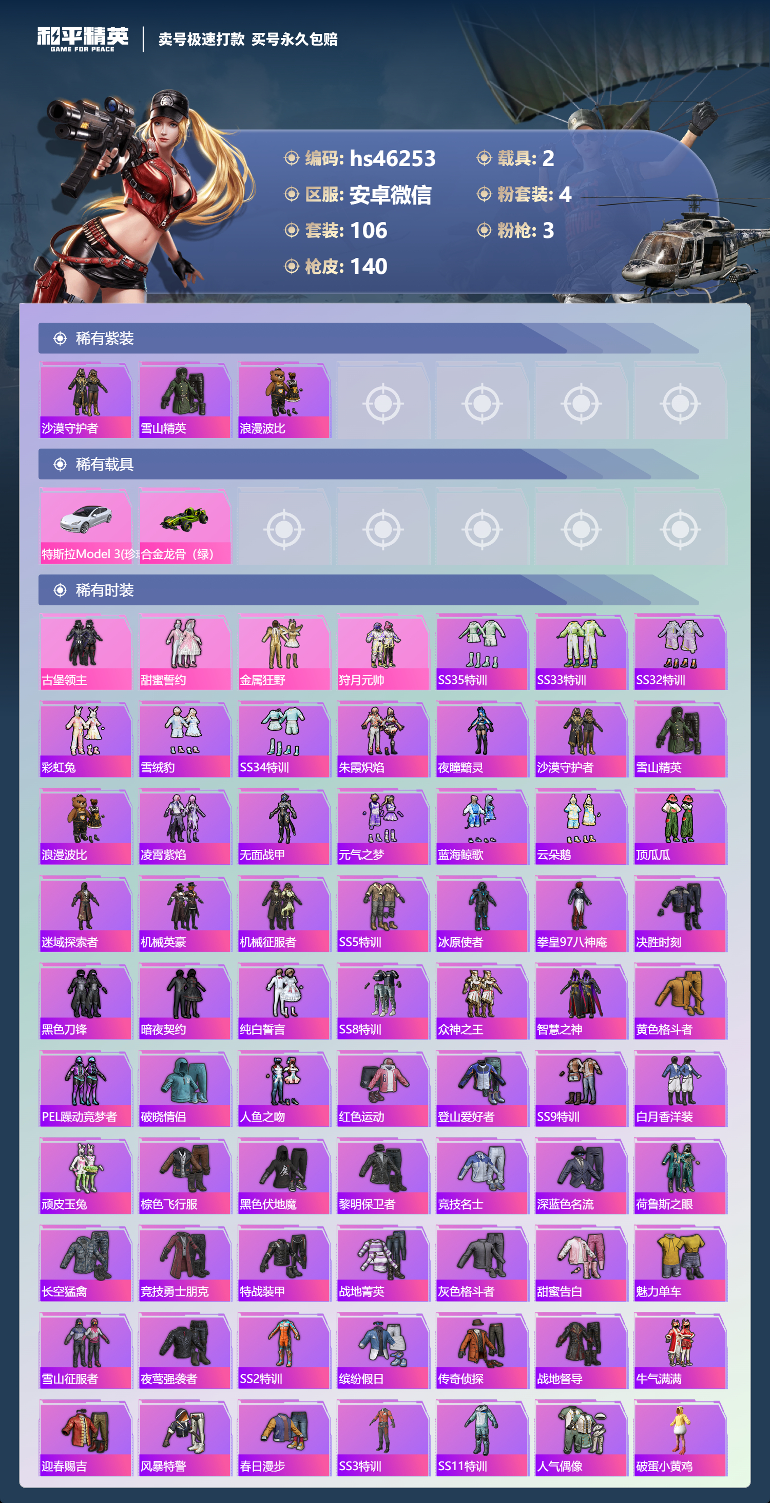2216998安卓微信-4王牌印记-4粉装-3特效呛-2载具-44723热力值-106套装-140呛皮-1卓越印记-1传奇印记 【4粉装】古堡领主甜蜜誓约金属狂野狩月元帅 【3特效呛】m762-甜蜜誓约-7级 akm-炫紫旋律-5级 dp-28-豹影疾电-5级 【3稀有紫装】沙漠守护者雪山精英浪漫波比 【2稀有载具】特斯拉model 3珍珠白合金龙骨(绿) 【