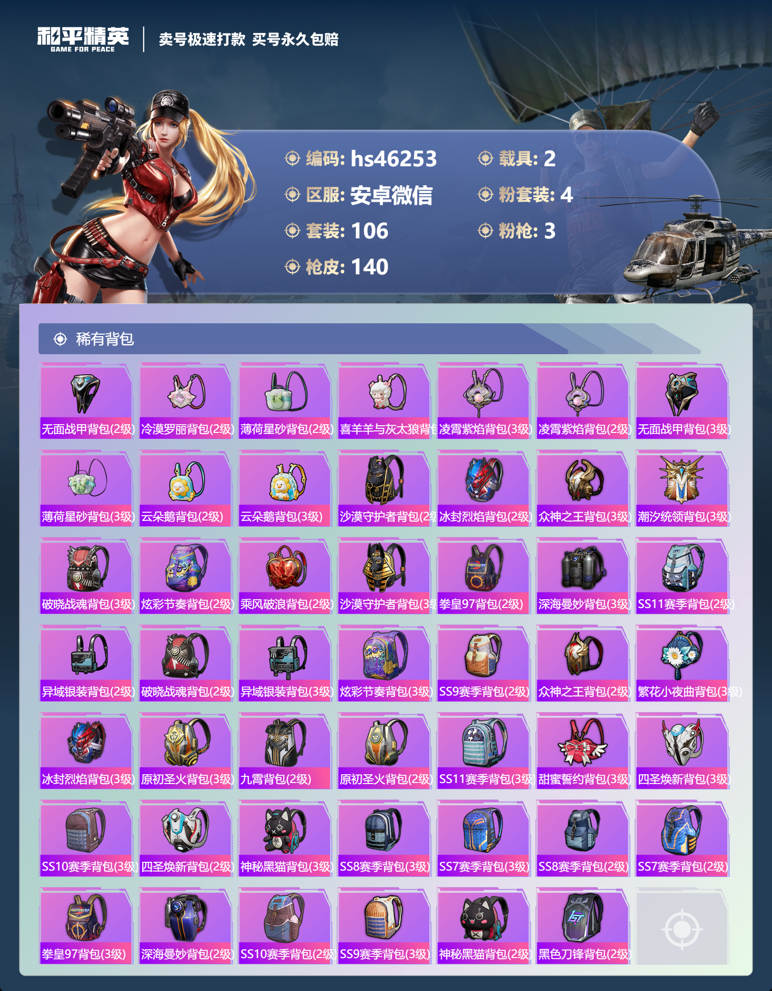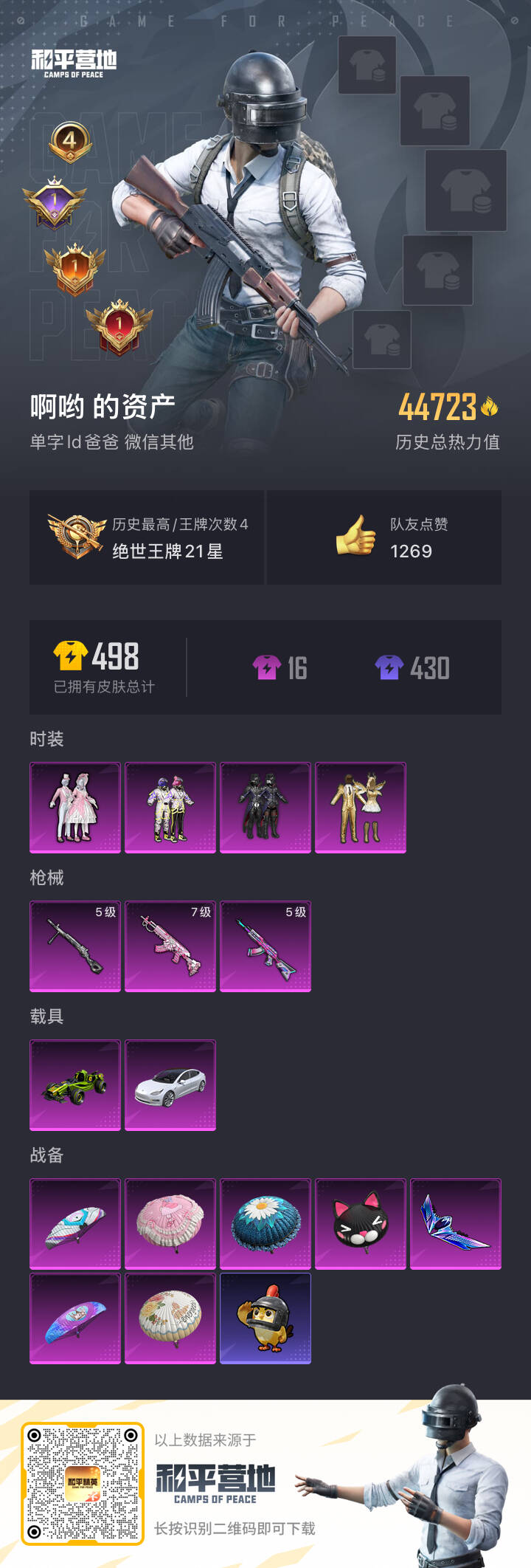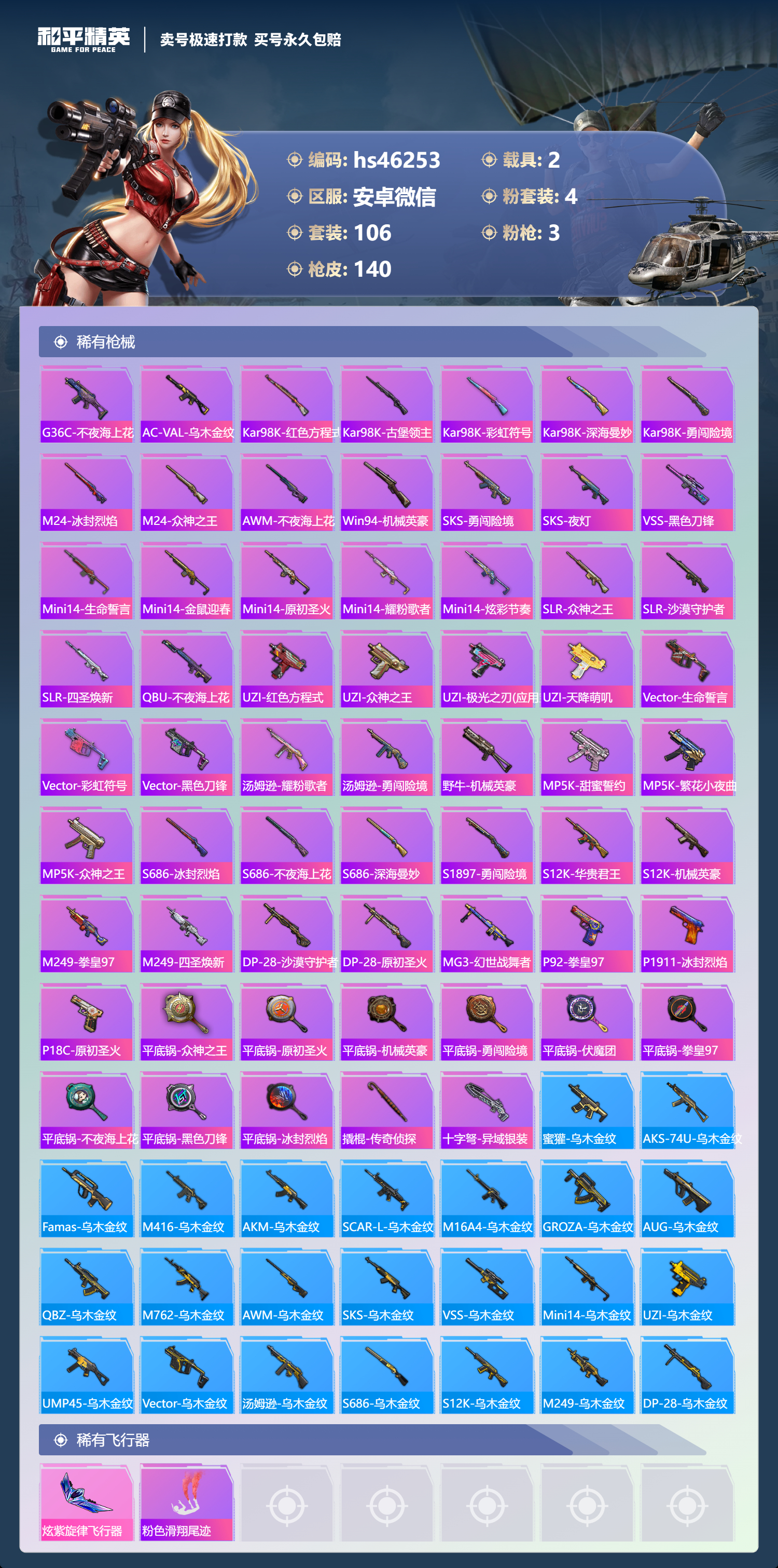 2216998安卓微信-4王牌印记-4粉装-3特效呛-2载具-44723热力值-106套装-140呛皮-1卓越印记-1传奇印记 【4粉装】古堡领主甜蜜誓约金属狂野狩月元帅 【3特效呛】m762-甜蜜誓约-7级 akm-炫紫旋律-5级 dp-28-豹影疾电-5级 【3稀有紫装】沙漠守护者雪山精英浪漫波比 【2稀有载具】特斯拉model 3珍珠白合金龙骨(绿) 【