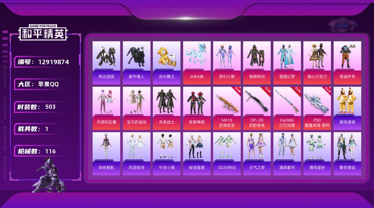 yzj11272-可二次 苹果q-4稀有1载具9粉装4特效呛12热门118套装116呛皮 41115热力值 极品身法精氪号 558扭蛋碎片 640 物资币 怪诞(小丑)雪国 甜心三姐妹 都市 金鞋 led发光眼罩 红眼罩 胖达 小丑鱼 tt战队服 极限特训 青涩年华 东方飞龙 彩虹兔 云朵鹅 雪绒豹 冰绡玉鳞 8级m4至情至圣(差6000服饰币满级) 灵珠游龙飞行器 雪国精灵头盔背包一套 5印