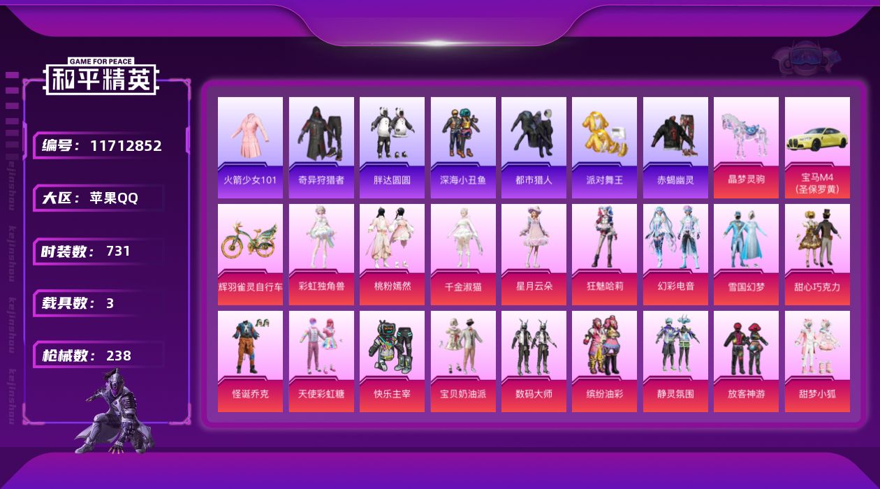 yzj10618-可二次-苹果q-92419热力值 8王牌印记 历史卓越王牌18星 【稀有素材对掏身法极品萌妹小姐姐号 老101 赤蝎 都市 天命 金鞋 雪国幻梦 三姐妹 奶龙 怪诞乔克(小丑)小番茄 甜梦小狐 猪妹 发光眼罩 胖达 小丑鱼 羊梦糖心 小丑女 星月云朵 彩虹独角兽 千金淑猫 白日梦 罗小黑 nv战队服 粉熊背包 雪国背包 水晶马 等等 】 189套装 238呛皮 【4载具】