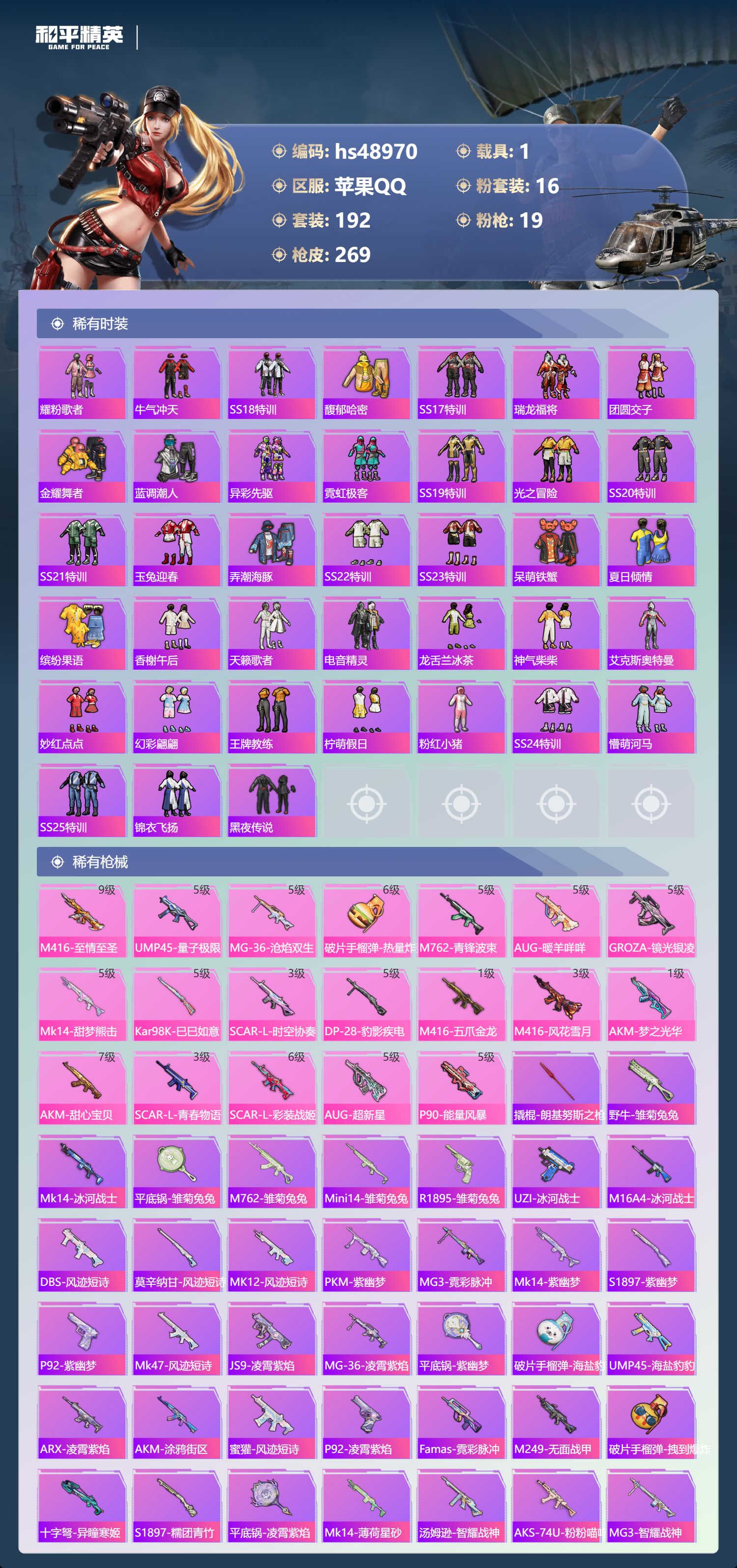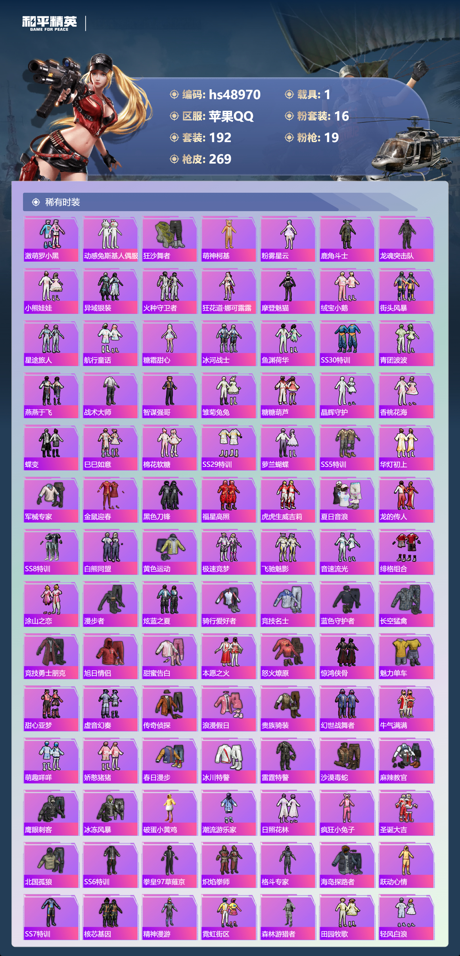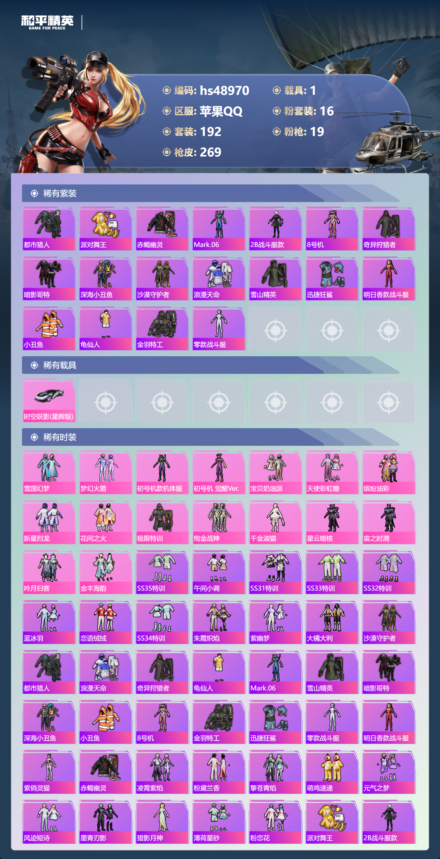 2246919苹果手q-16王牌印记-16粉装-19特效呛-1载具-92576热力值-192套装-269呛皮-3卓越印记-1传奇印记 【16粉装】套装-绚金战神套装-极限特训角色-星云暗核套装-金丰海韵角色-初号机款机体服角色-宙之时溯套装-天使彩虹糖角色-初号机 觉醒ver.套装-吟月归客角色-千金淑猫套装-梦幻火箭套装-缤纷油彩套装-雪国幻梦套装-花间之火
