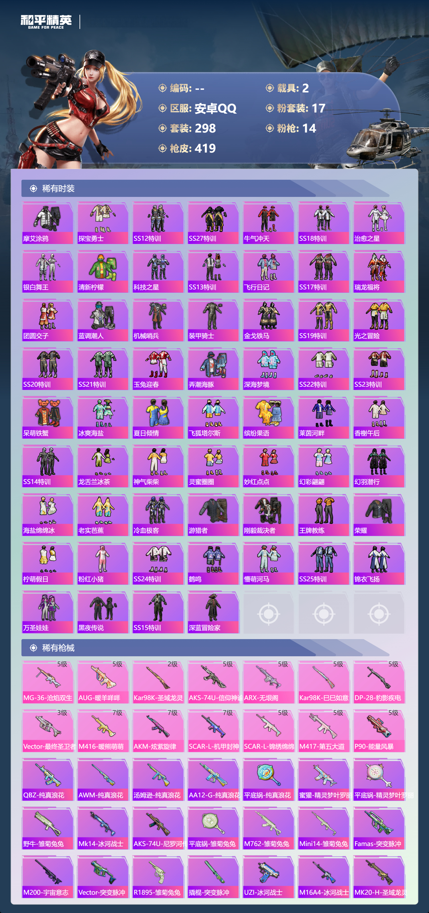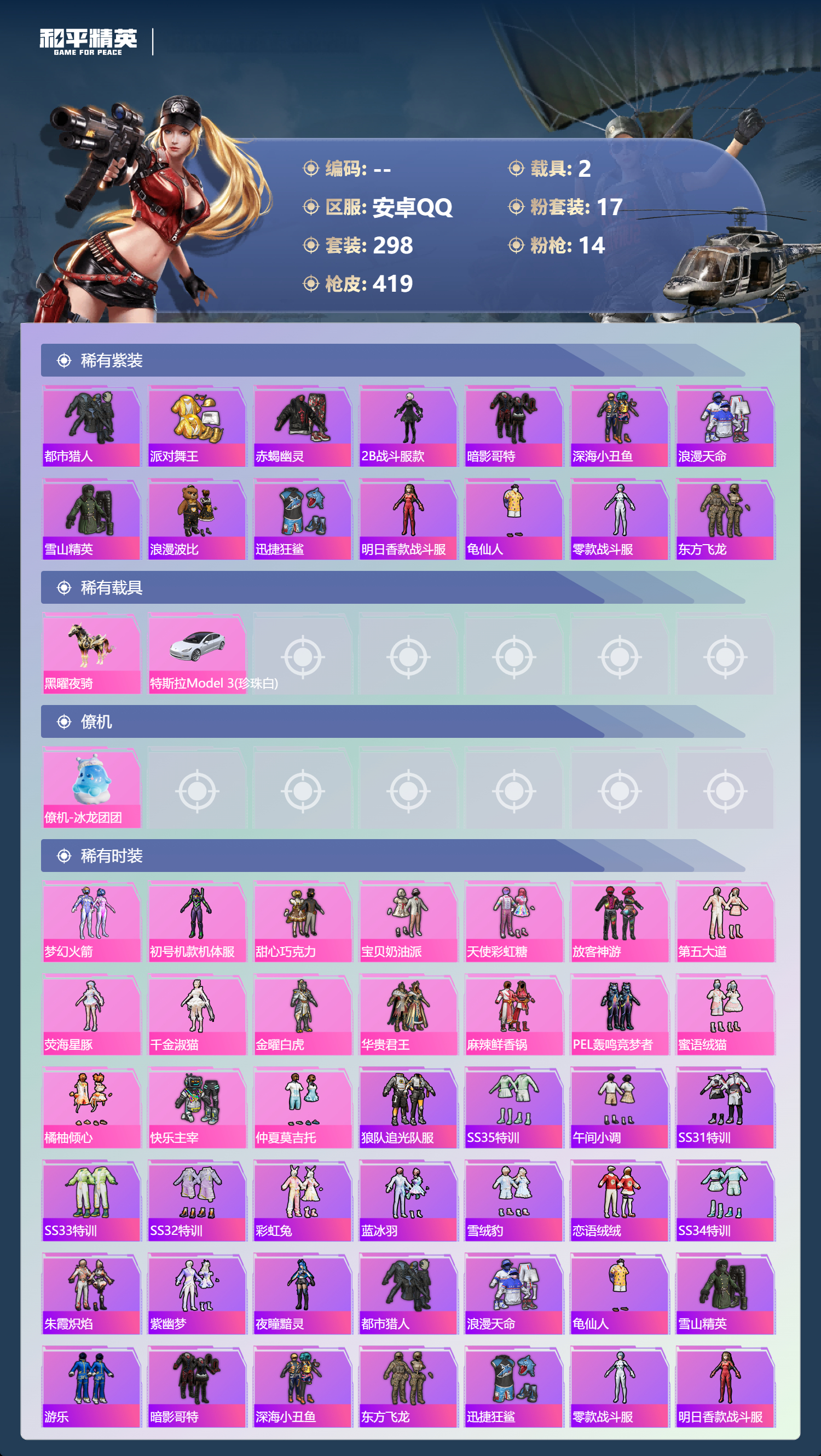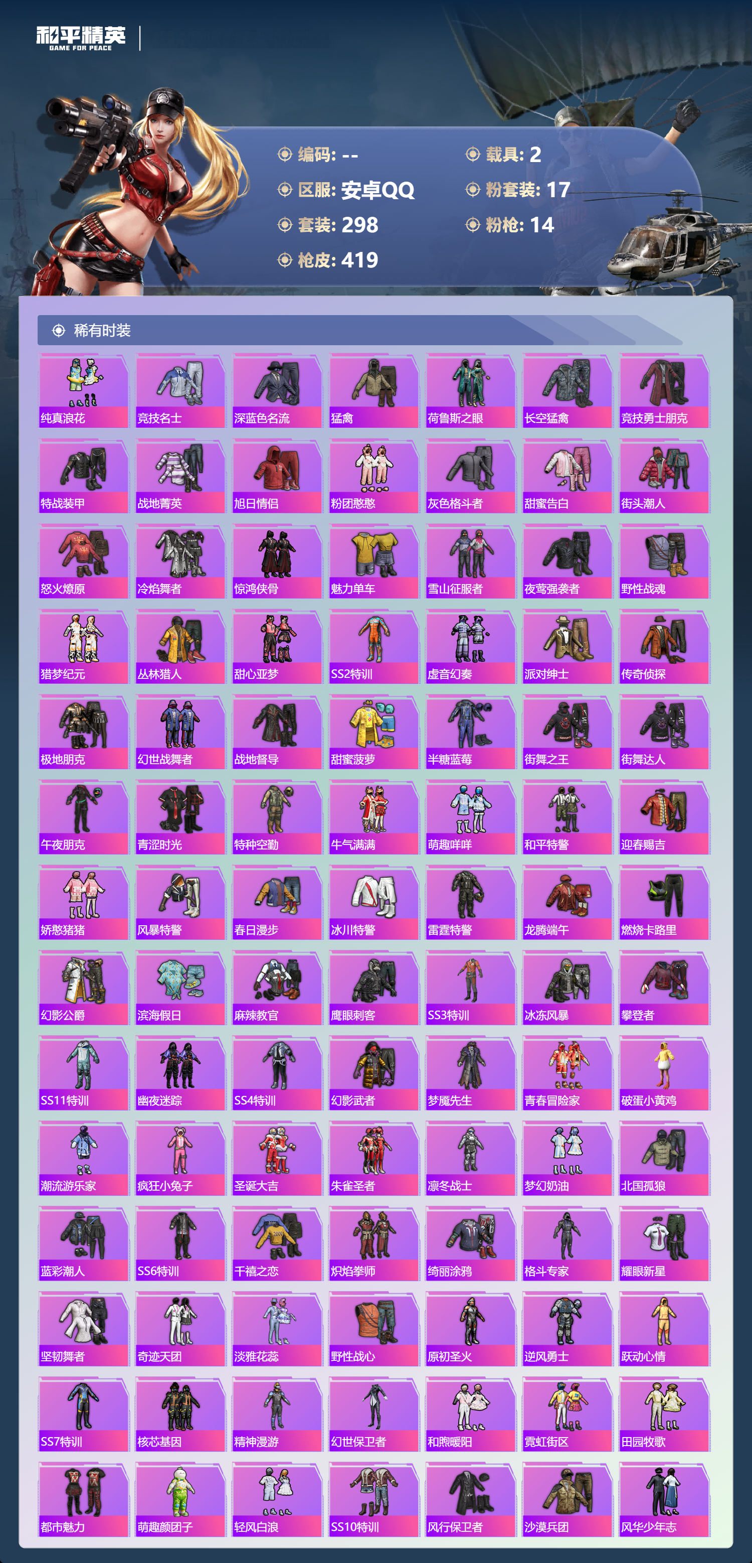 2253658安卓手q-21王牌印记-17粉装-14特效呛-2载具-热力值-298套装-419呛皮-5卓越印记-2传奇印记 【17粉装】套装-麻辣鲜香锅套装-天使彩虹糖套装-仲夏莫吉托套装-放客神游套装-甜心巧克力套装-金曜白虎套装-宝贝奶油派角色-初号机款机体服套装-快乐主宰套装-第五大道套装-蜜语绒猫套装-梦幻火箭套装-pel轰鸣竞梦者套装-橘柚倾心角色-