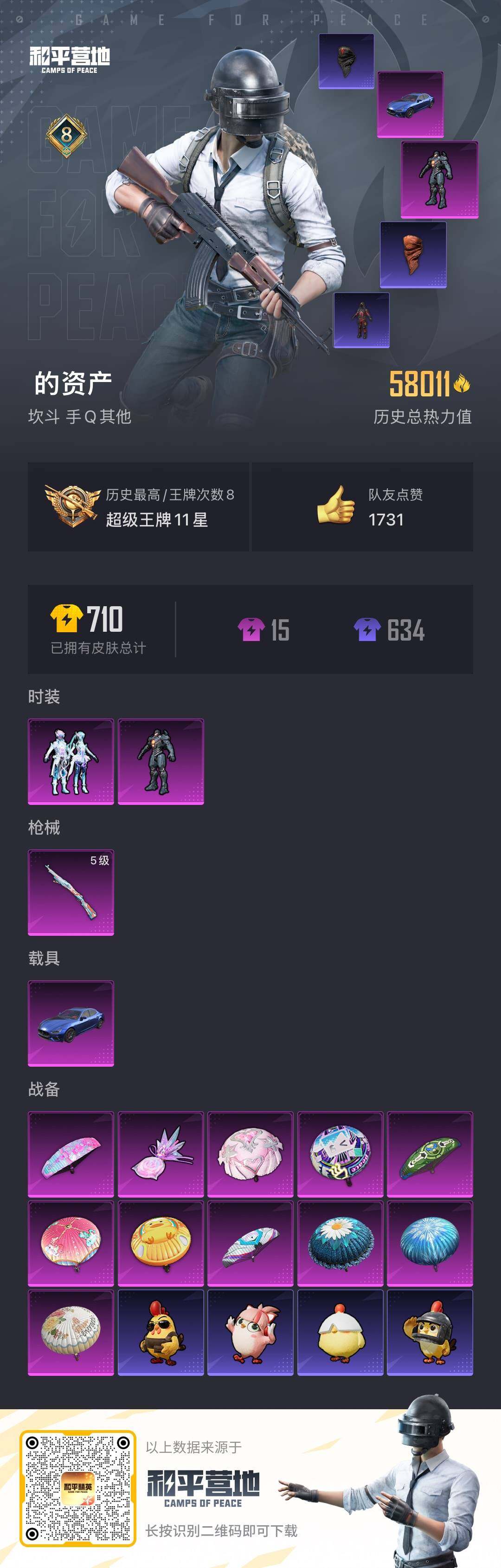yzj11822 可二次 安卓q-1稀有1载具2粉装1特效呛11热门169套装195呛皮 57851热力值 8印记 历史超级王牌11星 【1稀有】 awm-黄金龙骨 【1载具】 玛莎拉蒂蓝色 【2粉装】 幻彩电音 复仇流浪者 【1特效呛】 kar98k-巳巳如意 5级 【11热门】 奇迹天团 龟仙人 雪山精英 奇迹天团 ss1特训 粉红小猪 漫步者 玄武圣者 破蛋小黄鸡 黑色刀锋 极速
