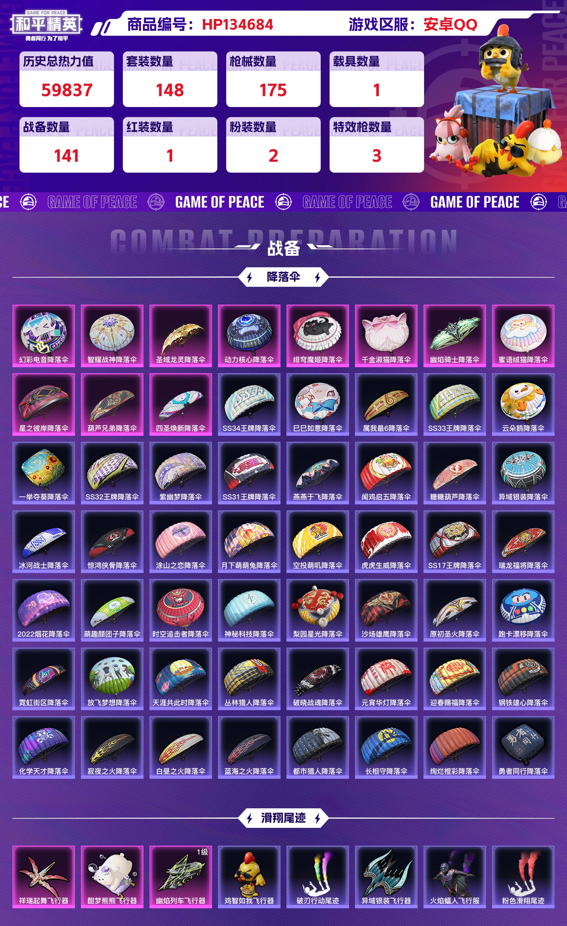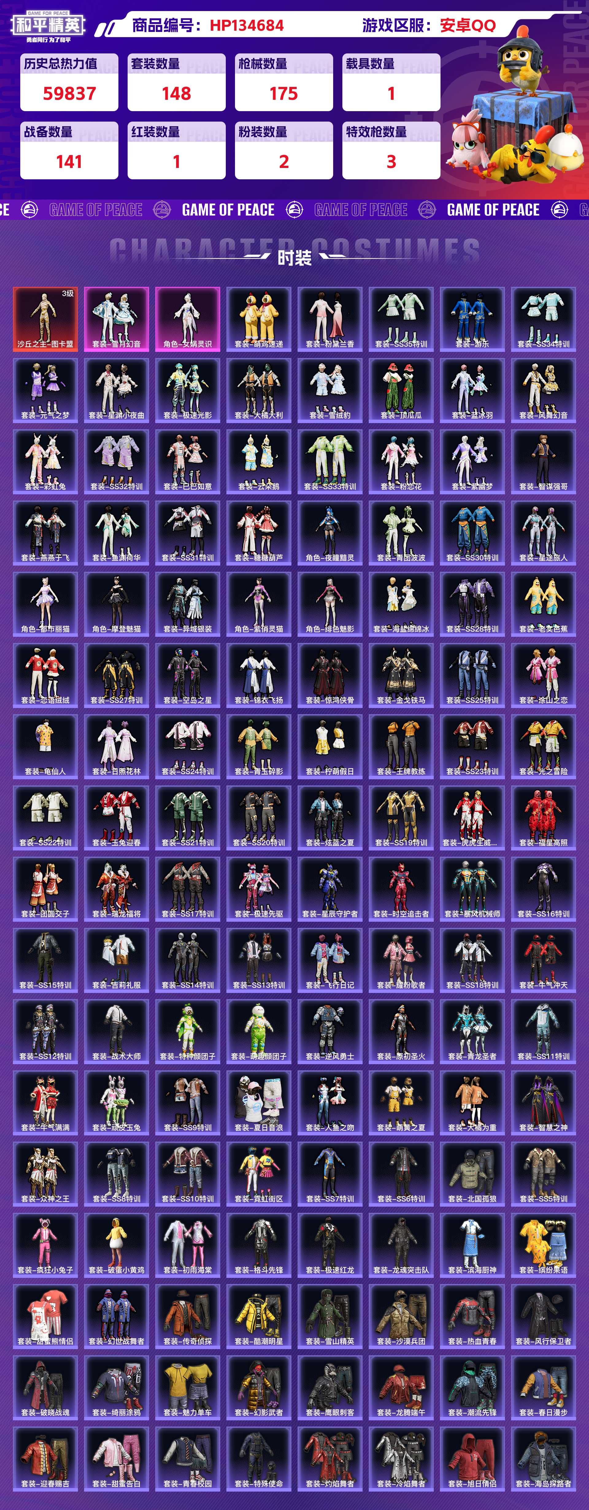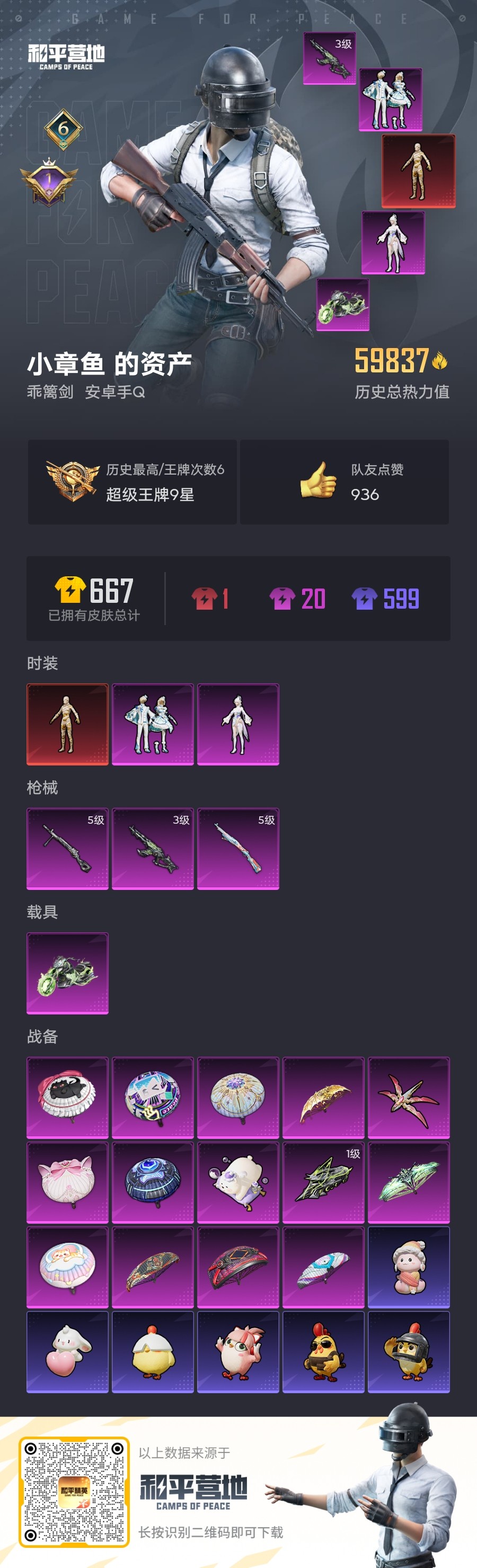 2234559-安卓qq 历史总热力值:59837 红装数量:1 粉装数量:2 特效呛数量:3 载具数量:1 王牌印记:6 历史最高段位:超级王牌9星 套装数量:148 时装数量:545 呛械数量:175 战备数量:141 装备数量:202 载具:幽焰风驰摩托车 时装:沙丘之主-图卡盟3级套装-雪月幻音角色-女娲灵识套装-ss10特训套装-ss11特训套装-ss12特训套装-