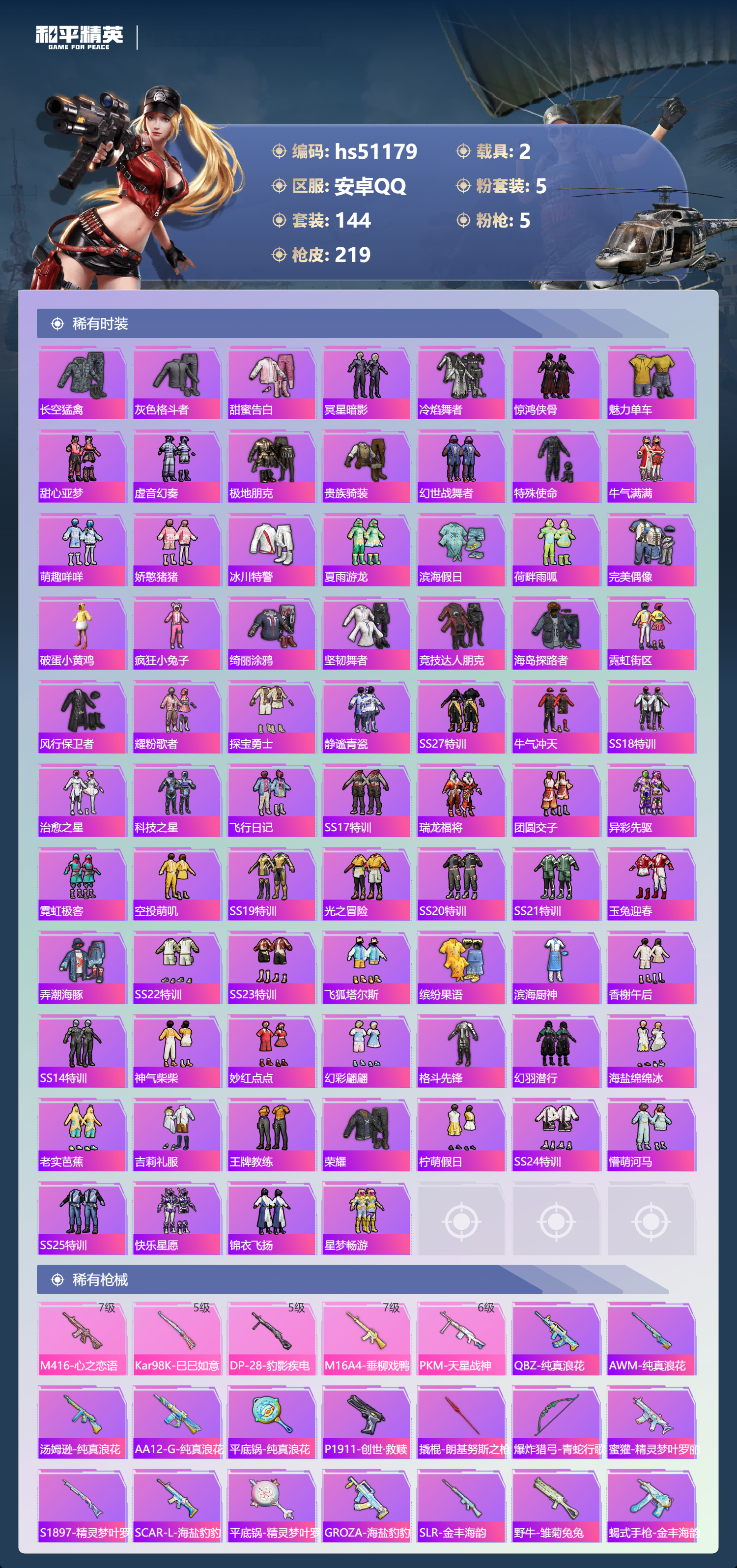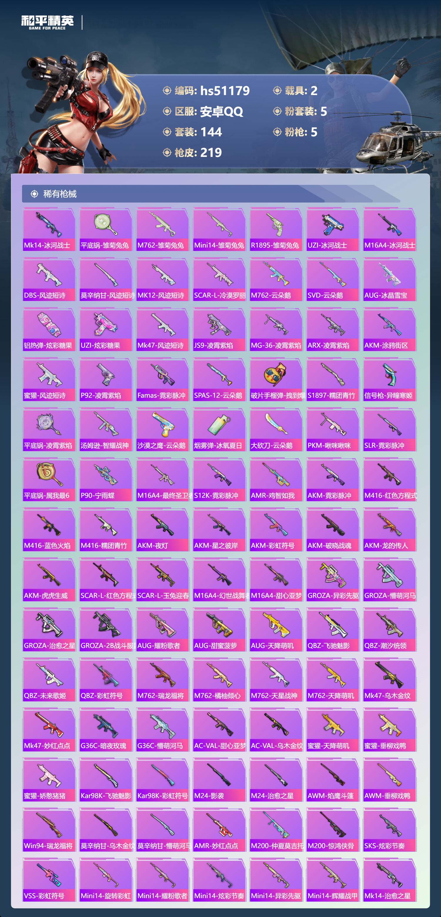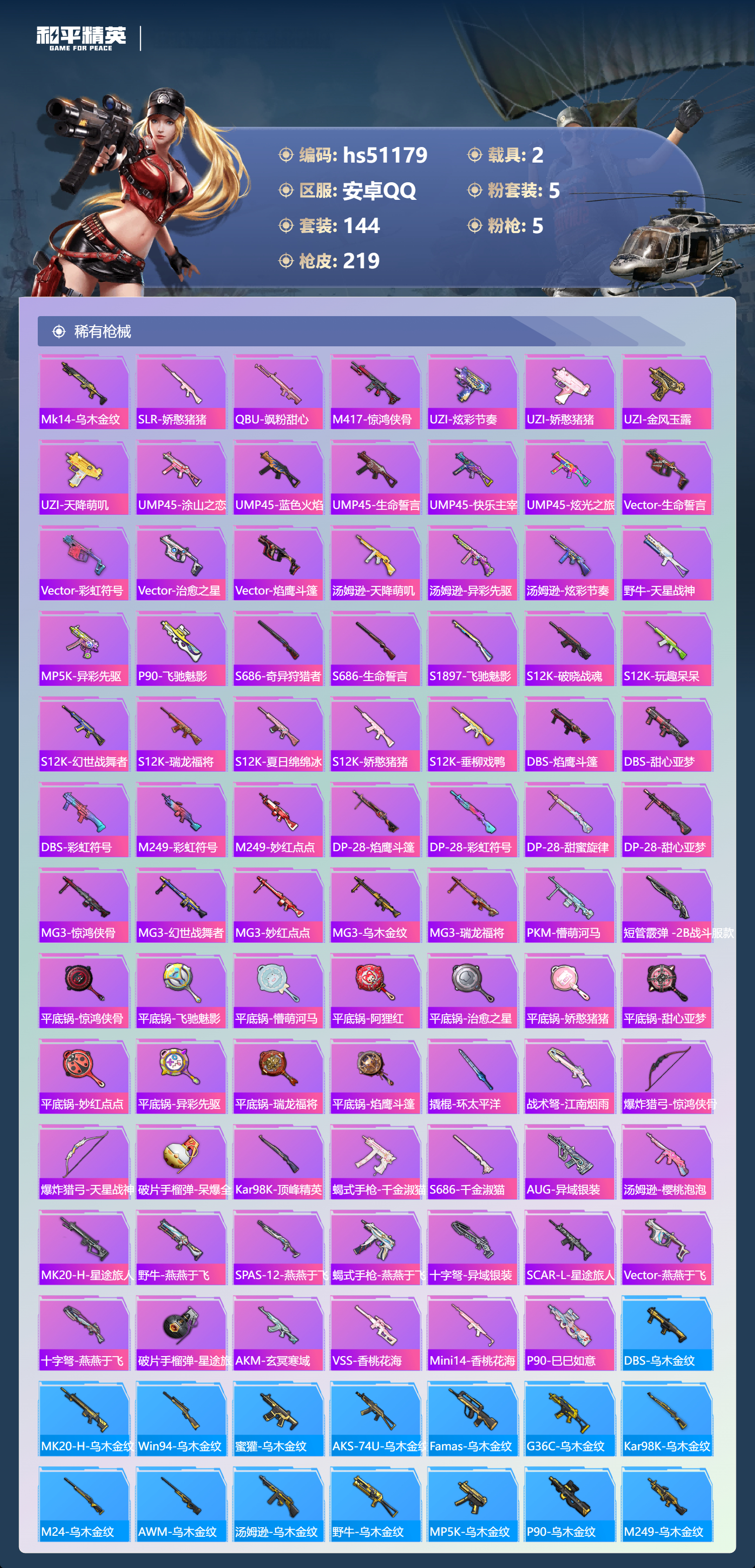 hs51179 安卓手q-6王牌印记-5粉装-5特效呛-2载具-67418热力值-144套装-219呛皮-1卓越印记-1传奇印记【5粉装】套装-俏雪含霜套装-天星战神套装-创世·救赎套装-垂柳戏鸭角色-冷漠罗丽【5特效呛】m416-心之恋语/7级kar98k-巳巳如意/5级m16a4-垂柳戏鸭/7级dp-28-豹影疾电/5级pkm-天星战神/6级【4稀有紫装】mark.06