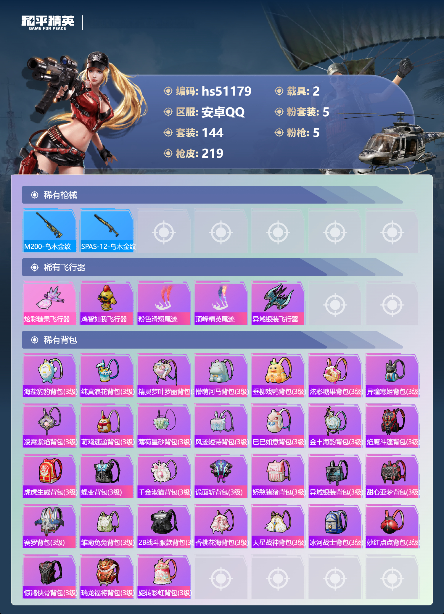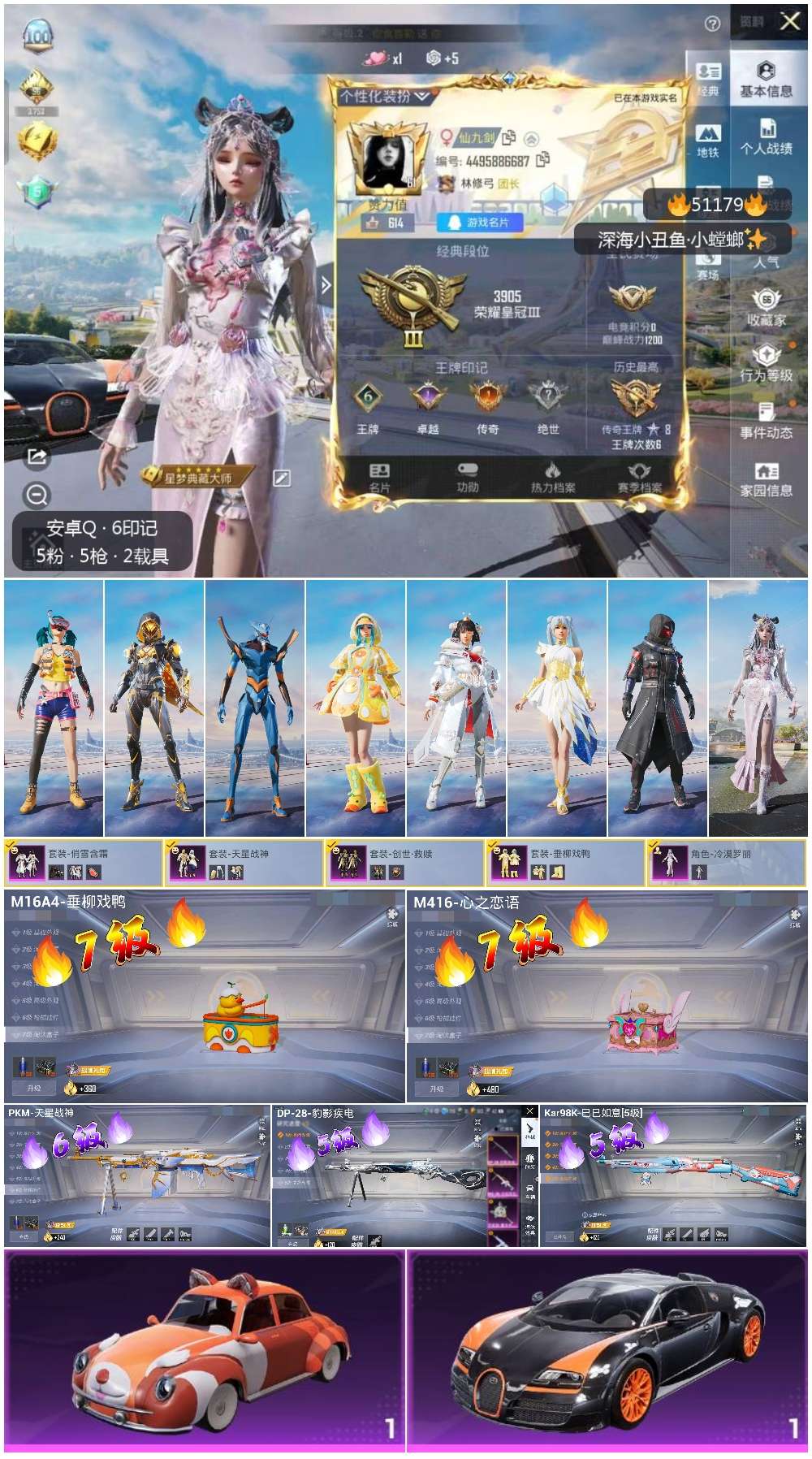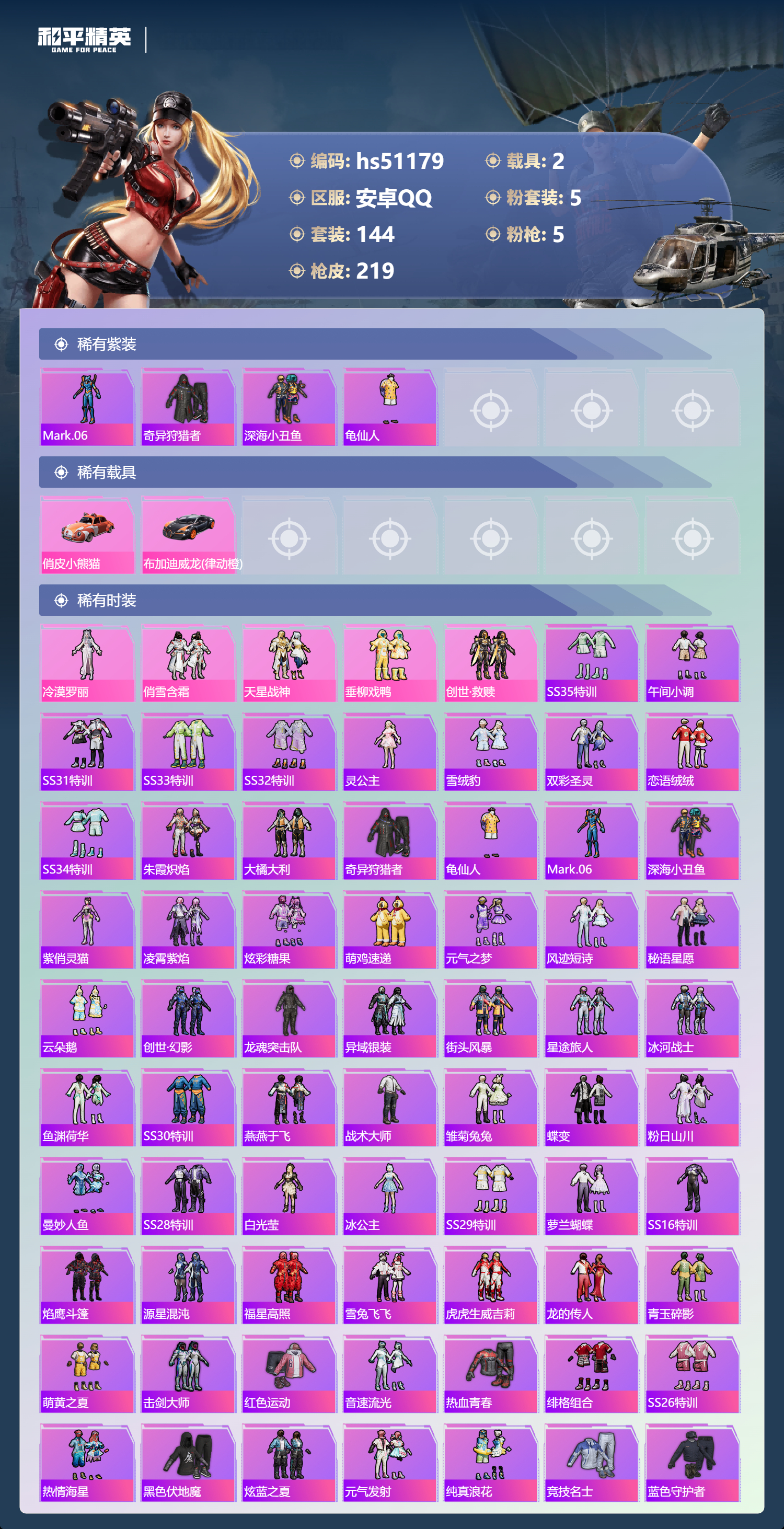 hs51179 安卓手q-6王牌印记-5粉装-5特效呛-2载具-67418热力值-144套装-219呛皮-1卓越印记-1传奇印记【5粉装】套装-俏雪含霜套装-天星战神套装-创世·救赎套装-垂柳戏鸭角色-冷漠罗丽【5特效呛】m416-心之恋语/7级kar98k-巳巳如意/5级m16a4-垂柳戏鸭/7级dp-28-豹影疾电/5级pkm-天星战神/6级【4稀有紫装】mark.06