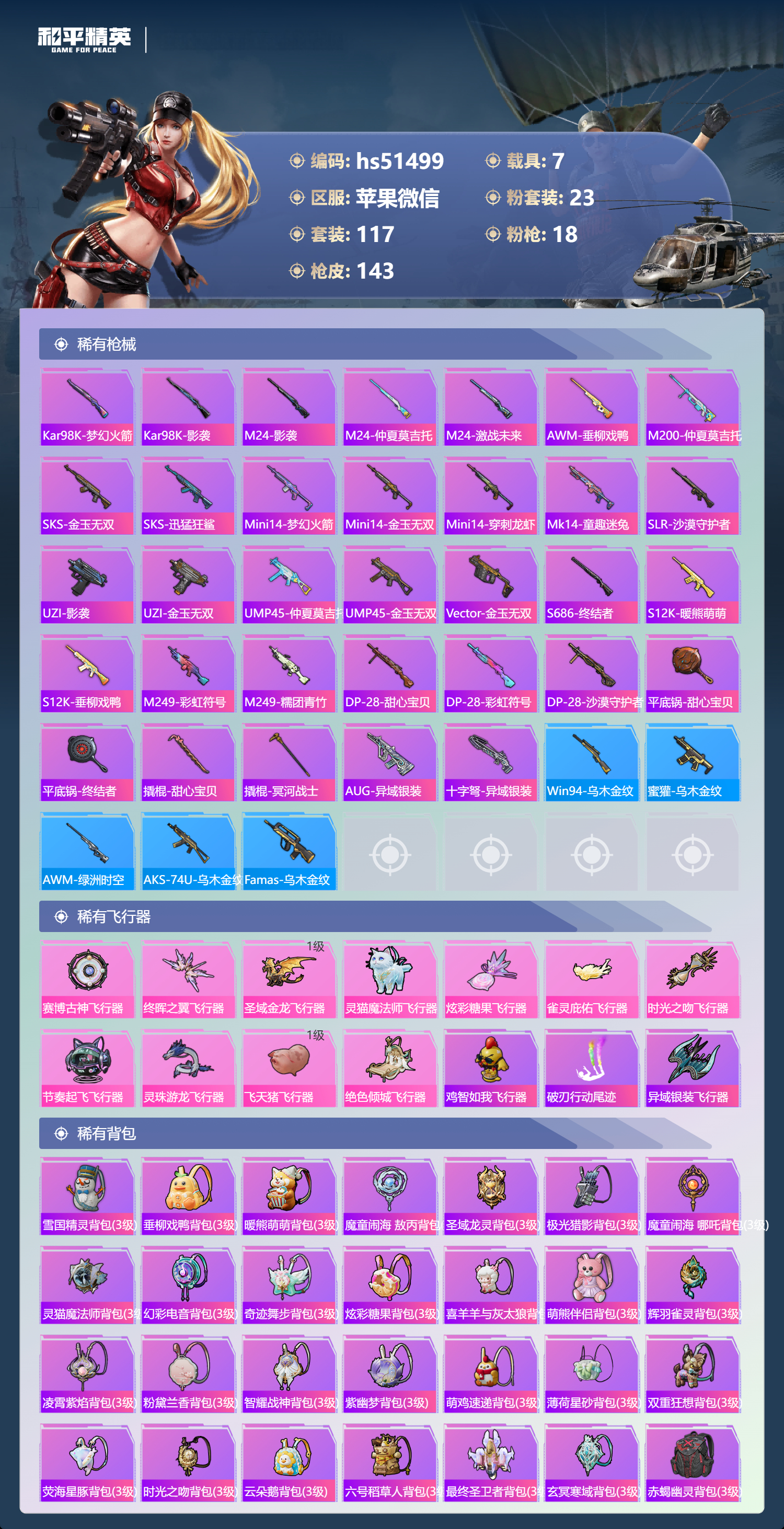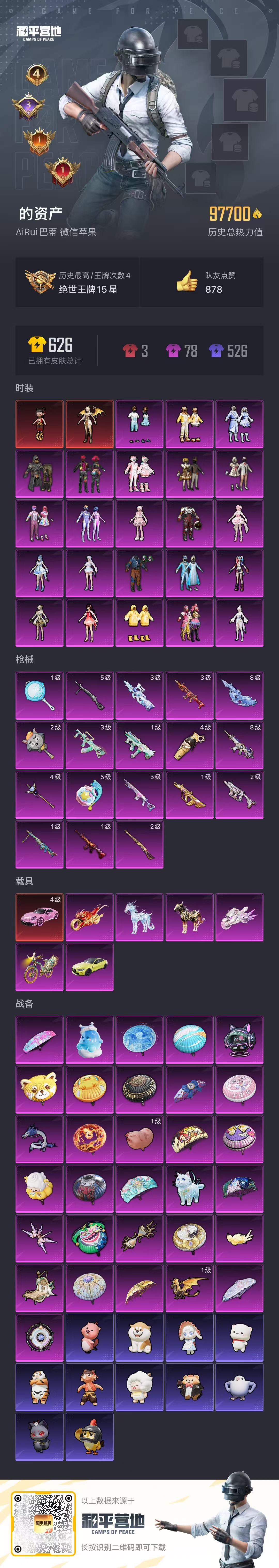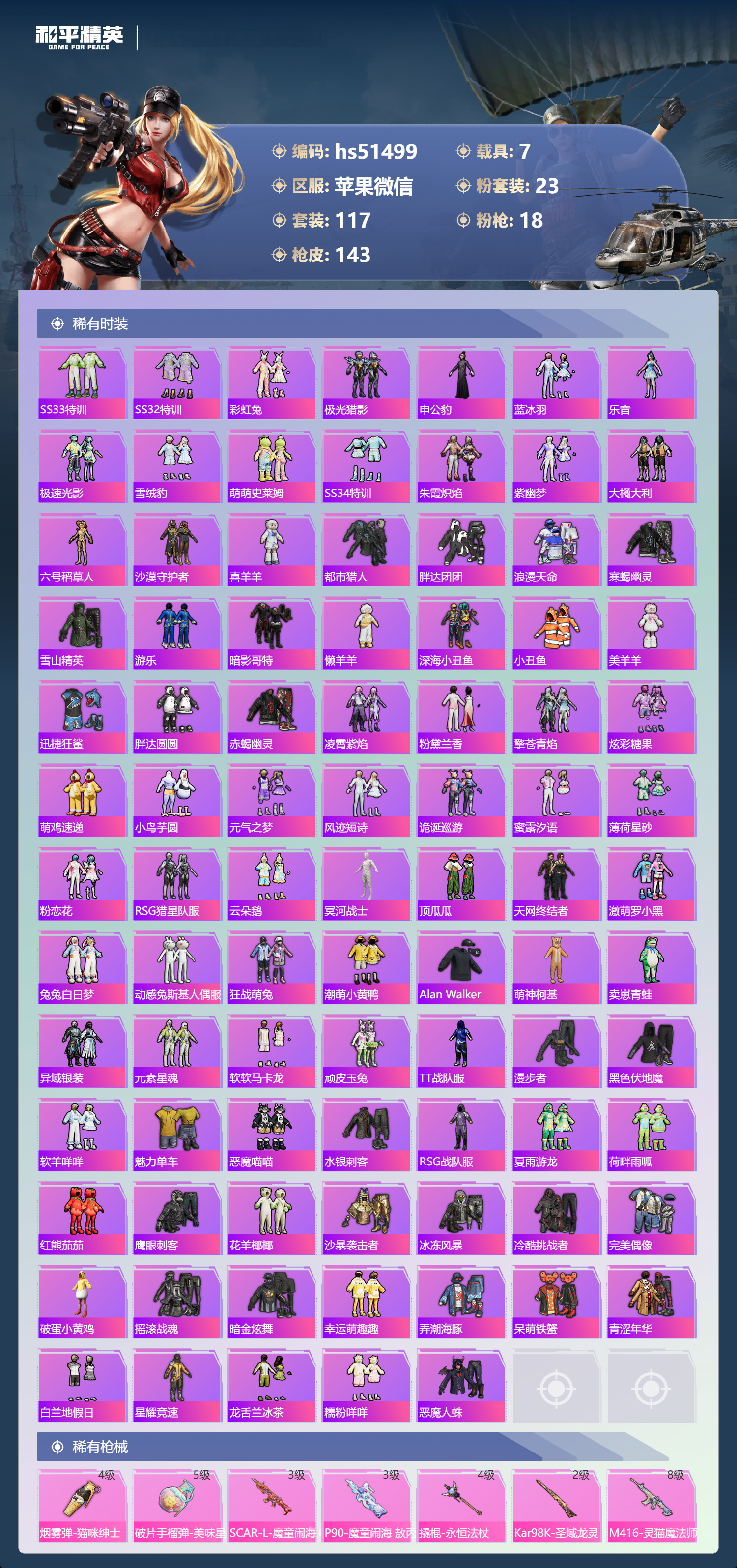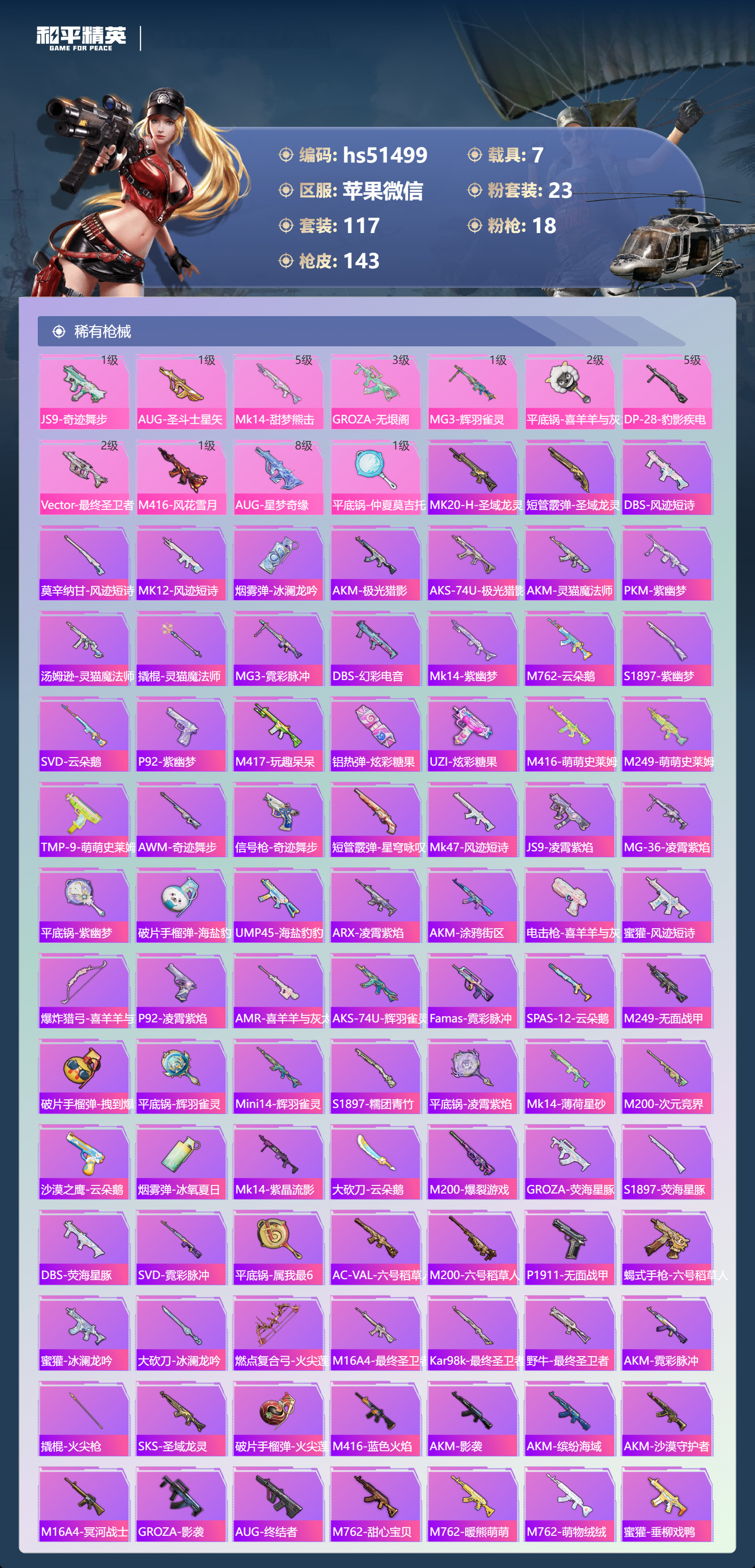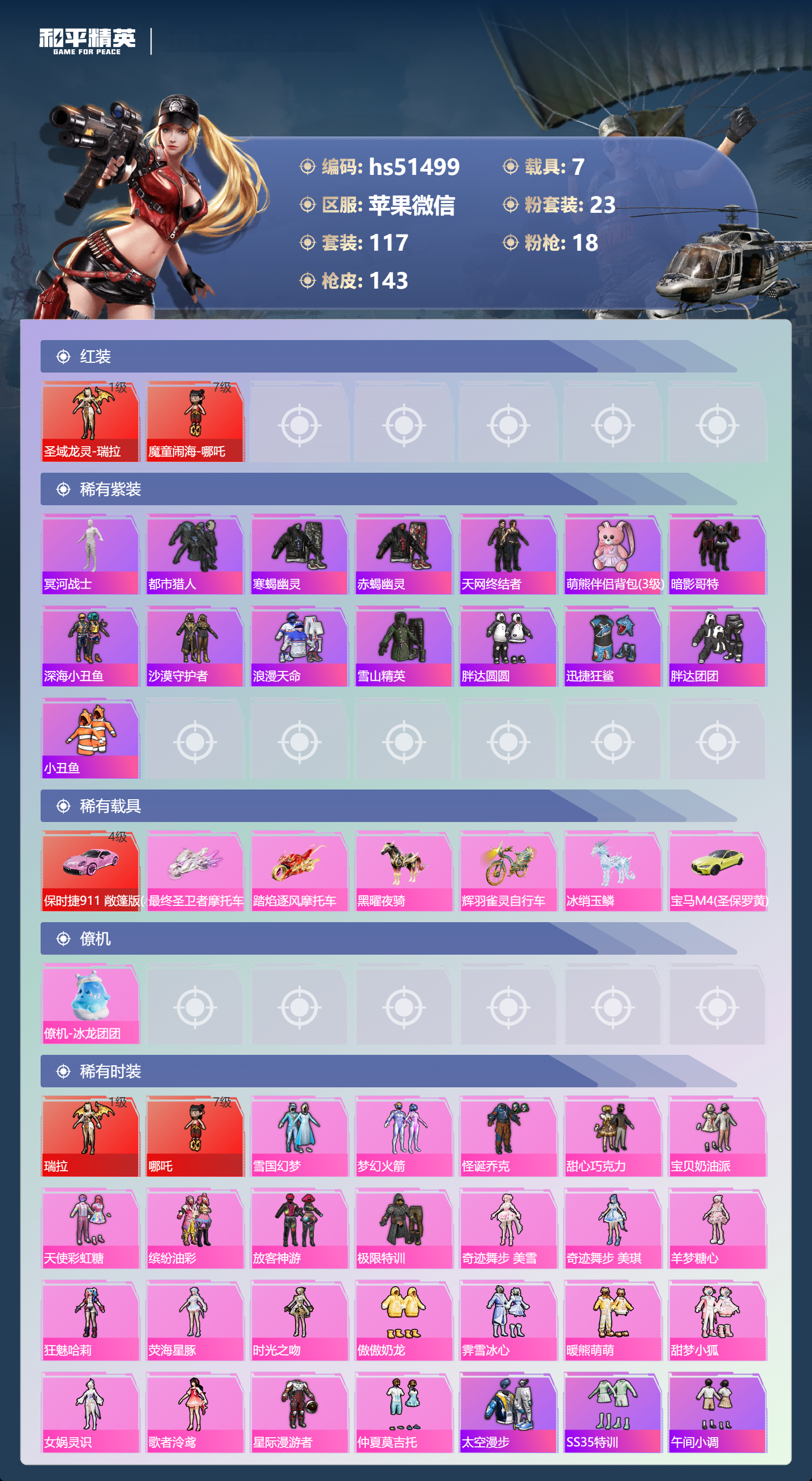 2279932苹果微信-4王牌印记-2红装-23粉装-18特效呛-7载具-98100热力值-117套装-143呛皮-3卓越印记-1传奇印记 【2红装】魔童闹海-哪吒/7级圣域龙灵-瑞拉/1级 【23粉装】套装-宝贝奶油派套装-傲傲奶龙套装-雪国幻梦套装-暖熊萌萌套装-梦幻火箭角色-羊梦糖心套装-怪诞乔克角色-奇迹舞步 美雪套装-极限特训角色-狂魅哈莉套装-仲夏莫吉托